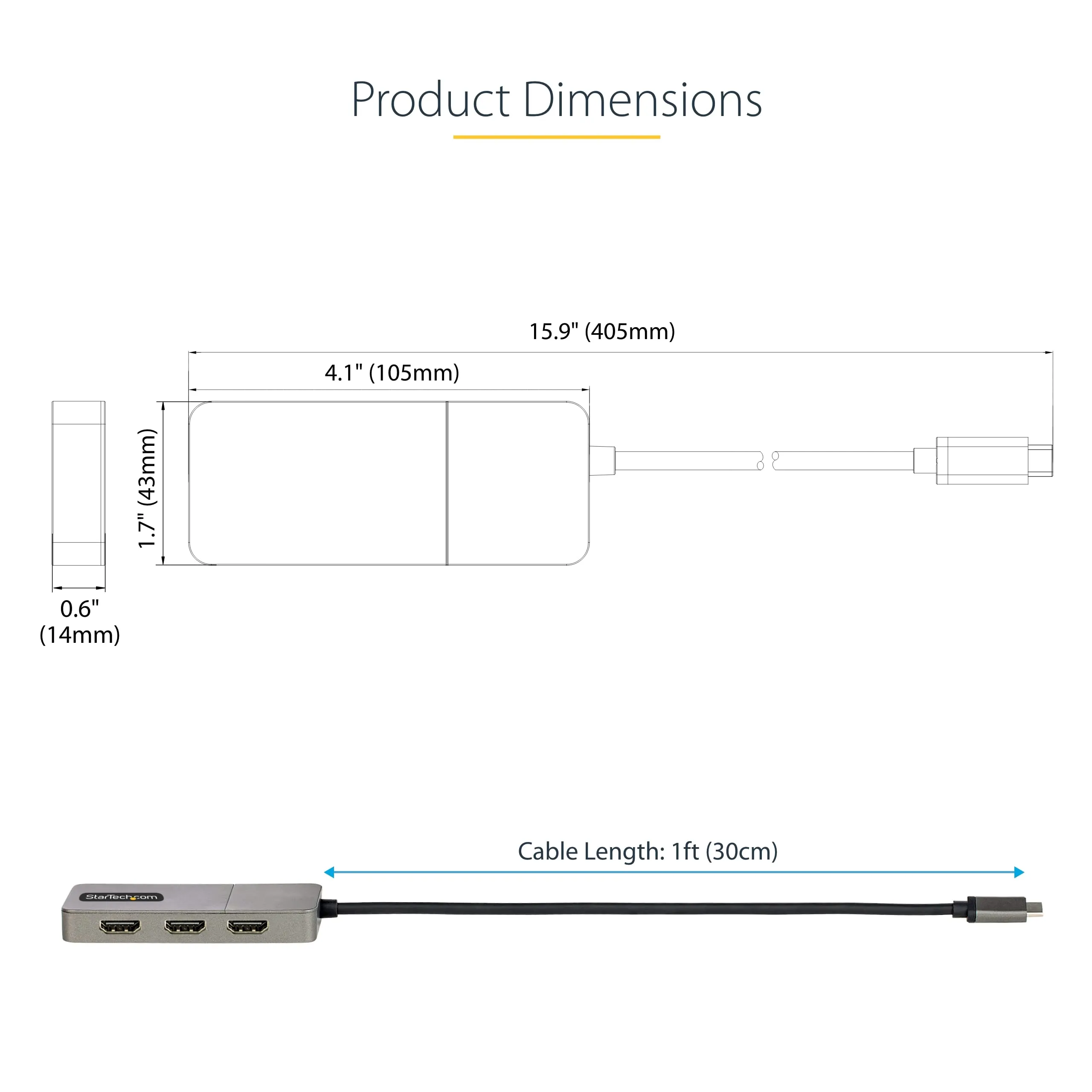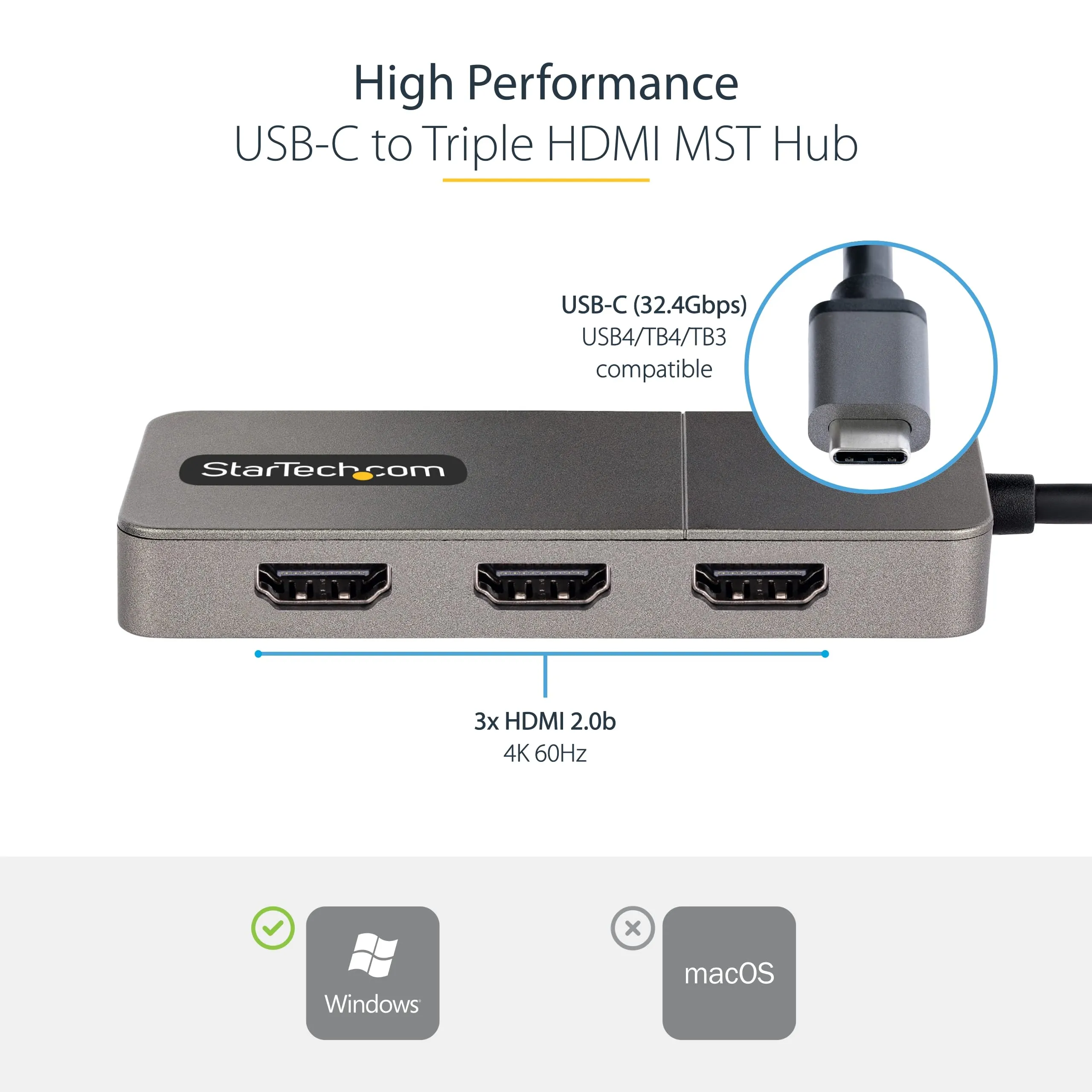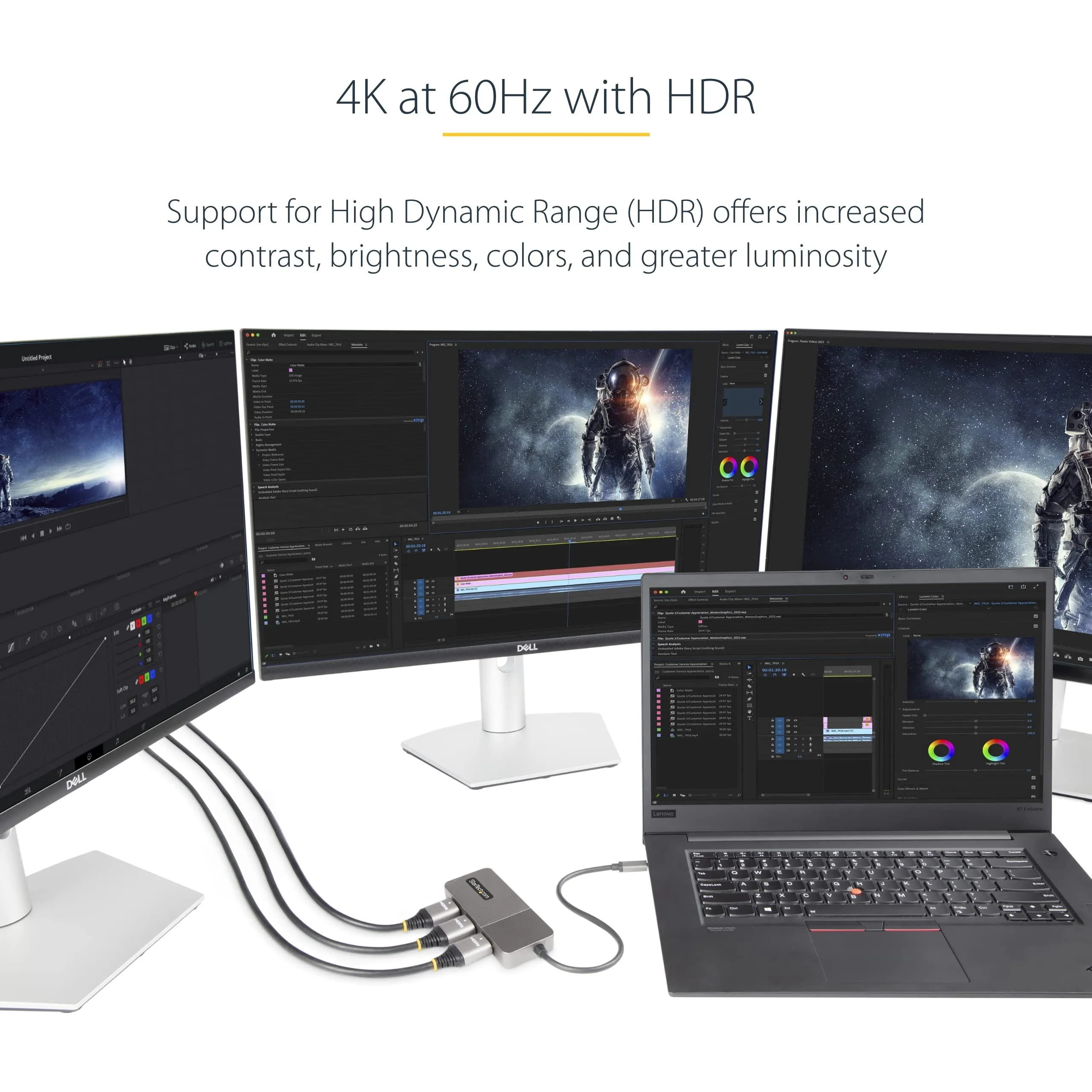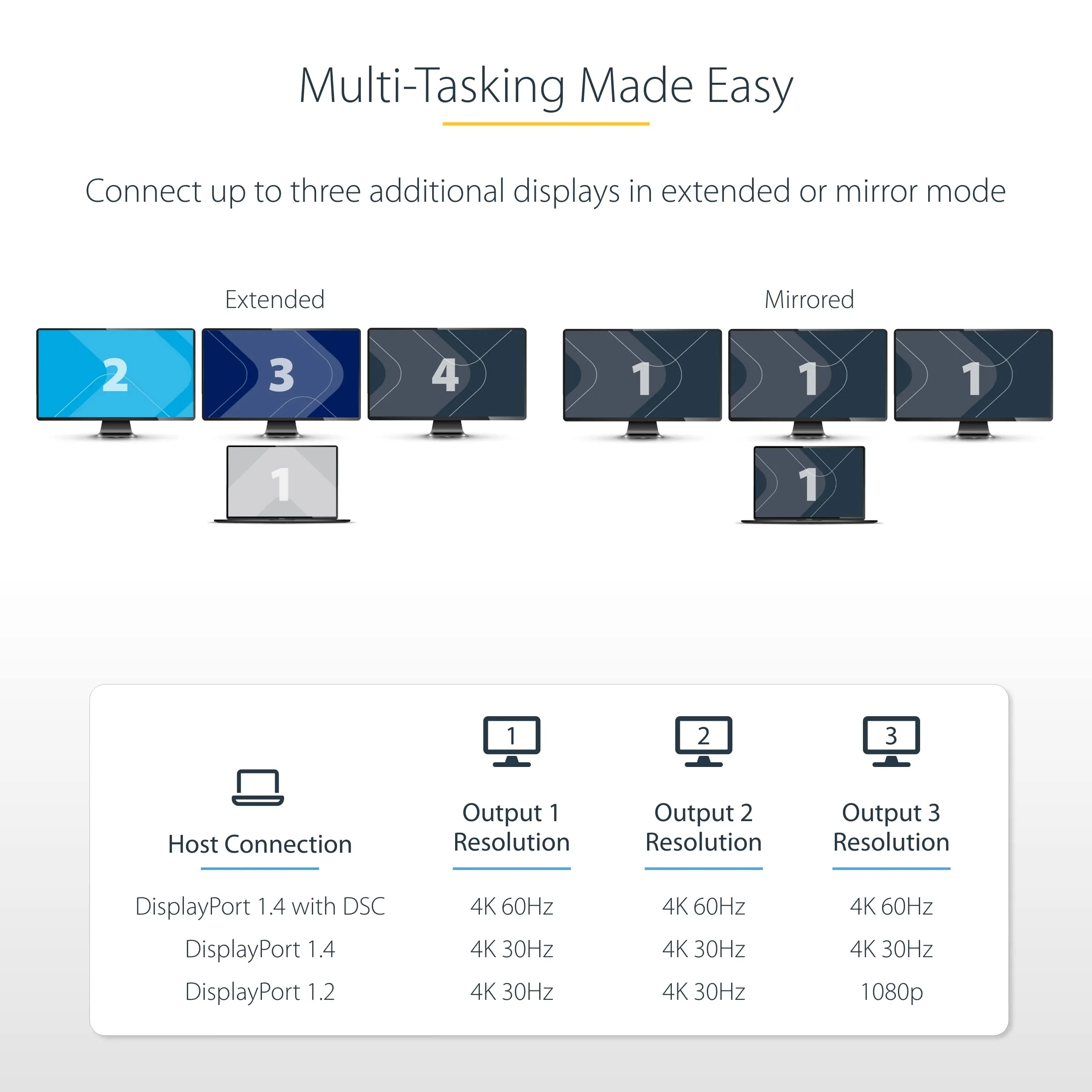 The Triple HDMI USB-C MST Hub enables you to connect up to three 4K 60Hz displays using a single USB-C DisplayPort 1.4 host. It utilizes DSC technology to provide stunning visuals and can be used with a variety of devices.