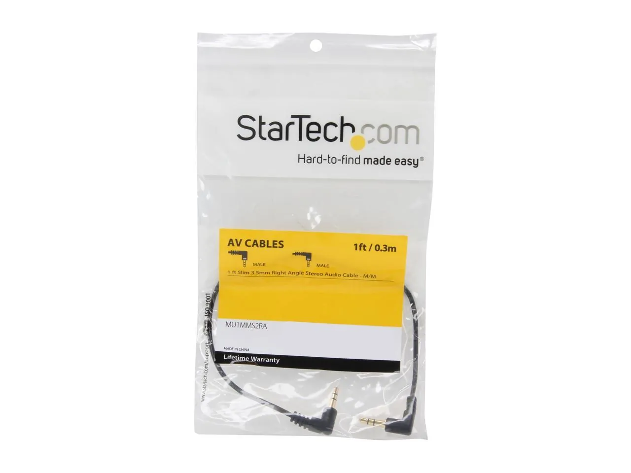 The StarTech Slim 3.5mm Right Angle Stereo Audio Cable allows you to connect audio devices while saving space and avoiding cable strain. This male-to-male cable features a right angle connector, perfect for tight spaces and a more discreet setup. Whether you're connecting a smartphone, tablet, or laptop to speakers or audio receivers, this cable delivers reliable sound quality.