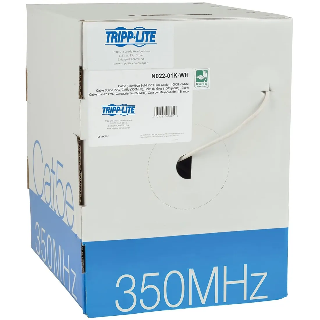 General InformationThe N022-01K-WH Cat5e 350 MHz Bulk Solid-Core PVC Cable is premium cabling designed for Cat5/5e premise applications, such as connecting an Ethernet wall jack to a router, patch panel or switch. Designed for fast transmission and excellent signal quality, this white cable ensures peak performance through your LAN (local area network). Manufactured from 24 AWG copper wire, the four-pair solid UTP N022-01K-WH delivers speeds up to 350 MHz/1 Gbps. Protected by a CMR-rated PVC jacket, this cable is ideal for all non-plenum horizontal wiring applications, including 10/100/1000 Base-T Ethernet, 100 Mbps TPDDI, 155 Mbps ATM, ISDN, voice and Token Ring Type 3 applications. The N022-01K-WH meets most current industry standards, including IEEE 802.3ab, IEEE 802.5, ANSI/EIA/TIA 568, ISO/IEC 11801 and ETL (category 5e, draft 11).Technical InformationCable Type: Category 5eCable Length: 1000 ftConnector on First End: Bare WireConnector on Second End: Bare WireConductor: CopperJacket Type: CMRDevice Supported: Network DeviceDevice Supported: Patch PanelDevice Supported: SwitchDevice Supported: RouterAmerican Wire Gauge: 24 AWGPhysical CharacteristicsColor: WhiteMaterial: Polyvinyl Chloride (PVC) - JacketMiscellaneousCertifications & Standards: IEEE 802.3abIEEE 802.5ANSI/EIA/TIA 568ETL (category 5e draft 11)Environmentally Friendly: YesEnvironmental Certification: RoHSWarrantyLimited Warranty: Lifetime
