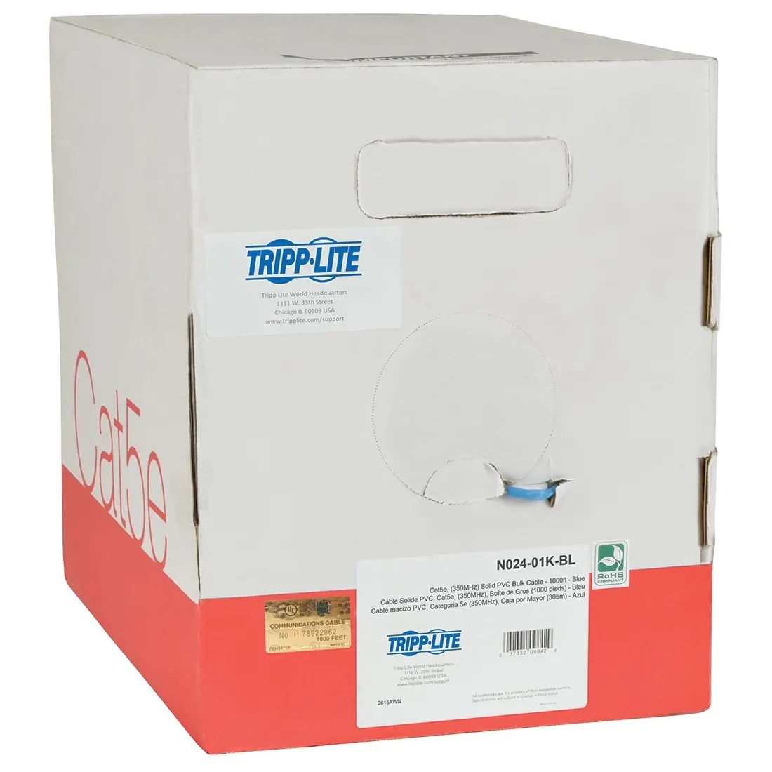 General InformationThe N024-01K-BL Cat5e 350 MHz Bulk Solid-Core Plenum-Rated PVC Cable is premium cabling designed for Cat5/5e premise applications in air ducts and drop ceilings, such as connecting an Ethernet wall jack to a router, patch panel or switch. Designed for fast transmission and excellent signal quality, this blue cable ensures peak performance through your LAN (local area network). Manufactured from 24 AWG copper wire, the four-pair solid UTP N024-01K-BL delivers speeds up to 350 MHz/1 Gbps. Protected by a plenum-rated PVC jacket, this cable is ideal for all horizontal wiring applications, including 10/100/1000 Base-T Ethernet, 100 Mbps TPDDI, 155 Mbps ATM, ISDN, voice and Token Ring Type 3 applications. The N024-01K-BL meets most current industry standards, including IEEE 802.3ab, IEEE 802.5, ANSI/EIA/TIA 568, ISO/IEC 11801 and ETL (category 5e, draft 11).Technical InformationCable Type: Category 5eCable Length: 1000 ftConnector on First End: 1 x Bare WireConnector on Second End: 1 x Bare WireDevice Supported: Network DeviceDevice Supported: Patch PanelDevice Supported: SwitchDevice Supported: RouterAmerican Wire Gauge: 24 AWGData Transfer Rate: 128 MB/sPhysical CharacteristicsColor: BlueMiscellaneousEnvironmentally Friendly: YesEnvironmental Certification: RoHSWarrantyLimited Warranty: Lifetime