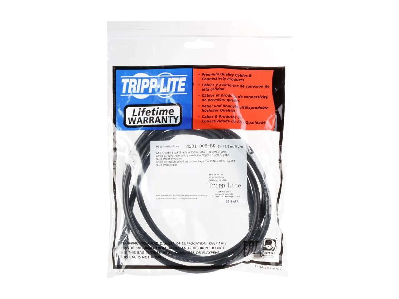 Tripp Lite 5ft Cat6 Gigabit Snagless Molded Patch Cable RJ45 M-M Black 5' - 5ft - 1 x RJ-45 Male - 1 x RJ-45 Male - Black