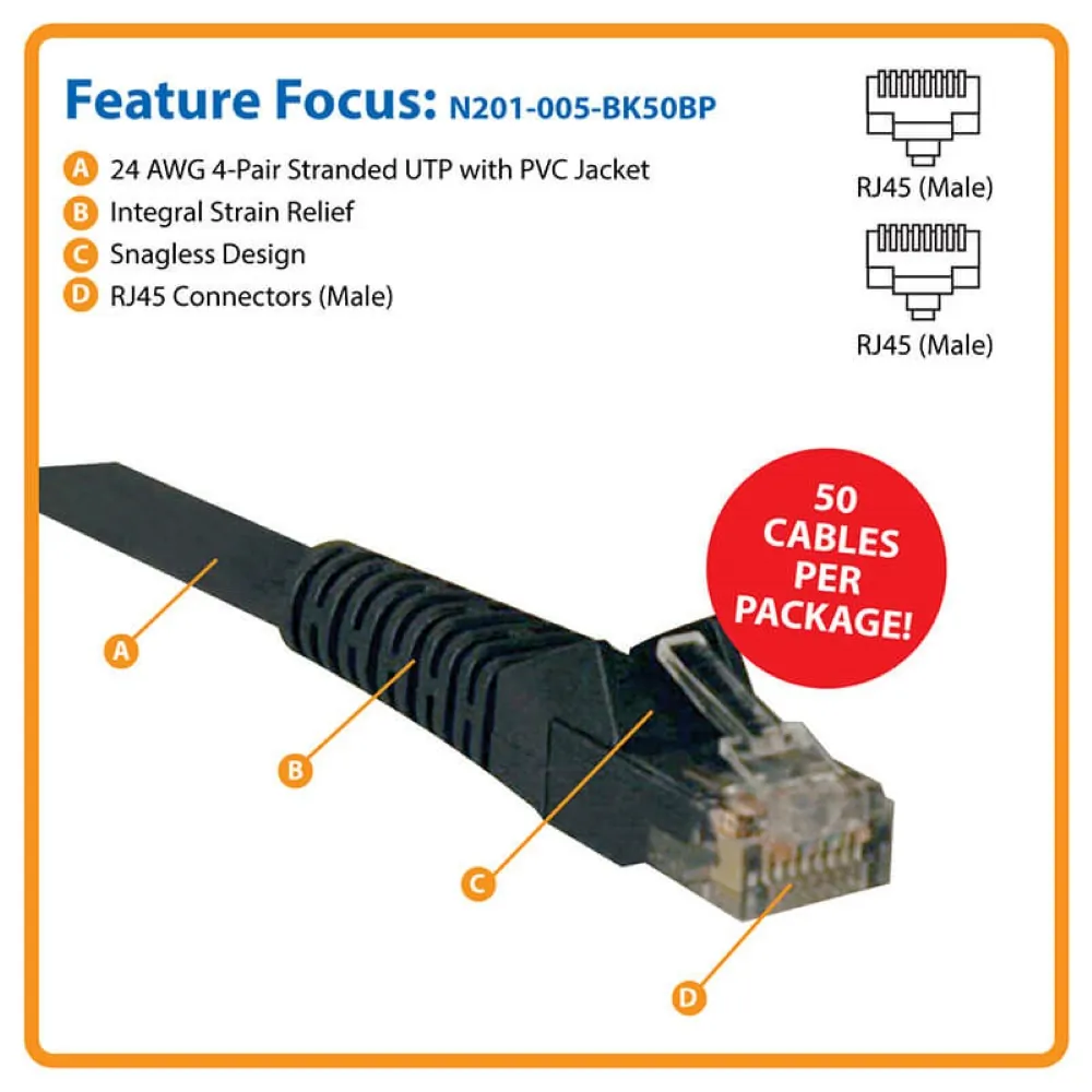 N201-005-BK50BP Cat6 Gigabit Snagless Molded Patch Cables ensure ultra-fast performance throughout your Cat5/5e/6 network application. They connect high-speed network components like computers, printers, video game systems, Blu-ray players, copy machines, routers and modems in a home or office Cat5/5e/6 application. This bulk pack includes 50 five-foot black Cat6 patch cables. Each is designed for 1000Base-T (1 Gbps Ethernet), 10/100Base-T (Ethernet), 100 Mbps TPDDI, 155 Mbps ATM, ISDN, voice and Token Ring Type 3 applications. Manufactured from 24 AWG 4-pair stranded UTP with a staggered-pin plug design, each cable provides high-speed connections up to one Gbps and flawless signal delivery while keeping near-end crosstalk levels to a minimum. Featuring a PVC jacket, these cables are constructed of top-quality materials for long life and durability. Copper contacts are gold-plated to ensure an accurate signal transfer. Molded integral strain relief and a snagless design that protects the locking tabs on the connectors from being damaged or snapped off during installation guarantee a secure connection. Meets most current industry standards, including IEEE 802.3ab, IEEE 802.5, ANSI/EIA/TIA 568, ISO/IEC 11801 and ETL (category 6 draft 11).