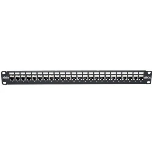 General InformationThe N254-024-6A 24-Port 1U Rack-Mount Cat6a Feedthrough Patch Panel meets or exceeds Cat6a specifications and works with USOC, T568A and T568B wiring to comply with industry standards. Fully rated for 10 Gbps Ethernet data transfer speeds, this low-profile patch panel manages and organizes the cabling in your high-density network. No 110 punchdown termination is required. Just plug your Cat6a cables into the 24 RJ45 coupler jacks on both sides of the panel. The detachable cable management bar keeps patch cables neat, tidy and efficiently organized on the back of the panel. Ports are clearly numbered and labeled to help you identify connections. Mounts easily into 1U of an EIA-standard 19-inch rack. Grounding wire included. Compliant with the Federal Trade Agreements Act (TAA) for GSA Schedule purchases.Interfaces/PortsTotal Number of Ports:24Number of Network (RJ-45) Ports:24Physical CharacteristicsForm Factor:Rack-mountableCompatible Rack Unit:1UCompatible Rack Width:19"MiscellaneousPackage Contents: 24-Port 1U Rack-Mount Cat6a Feedthrough Patch Panel, RJ45 Ethernet Detachable Cable Management Bar Grounding Wire Green Compliant:YesGreen Compliance Certificate/Authority:RoHS