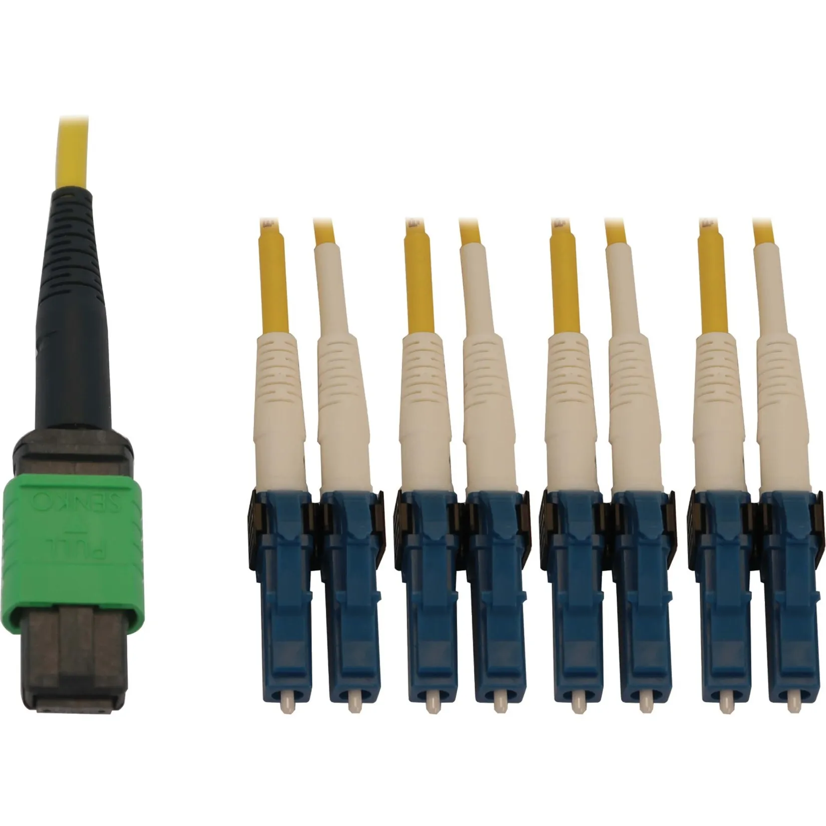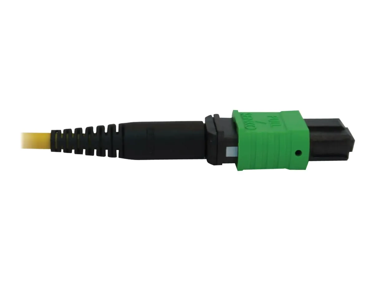 Connect your network devices with the TRIPP LITE Fiber Patch Cable, featuring a 12-Fiber MPO-APC connector on one end and four LC/UPC connectors on the other. This high-performance single-mode fiber cable is designed for optimal data transmission in data centers and high-speed networks.