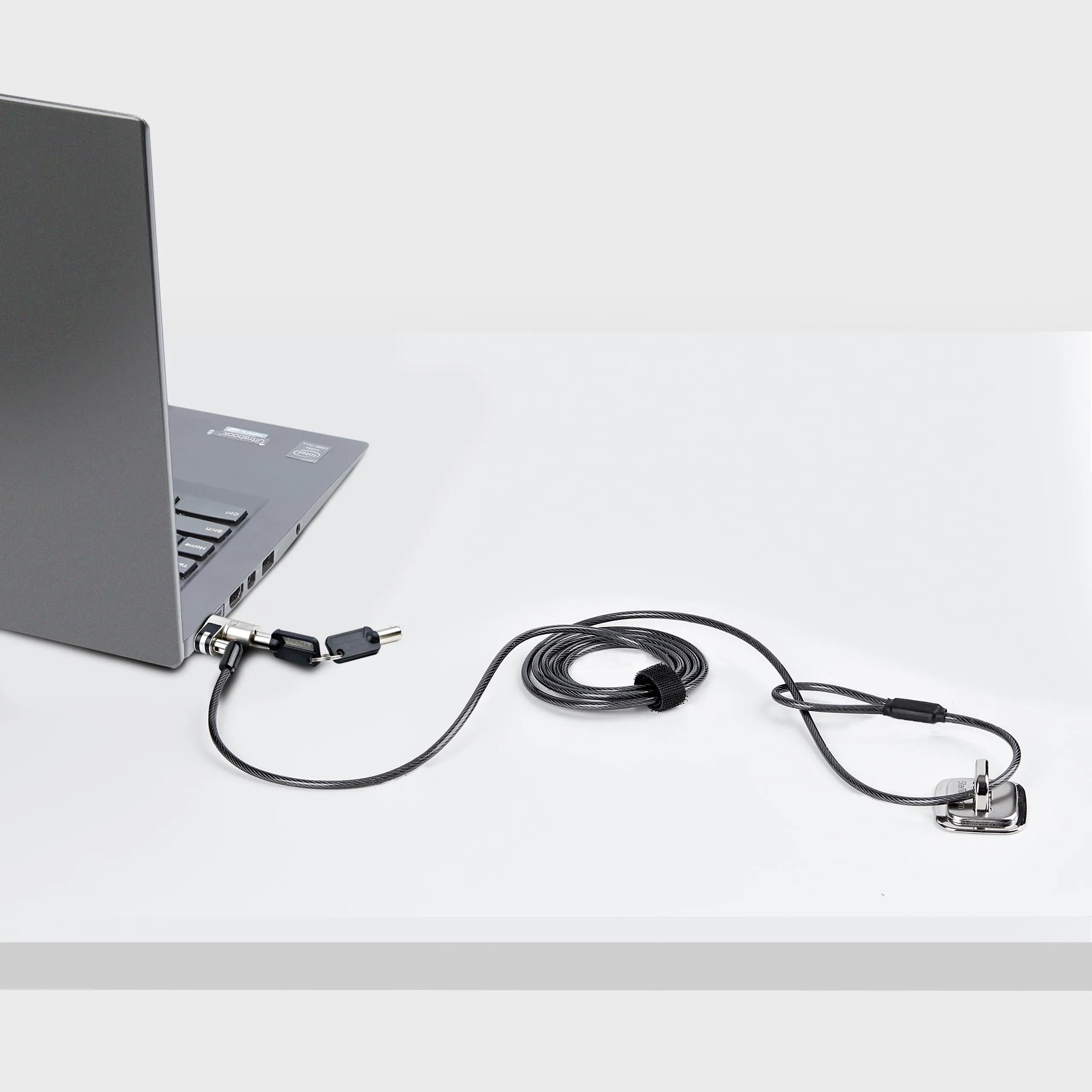 Nano slot laptop lock 6ft; Anti-theft locking system; Body features zinc-alloy plating; Compact design for ultra-slim computers; Includes hook-and-loop strap for storage - Off-center lock tip allows the laptop to lay flat; Lock head rotates 360 and 90 pivot point - Laptop cable lock with cut-resistant steel wire (4.4mm thick) includes two zinc alloy keys; Laptop locks to grommet hole/table leg - Keyed lock fits ultra-thin notebooks/tablets; Security lock for tradeshows/POS/kiosks.