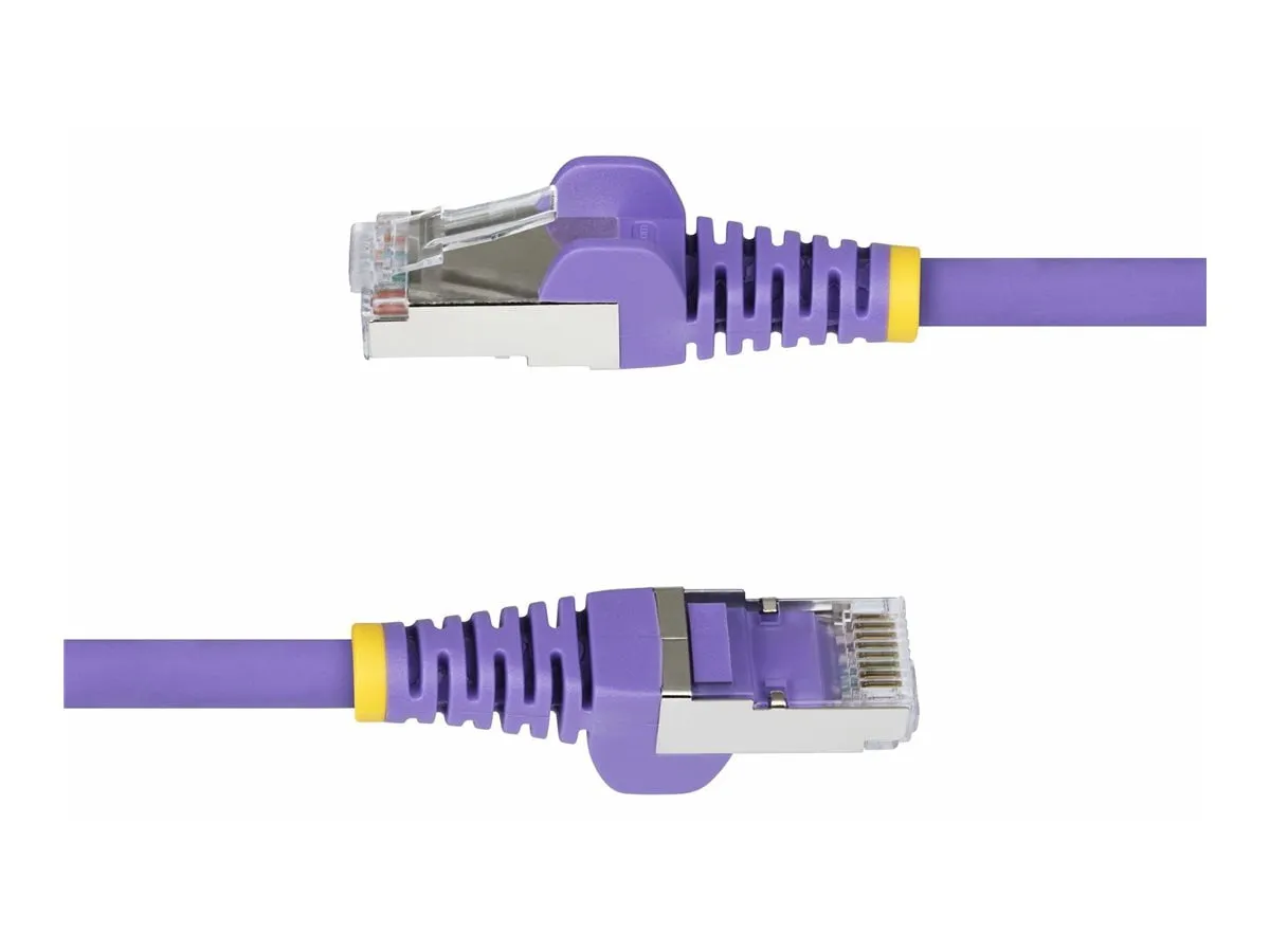 Snagless S/FTP Cat6a cable is optimized for 10G networks; Supports up to 100W PoE; Ideal for 10GBASE-T switches/PoE devices such as IP cameras/Access Points - 500MHz range enhances signal reliability; Low Near-End Crosstalk (NEXT) and Return Loss (RL) - Gold-plated connectors; 27AWG pure bare copper w/braided shield; Low Smoke Zero Halogen (LSZH) jacket is safe for enclosed/poorly ventilated spaces - 10-foot; Purple; Snagless; 10Gbps; 100W PoE++; S/FTP; 0.22in O.D.; Fluke Tested/ETL Verified