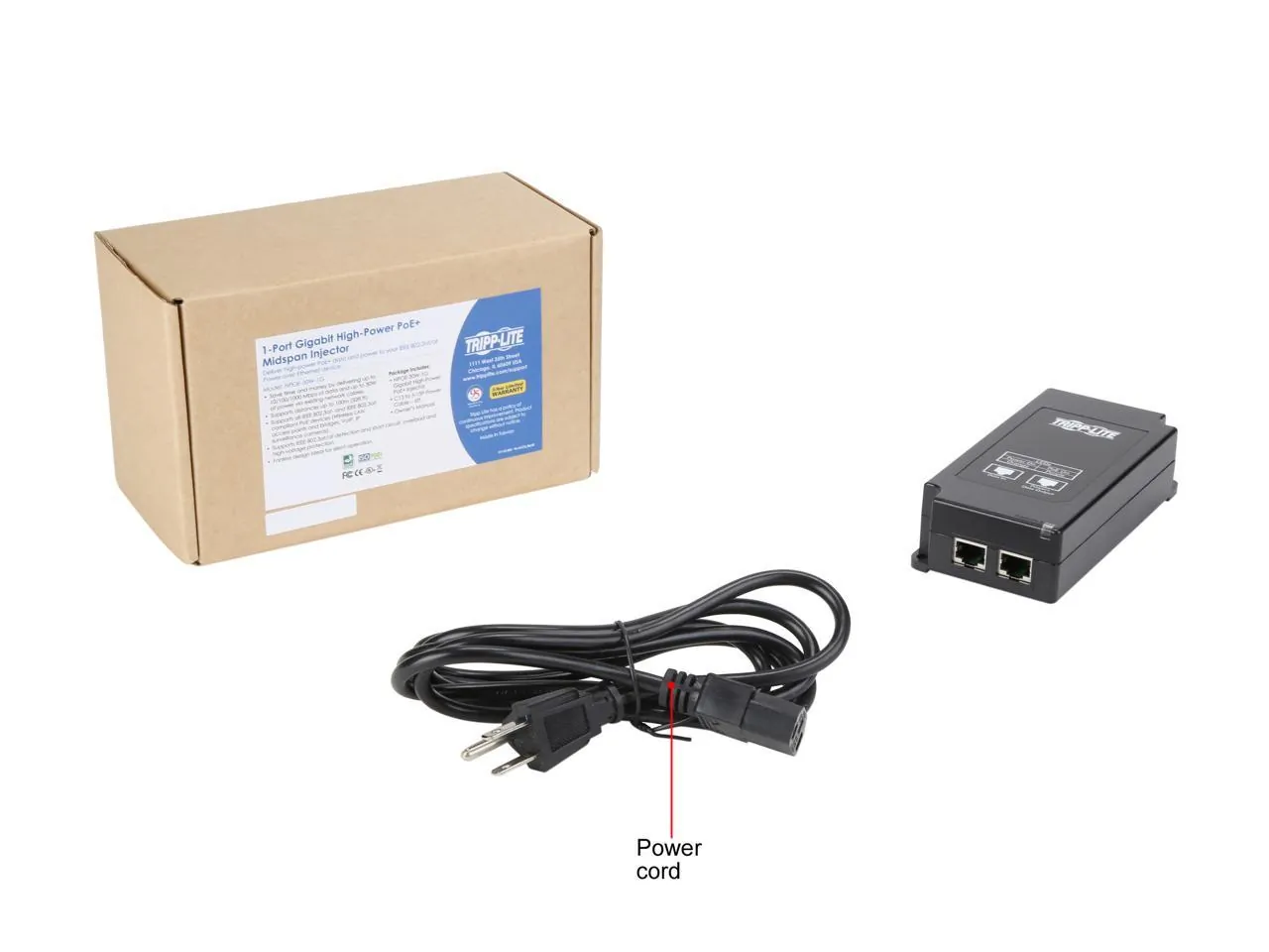 General InformationAdds PoE Devices to Your LAN Without a PoE Switch Now you can add a surveillance camera, wireless access point, VoIP phone or other PoE (Power over Ethernet) device to your home or office network, even if your network switch doesn't support PoE. Instead of making an expensive upgrade to a PoE switch, you can use this single-port PoE+ injector to send 30 watts of power, as well as Gigabit Ethernet data, through your existing Cat5e/6/6a cabling. Saves You Time and Money on Unnecessary Equipment Updates This compact PoE plus injector delivers 10/100/1000 Mbps of data and up to 30 watts of power using existing Cat5e/6/6a cables. That means, in addition to not buying a new PoE network switch, you also don't need to install new AC power lines and electrical outlets. This cost-effective midspan injector sends DC power and Ethernet data through your Ethernet cable, cutting down on cable clutter, equipment costs and installation time and labor. Expand Your Wireless Network Up to 328 ft. The NPOE-30W-1G delivers both power and data to any IEEE 802.3at (PoE+) or IEEE 802.3af (PoE) device up to 100 meters (328 feet) away. This allows you to install a device in a building lobby, on a ceiling, inside a warehouse or anywhere else an AC power outlet is unavailable. The PoE+ injector supports full-duplex 2 Gbps communication for sending and receiving data simultaneously. It also protects your device against short circuits, overloads and power surges. Simple Plug-and-Play Installation Has Your Device Connected in Minutes No configuration or software is required to add the NPOE-30W-1G to your LAN. Just connect your switch or network jack to the shielded RJ45 Data port and your PoE device to the shielded RJ45 Power + Data port using existing Cat5e/6/6a cable. Connect the unit's C14 inlet to a NEMA 5-15R outlet using the included power cord. LEDs indicate the unit is receiving power and is ready to transmit data. Designed for Installation Almost Anywhere Mounting holes are featured for installing the midspan injector on a shelf, desktop, wall or any other smooth surface with user-supplied hardware. The black plastic housing fits in the palm of your hand, so it is small enough to hide away without interfering with your workflow or dcor. The fanless design is ideal for silent operation. 3-Year Warranty and Environmentally Responsible Design The NPOE-30W-1G comes with a 3-year warranty. It's manufactured in compliance with strict RoHS specifications, reflecting Tripp Lite's commitment to environmental responsibility.Power DescriptionInput Voltage: 120 V ACInput Voltage: 230 V ACMinimum Frequency: 50 HzMaximum Frequency: 60 HzInterfaces/PortsInput Ports: EthernetOutput Ports: EthernetPhysical CharacteristicsColor: BlackForm Factor: DesktopMount Type: Surface-mountableMiscellaneousPackage Contents: NPOE-30W-1G PoE Injector Detachable C13 to NEMA 5-15P power cord, 6 ft. Owner's manual Green Initiatives Certifications & Standards: CE FCC UL IEEE Standards Supported 803.3 802.3ab 802.3af 802.3at 802.3u Environmentally Friendly: YesEnvironmental Certification: RoHSEnvironmental Certification: REACHEnvironmental Certification: WEEEWarrantyLimited Warranty: 3 Year