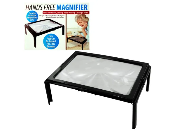Ideal for reading, sewing, model-making, knitting and more, this Hands Free Full Page Magnifier is both a stand magnifier that can be used for viewing reading materials on a flat surface, and as a hands free magnifier that can be hung around your neck for working on crafts and hobbies. It comes with a soft nylon neck strap for hands-free use while away from your desk. Includes a lightweight frame with retractable legs that hold the scratch-resistant lens. Magnifying top measures approximately 8" x 11". Comes packaged in an individual box. Box measures approximately 11.25" x 1" x 8.25".