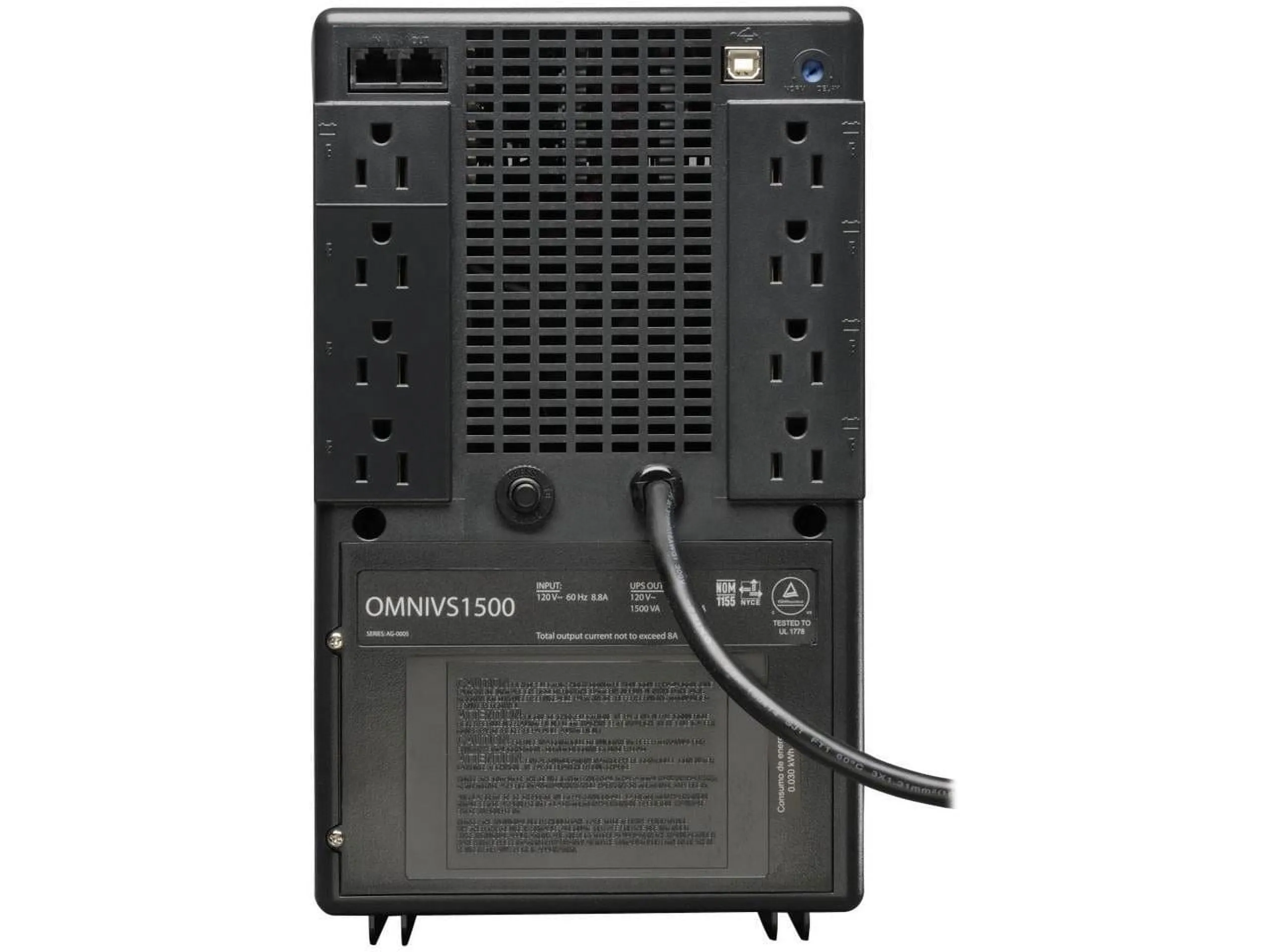 1,500-volt-ampere tower with 120-volt line-interactive UPS Corrects brownouts and overvoltages from 75 volts to 147 volts 5 UPS battery supported outlets, 3 surge-only outlets USB port and telephone/DSL/Ethernet protection with 97% line mode efficiency NEMA 5-15P input plug and 8 NEMA 5-15R outlets Includes USB and telephone cable and owner's manual with warranty information