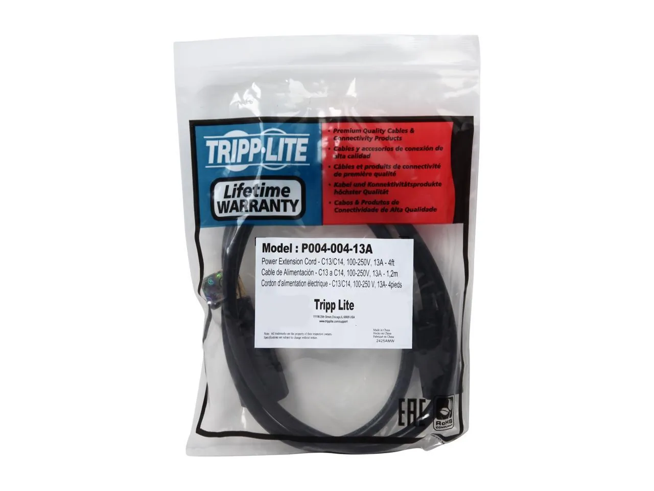 This IEC-320-C14 to IEC-320-C13 cable is designed for small data center, office workstation and other lower-amp applications. This C14 male to C13 female cord can be used to power a computer, server or monitor; attach a server or drive to a UPS system or PDU; or extend an existing connection up to 4-ft. (1.22 m). The 4-ft. (1.22 m) length helps reduce cable clutter and minimize the risk of tripping.