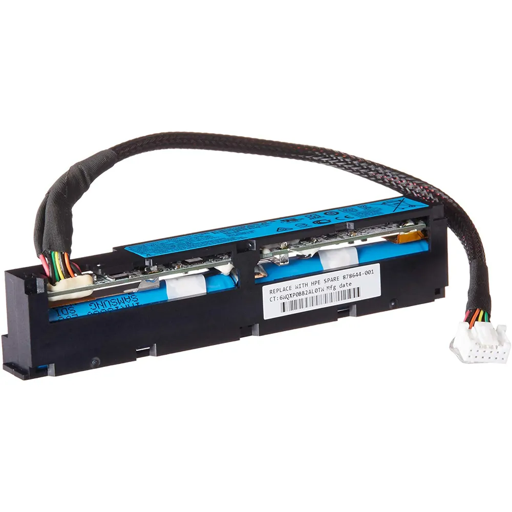 The HPE Smart storage battery is a lithium-ion, low-halogen centralized backup source and is required to backup the write cache content onto flash memory on the HPE Smart Array Gen10 and Gen9 performance RAID (P-class) controllers in case of an unplanned server power loss. The battery is also the backup power source for HPE NVDIMMS and allows any data in flight on the DRAM to be moved to the non-volatile NAND flash. Only one battery is required per server as it can support multiple devices.