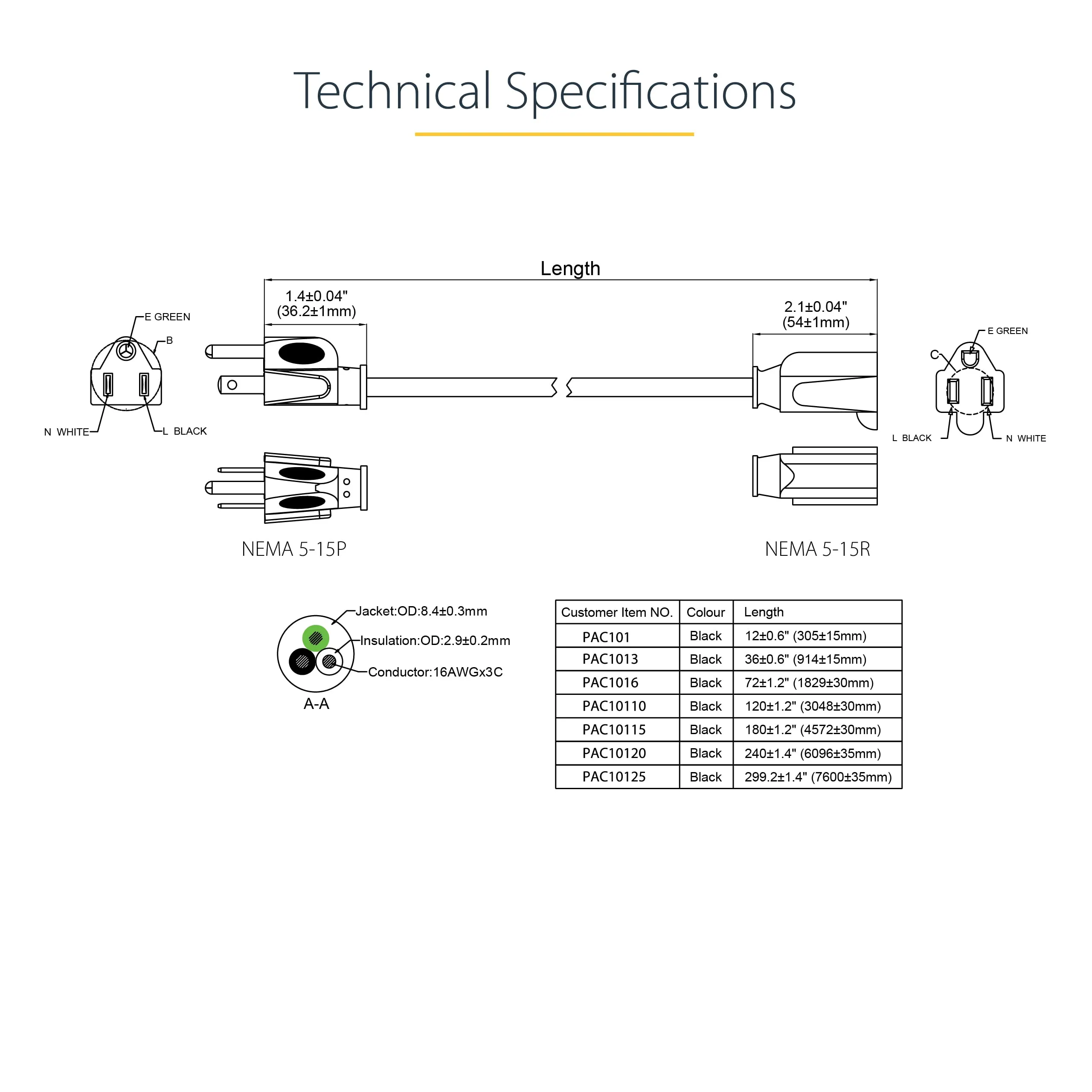 15 ft Power Cord Extension - NEMA 5-15R to NEMA 5-15P
