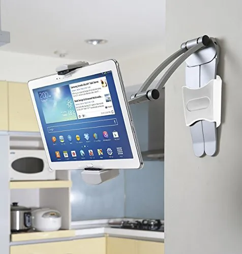? Fits 7-12 tablets including iPad Pro(R) 11 & 12.9 (2018) ;? Holder adjusts 6-8.5 wide ;? Mounts to walls or under the kitchen cabinet ;? Easily attaches or removes from mount base to transform into a tabletop stand ;? Hassle-free, quick-release buttons make it easy to remove & access device ;? Easily rotates device to any orientation with 360deg rotating holder ;? Folds compact for easy storage & compatibility ;? Lightweight design ;? Includes 1 aluminum stand, 1 adjustable tablet stand, 2 mounting bases & 2 sets of hardware;