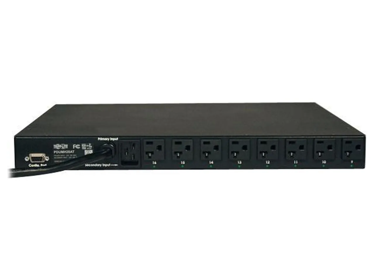 Tripp Lite's 120V 20A metered PDU system with Automatic Transfer Switching (ATS) is a 16 outlet PDU with a digital display to indicate total PDU power consumption in amps. Outlets are sequentially turned-on at 250 millisecond intervals when the PDU is first energized from an unpowered state to prevent inrush-related equipment interaction on startup. Supports 1U rackmount installation in a 2 or 4 post rack. Included are 16 NEMA 5-15/20R outlets, and two 12 ft. L5-20P input power cords. Each cord is compatible with both NEMA 5-20R and L5-20R receptacles.