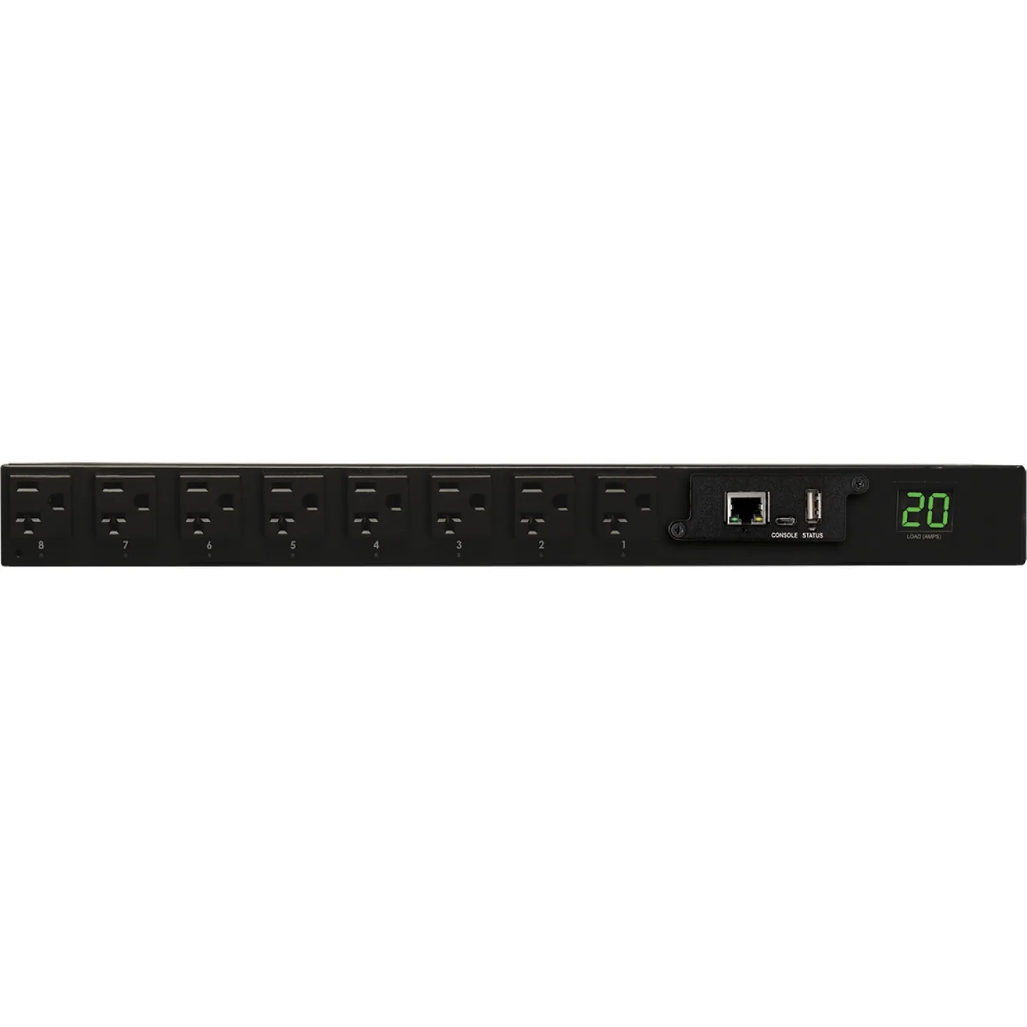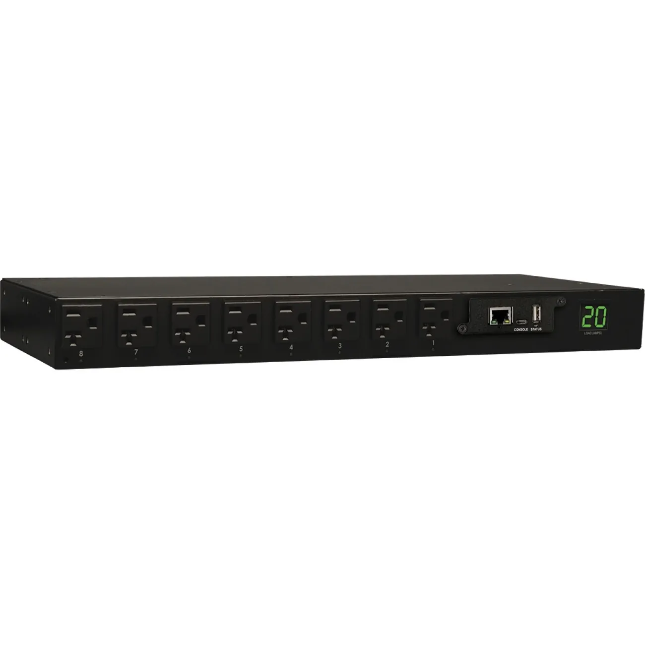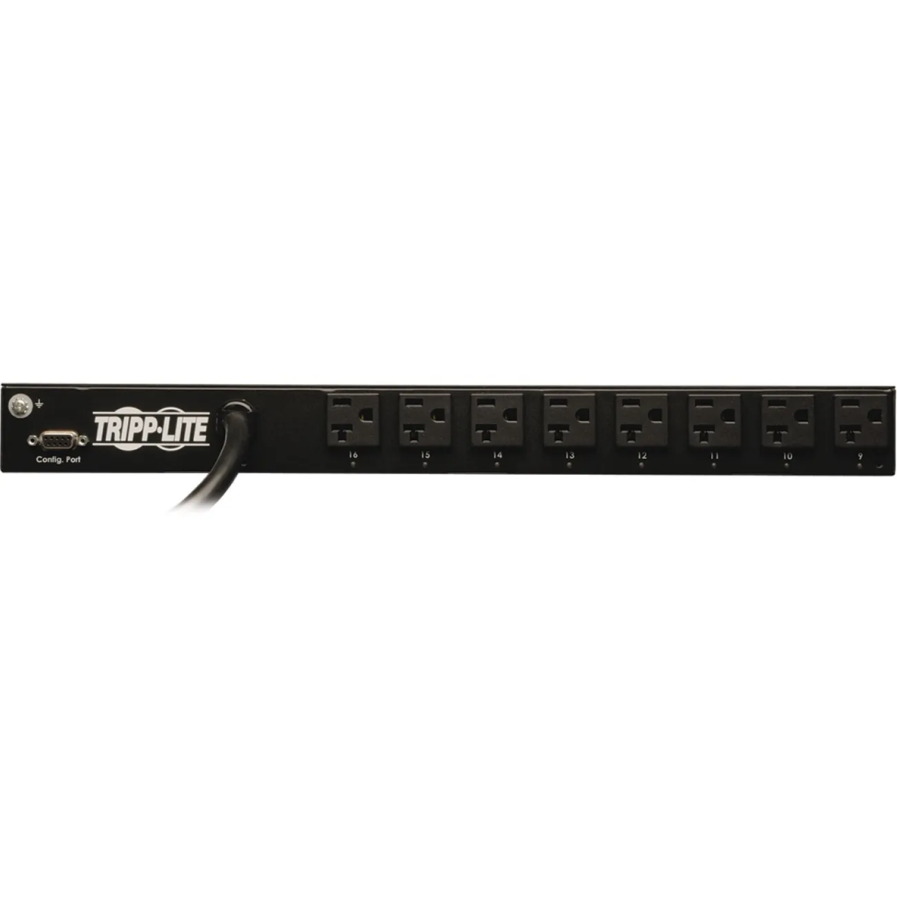 Tripp Lite PDUMH20NET Switched Metered 16-Outlet PDU:Supports 20A maximum capacity at 120V (agency de-rated to 16 amps)Includes attached L5-20P input cordset with 5-20P adapter and sixteen 5-15/20R switched outlets (8 front/8 rear)Visual and remote current monitoring tracks the output current16-outlet network PDU