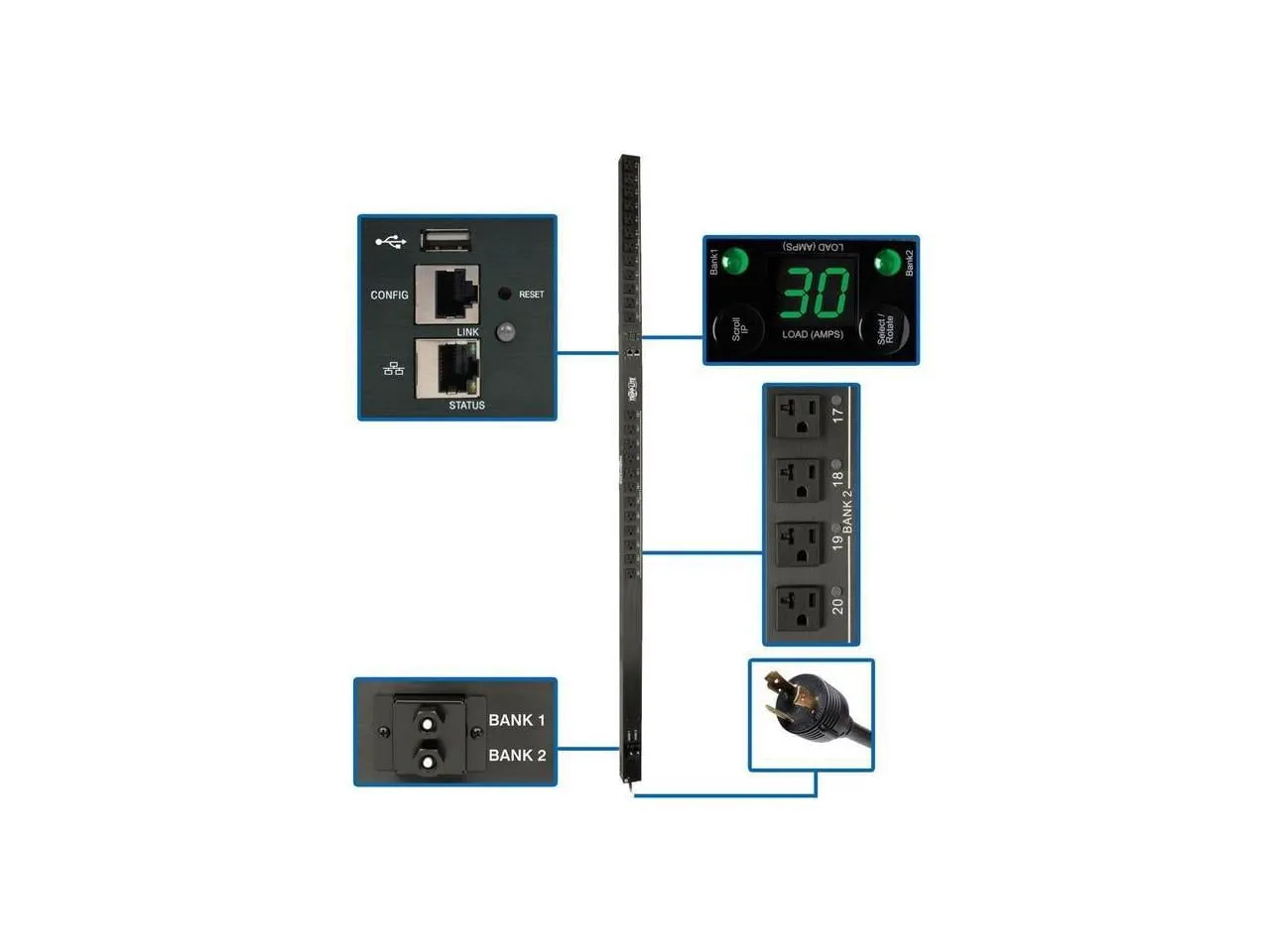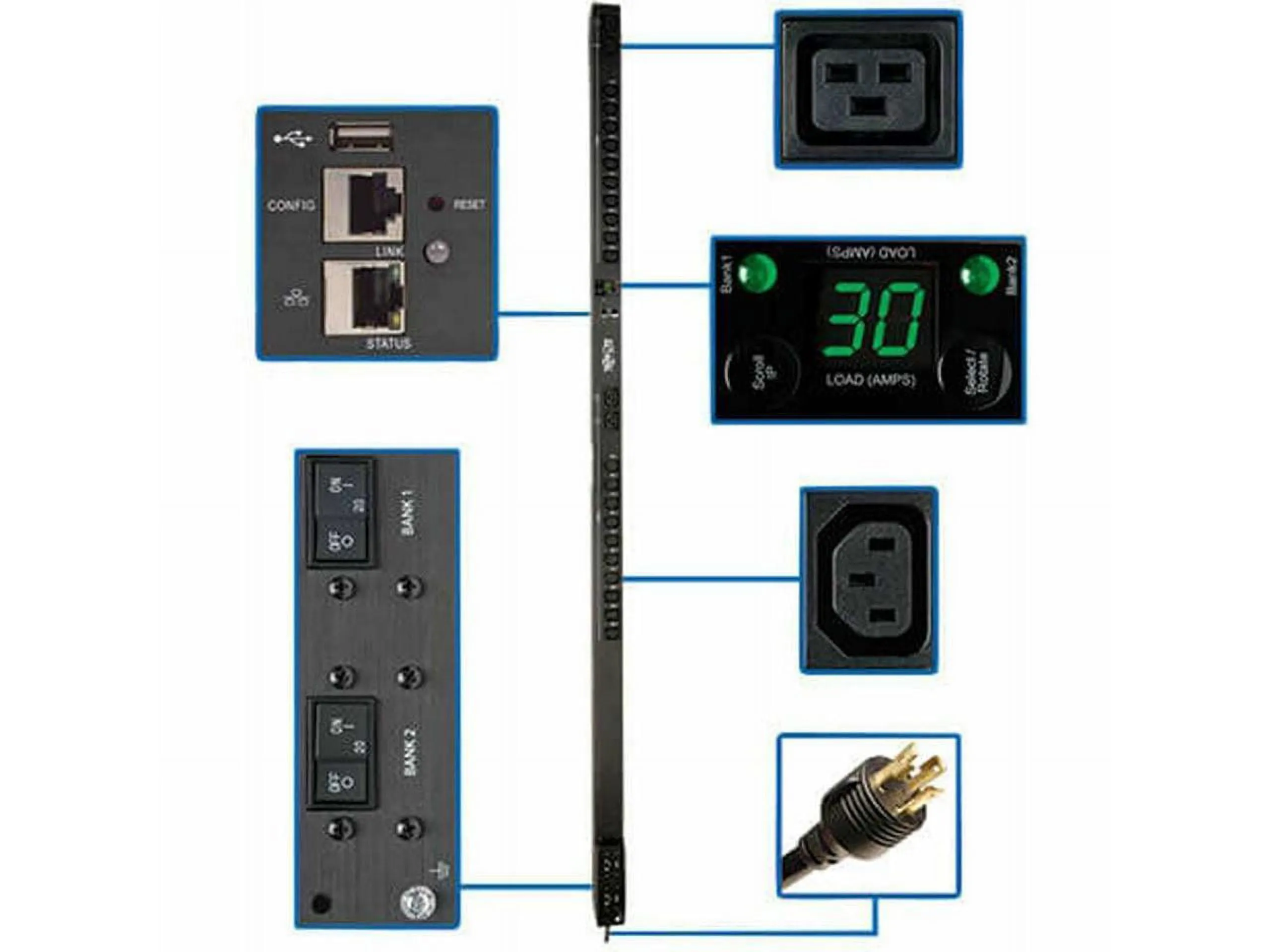 General InformationThe PDUMV30NETLX 2.9kW Single-Phase Switched PDU provides advanced network control and remote power monitoring with the ability to turn on, turn off, reboot or lock out power to each outlet. Recommended for any IT or industrial application, it features 24 switched NEMA 5-15/20R outlets with included cord retention brackets to prevent cables from becoming accidentally disconnected. A 10-foot cord with NEMA L5-30P plug connects the PDU to a compatible AC power source, generator or protected UPS.The built-in Java-free HTML5-based LX Platform network interface enables full remote access for PDU status monitoring and email notifications via secure web browser, SNMP, telnet or SSH. It supports 10/100 Mbps auto-sensing for optimum communication with an Ethernet network. Optional EnviroSense2 modules (sold separately) provide a variety of environmental monitoring capabilities. Protocols supported include HTTP, HTTPS, SMTP, SNMPv1, SNMPv2, SNMPv3, telnet, SSH, FTP, DHCP and NTP.A digital ammeter allows you to monitor each bank's load in real time to ensure it remains well below maximum capacity with no danger of overload. The vertical PDU mounts in 0U of space in EIA-standard 19-inch racks using the included toolless mounting buttons or the included rack-mounting brackets. Use the included PDUMVROTATEBRKT kit to install the unit with outlets facing the rear for better airflow or equipment access. Features Distributes Network-Grade Single-Phase Power 2.9kW 120V switched PDU Recommended for network applications requiring individual outlet control, load shedding and remote monitoring of critical network components NEMA L5-30P plug with 10 ft. cord connects to compatible AC power source Firmware upgrades support future product enhancements 24 Switched Outlets Distribute AC Power 24 NEMA 5-15/20R outlets split into 2 separately breakered load banks Individual outlets can be remotely controlled to power up, power down, reboot or lock out devices Cord retention brackets prevent cables from becoming accidentally disconnected Digital Ammeter Reports load level on each bank and total PDU output Supports IP-address self-ID Rotates 180 for easy reading at either angle Built-In LX Platform Interface Allows full remote access for power monitoring with email notifications via secure web browser, SNMP, telnet or SSH Supports 10/100 Mbps auto-sensing for communication with an Ethernet network Optional EnviroSense2 modules (sold separately) provide a variety of environmental monitoring capabilities No Java required Broad Communications Compatibility Supports HTTP, HTTPS, SMTP, SNMPv1, SNMPv2, SNMPv3, telnet, SSH, FTP, DHCP and NTP Supports automatic and manual assignment of IP address Easy 0U Installation in EIA-Standard 19 in. Racks Mounts vertically using included toolless buttons or rack-mounting brackets Included PDUMVROTATEBRKT allows mounting with rear-facing outlets TAA-Compliant Compliant with the Federal Trade Agreements Act (TAA) for GSA Schedule purchases Technical InformationPDU Type: SwitchedDesign: ModularPhase: Single PhaseInput Receptacles: NEMA L5-30POutput Receptacles: 24 x NEMA 5-15/20RProtection Type: Overload Protection