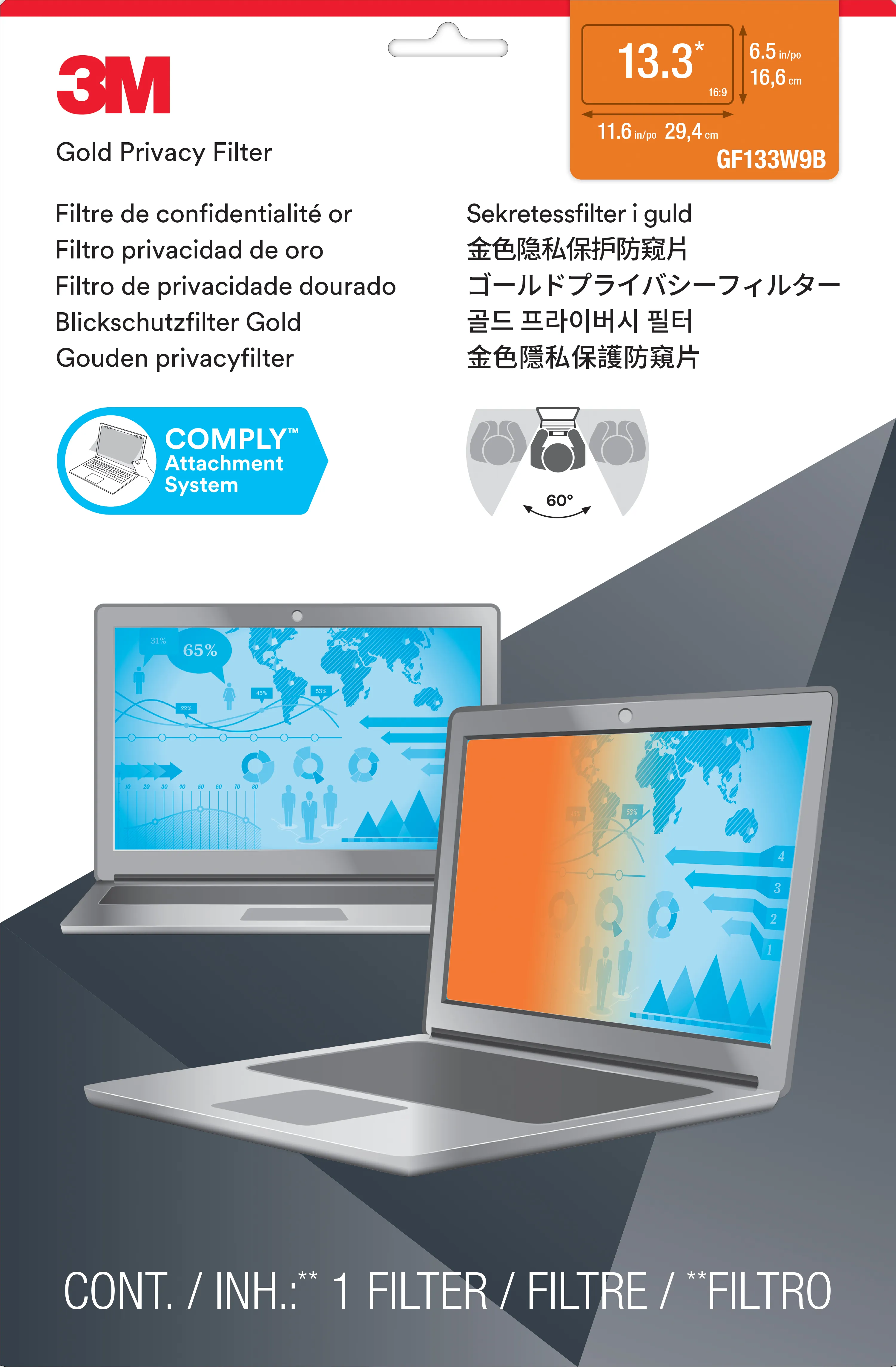 Outside the 60-degree viewing angle, the filter projects a vibrant gold shield of world-class effective privacyGold, glossy finish for incredible clarity--nearly 20% more clarity than standard 3M™ Black Privacy FiltersProprietary gold effect provides premium privacy with a glossy finishReduces 35% of blue light transmission from the displayProvides a beautiful high-contrast, high-resolution quality you expectPerfectly suited for most of today’s high-resolution laptop devices and screen typesReversible between vibrant gold and a glossy black screenDesigned to seamlessly fit within the raised bezel of your deviceEasy to attach, remove and cleanGives screens an added layer of durable protection from dust and scratches100% hand inspected for quality assurance