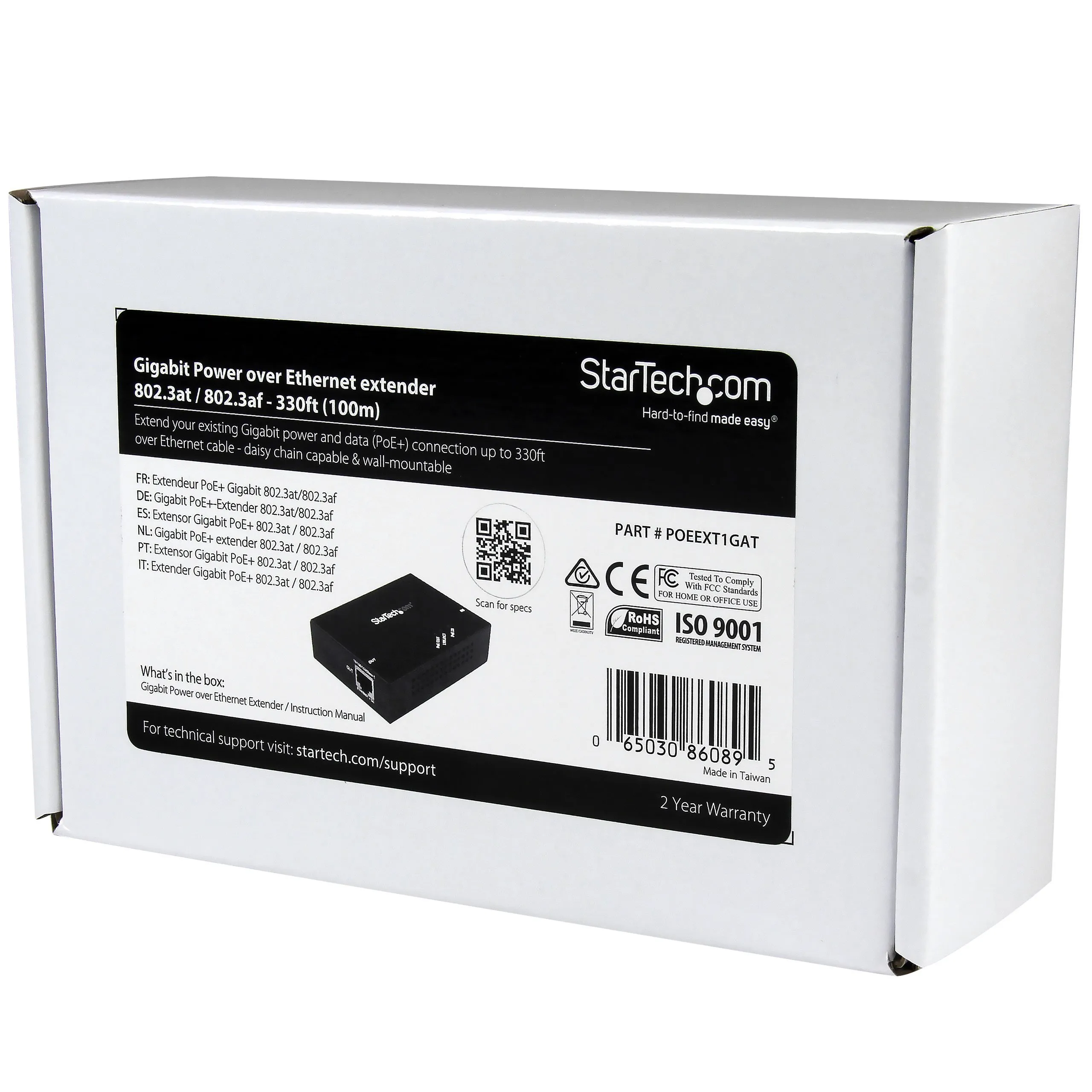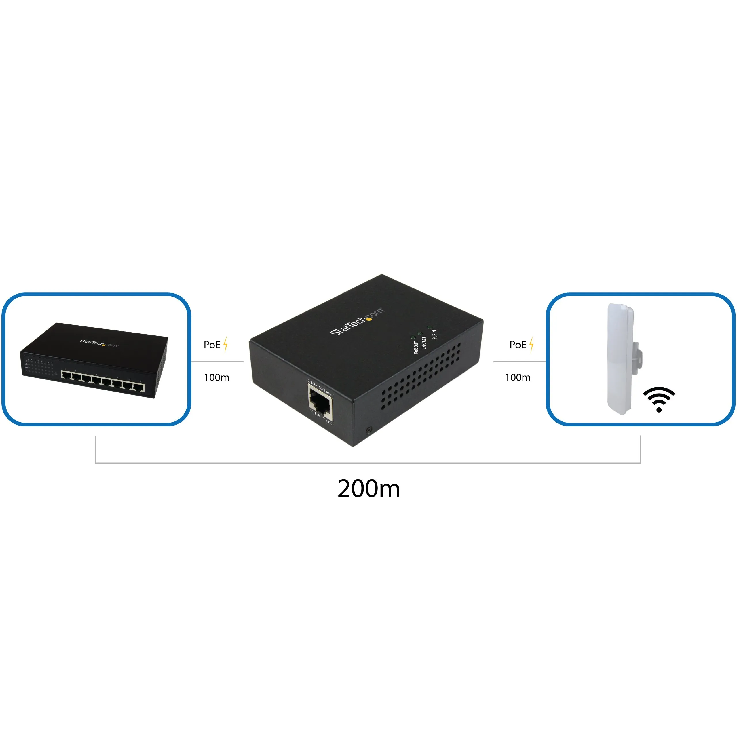 Expand your Power over Ethernet (PoE) connection range significantly with the StarTech 4-Port Gigabit PoE+ Extender. Capable of extending your connection up to 100 meters (330 feet), this extender supports daisy chaining with up to four units for an impressive maximum distance of 500 meters.