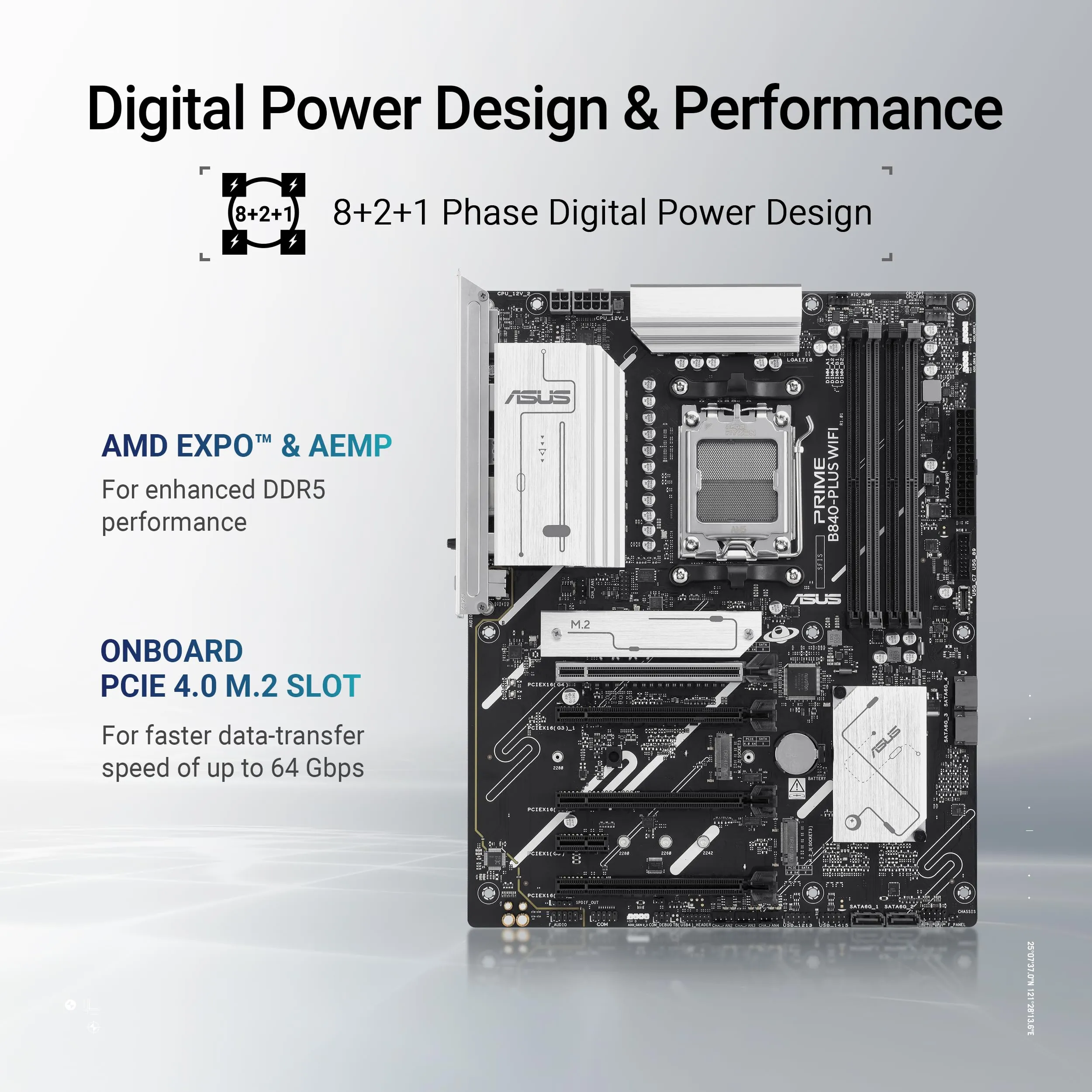 The ASUS PRIME B840-PLUS WIFI is a feature-rich ATX motherboard designed for the AMD AM5 socket, supporting the latest DDR5 memory and PCIe 4.0 technology. Ideal for building high-performance PCs, this motherboard offers robust connectivity options, efficient cooling solutions, and user-friendly BIOS features.