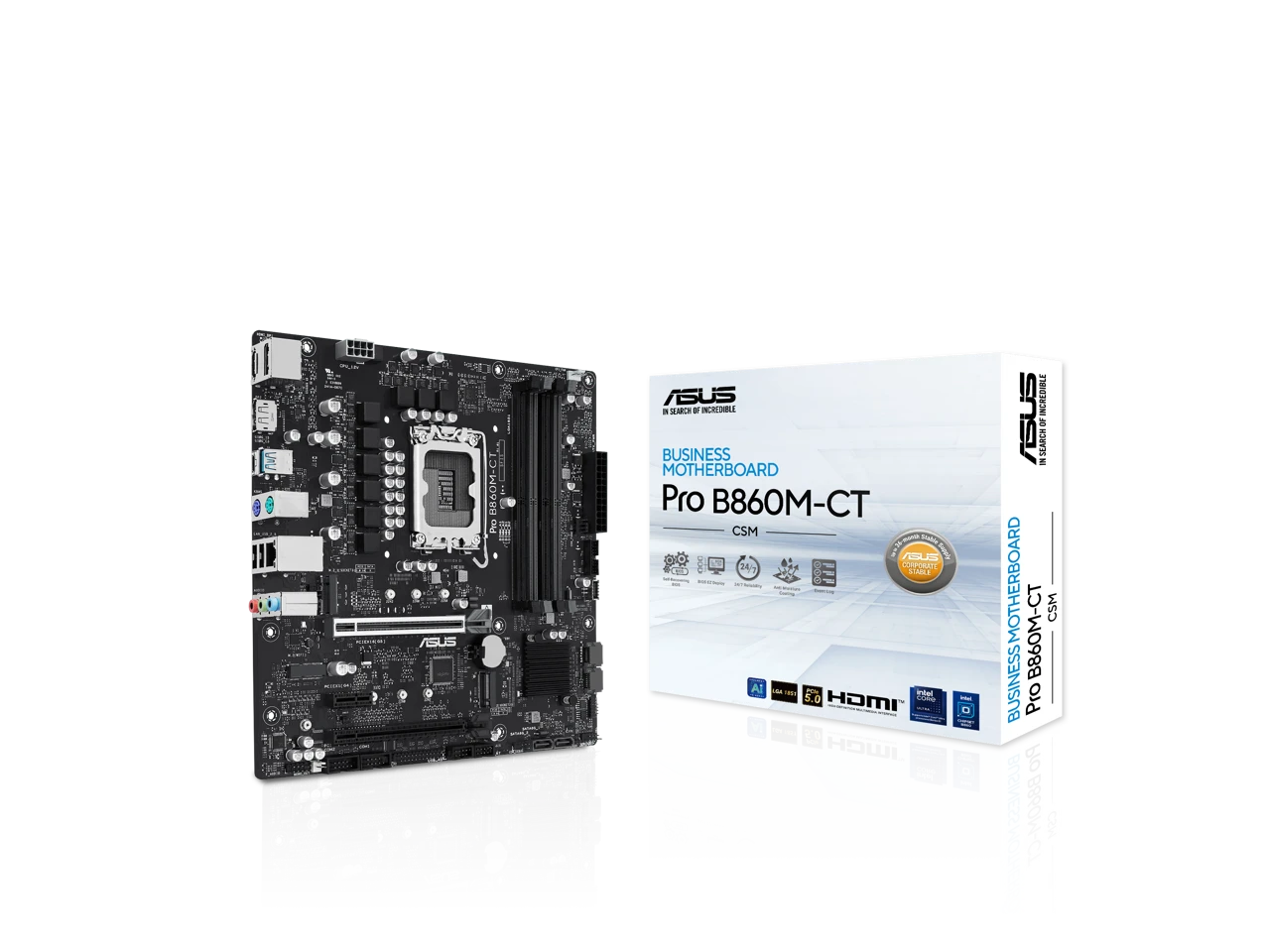 The ASUS PRO B860M-CT-CSM is a micro ATX motherboard designed for Intel's B860 chipset (LGA 1851). This motherboard supports high-performance DDR5 memory with a capacity of up to 256GB. Equipped with PCIe 5.0 technology, it offers enhanced data transfer rates for modern GPUs and storage devices.