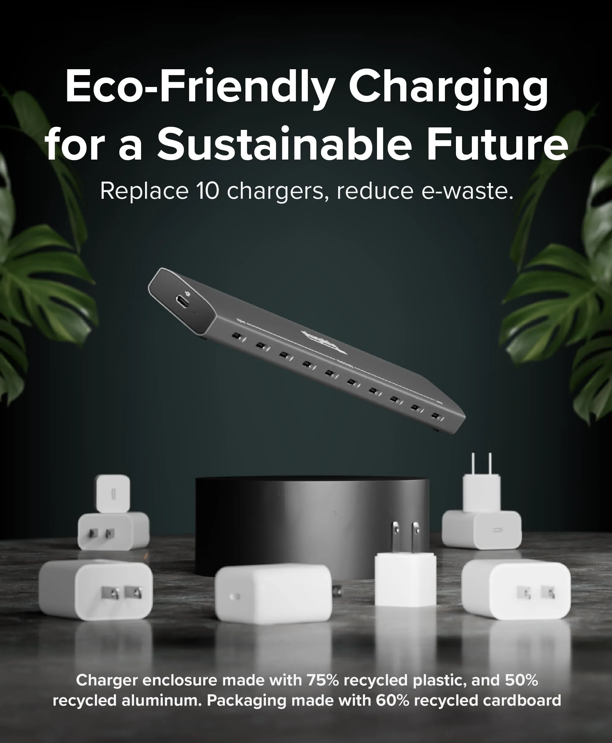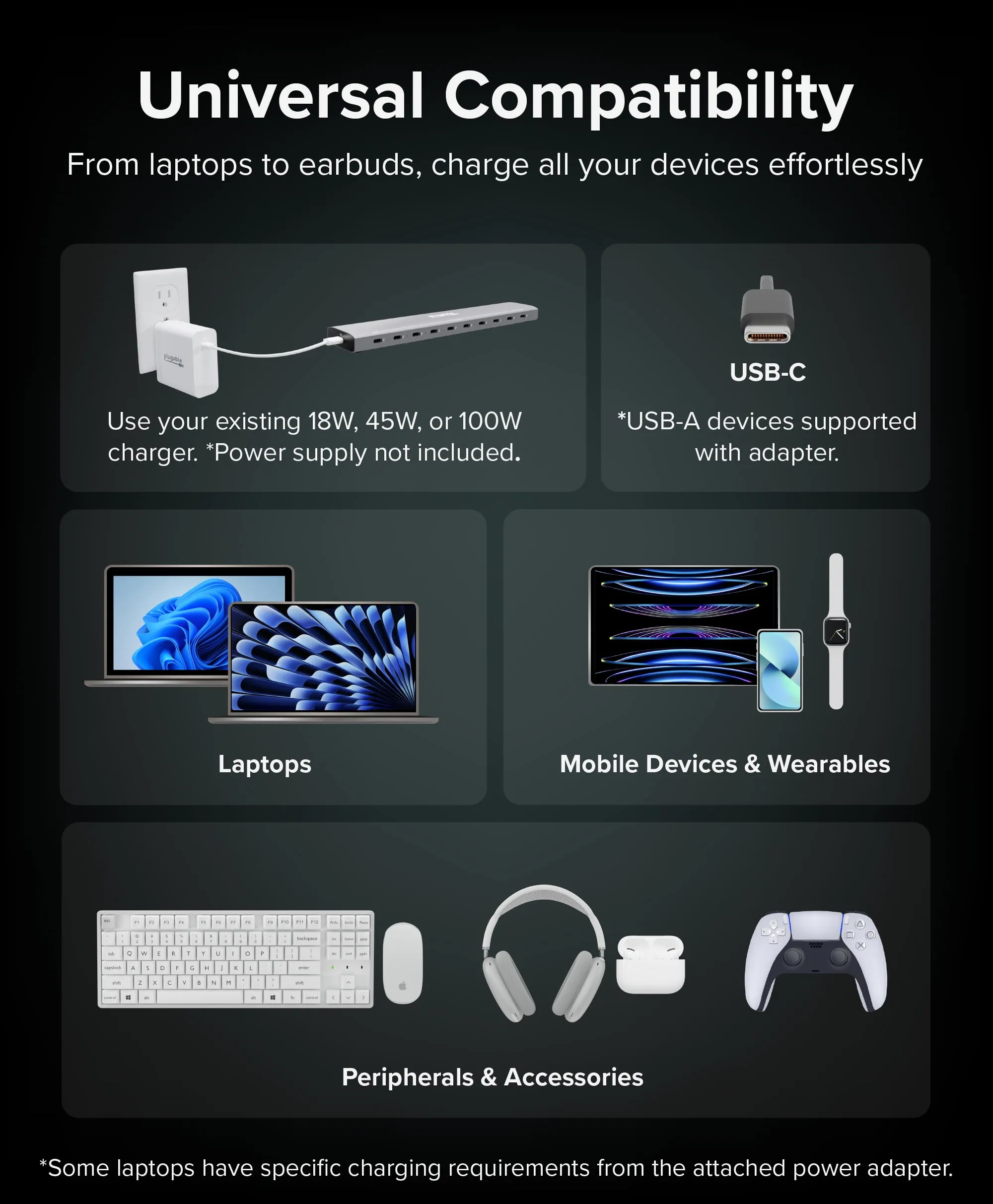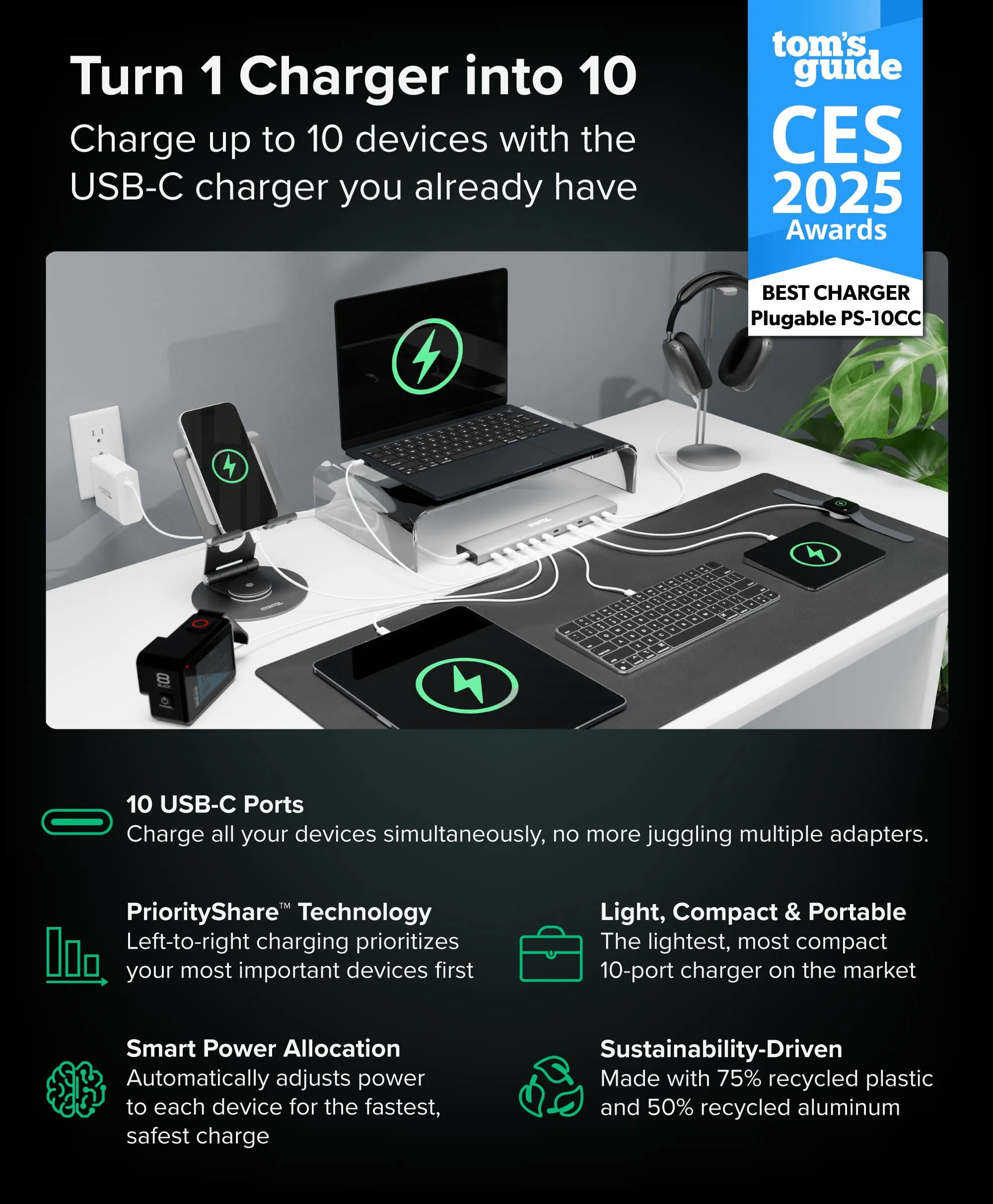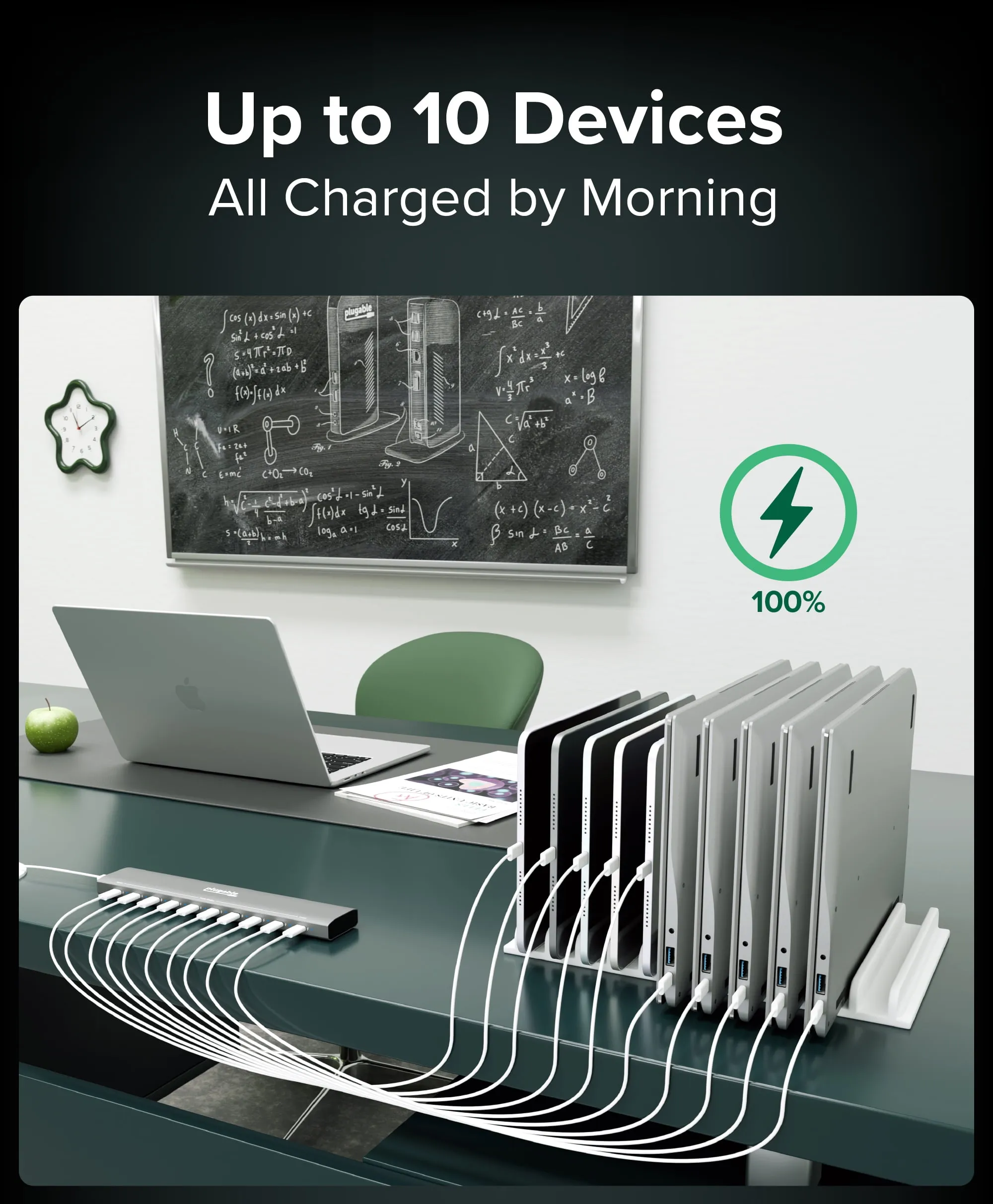 The Plugable 10-Port USB-C Charging Hub offers up to 100W of powerful charging for multiple devices simultaneously. Designed for versatility, this desktop power station supports a wide range of USB-C devices, including laptops, smartphones, tablets, earbuds, and more.