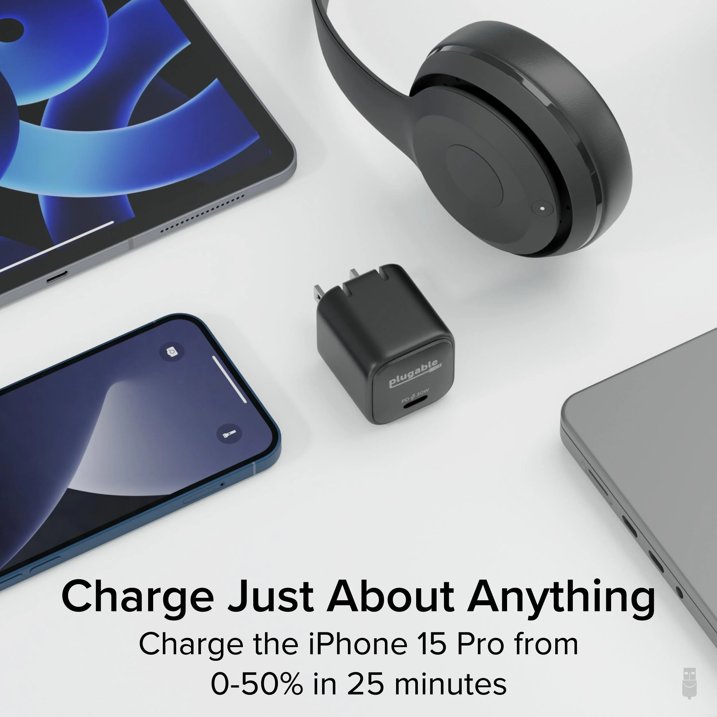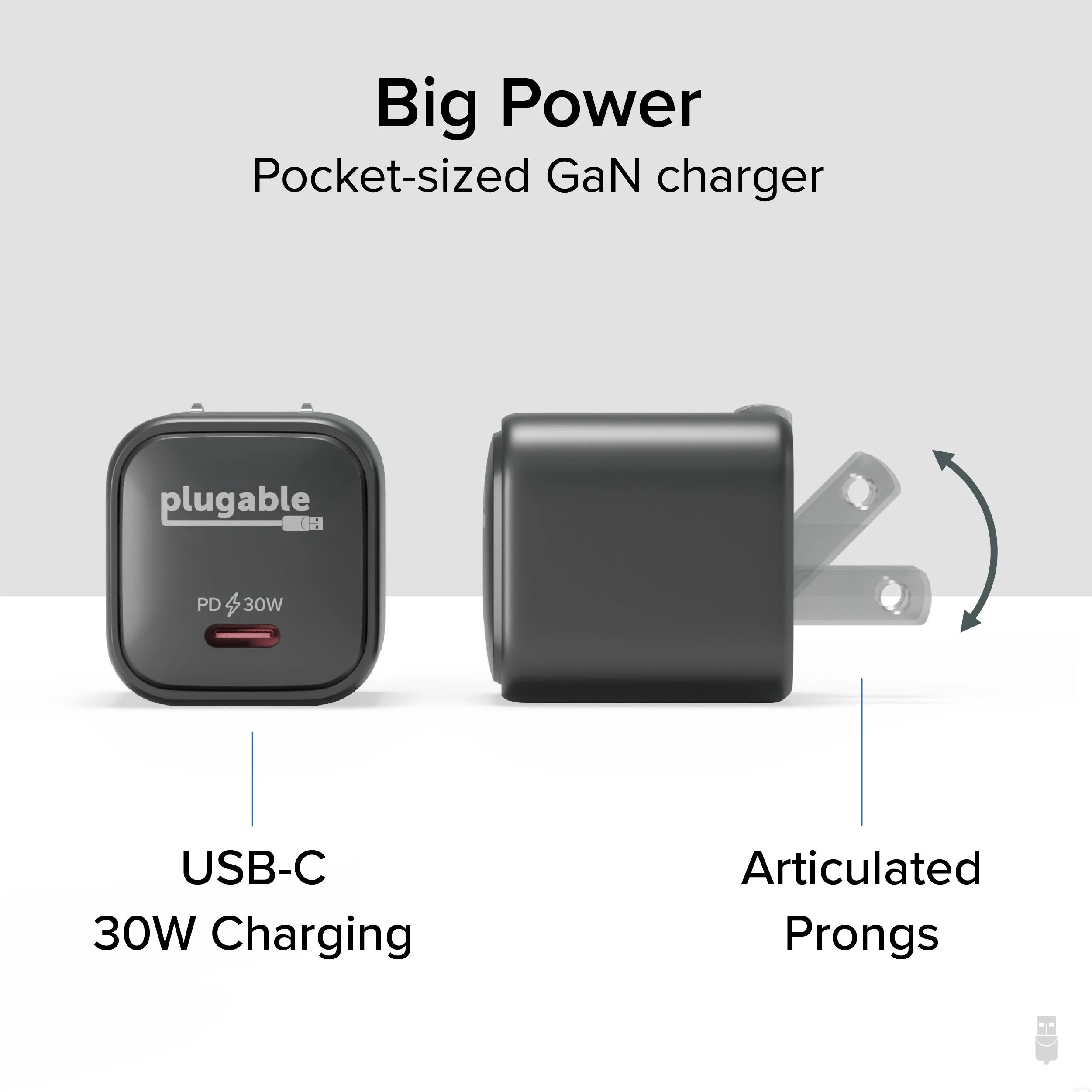 The Plugable 30W GaN USB-C Charger Block provides rapid and efficient charging for your devices. With a compact design and advanced GaN technology, this charger delivers up to 30 watts of power, making it suitable for smartphones, tablets, and more.