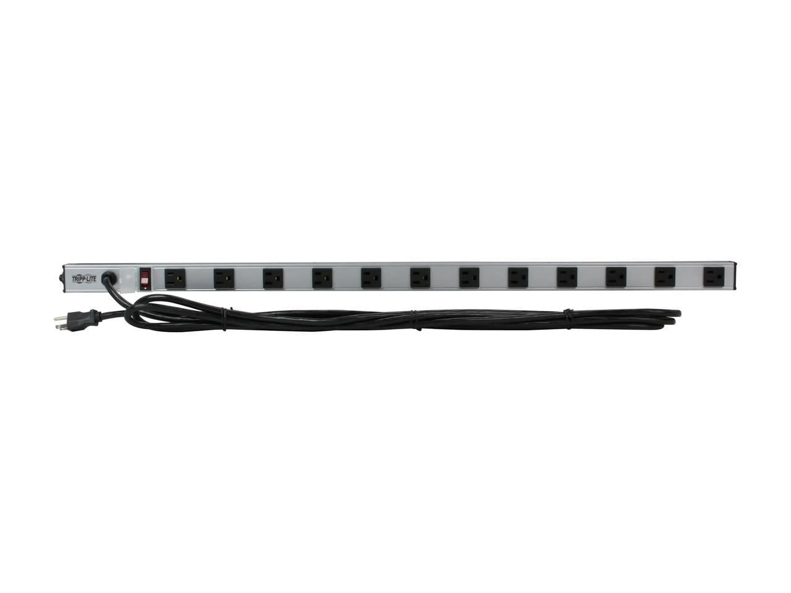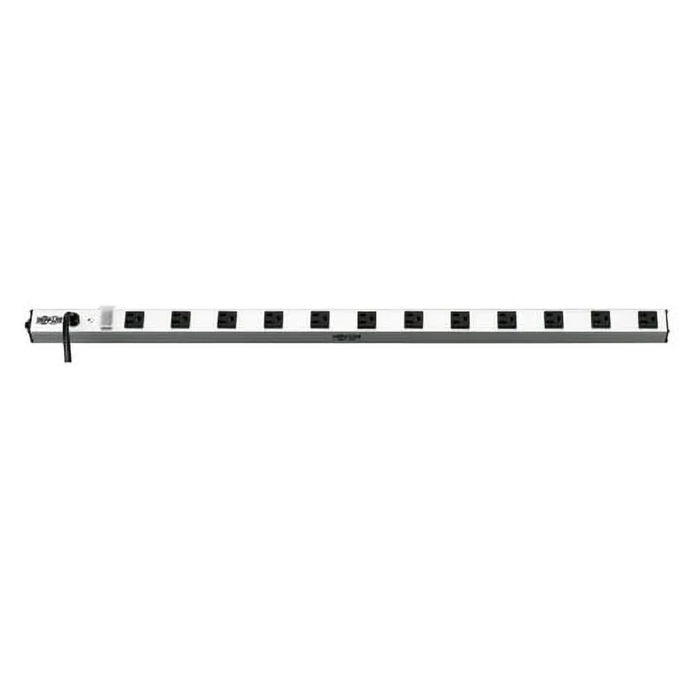 12-Outlet Vertical Power Strip offers 15 amp, 120V multi-outlet AC power distribution in a convenient 36" mountable housing. It is ideal for horizontal or vertical raceway-style power distribution in office, workbench, industrial, networking and telecom applications. Lighted, two-position switch controls power to all outlets and features a locking transparent cover to prevent accidental shutoff. Power strip includes 12 NEMA 5-15R output receptacles with 2-7/11" center-to-center spacing and 15' AC line cord. Sturdy, all-metal extruded aluminum housing stands up to demanding network, laboratory or factory environments. Power strip includes mounting clips.Tripp Lite Power Strip 120V 5-15R 12 Outlet 15' Cord Vertical Metal 0URM
