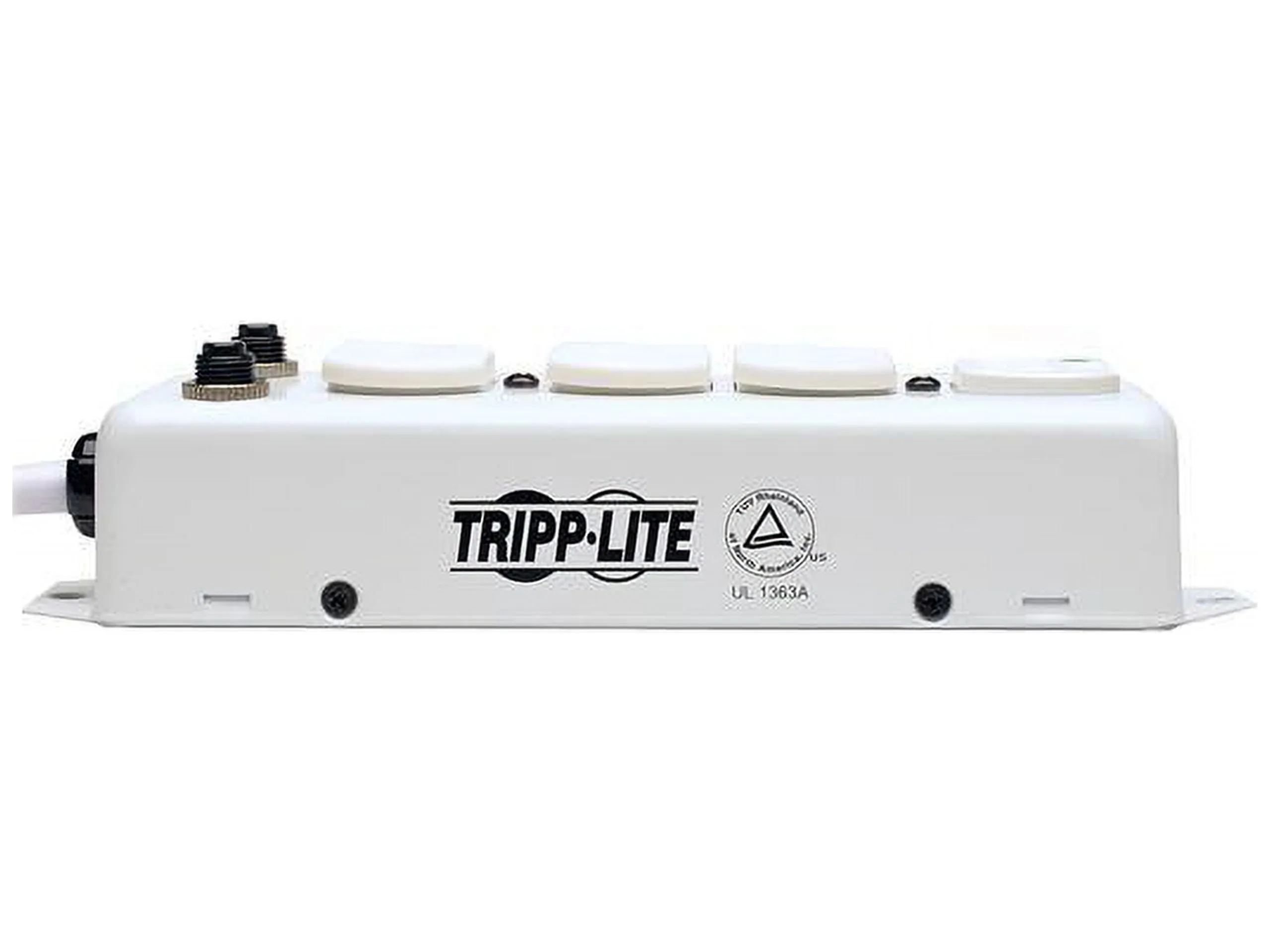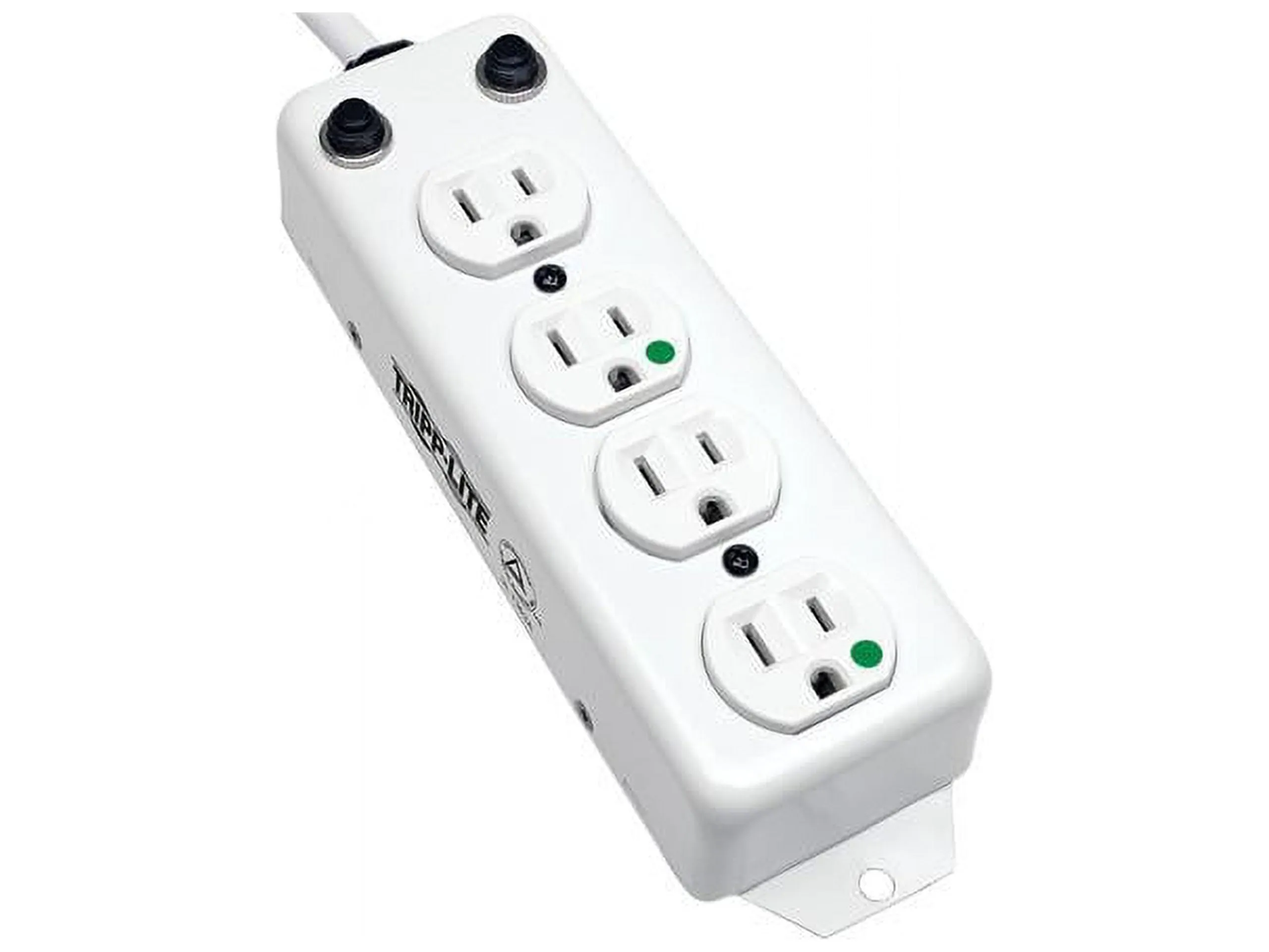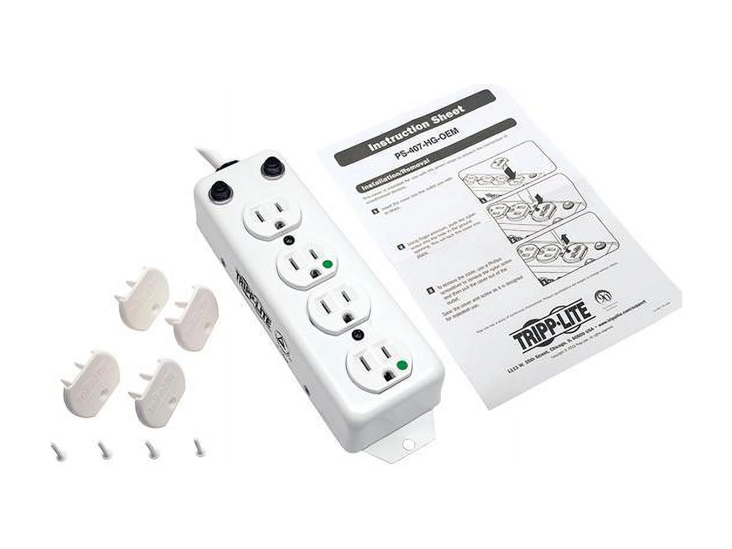 The PS-407-HG-OEM Medical-Grade Power Strip from Tripp Lite supplies power to movable plug-connected components mounted to a rack, table or pedestal in operating rooms, patient-care vicinities, therapy rooms, imaging environments and administrative areas. Compliant with UL 1363A specifications, this 120V, 50/60 Hz power strip features a NEMA 5-15P-HG hospital-grade plug and four NEMA 5-15R-HG hospital-grade outlets that include integrated locking safety covers. Two built-in resettable 15A circuit breakers control power to all outlets and protect the power strip against overloads. Switchless design prevents the unit from being accidentally shut off. The seven-foot power cord provides ample reach to the AC power source. Mounting tabs and flanges let you install the PS-407-HG-OEM on a wide variety of surfaces, such as IV poles, mobile carts, crash carts and mobile medical workstations. The all-metal housing ensures safety and is guaranteed to last a long time in demanding environments.