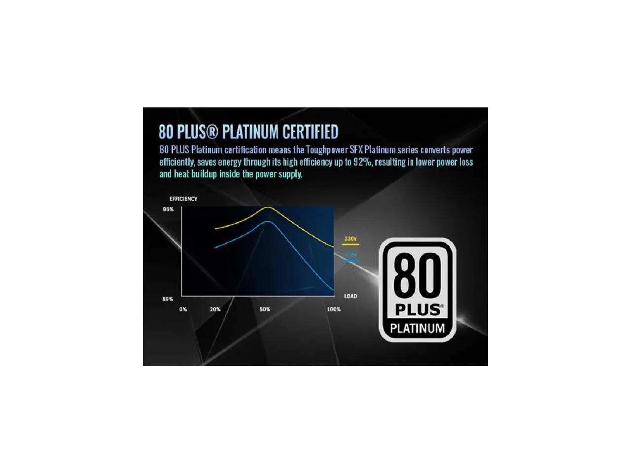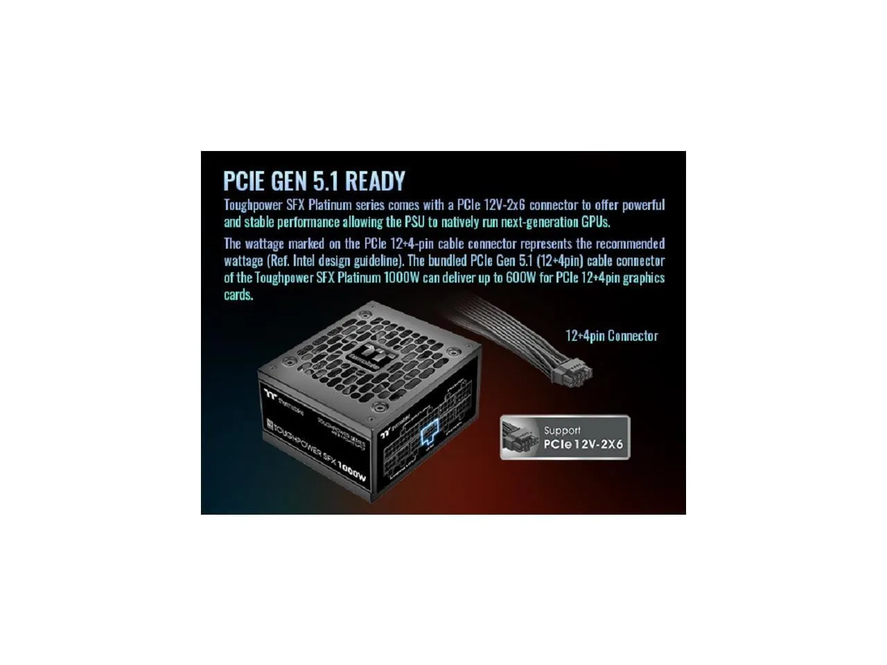 The Toughpower SFX Platinum Power Supply Unit is engineered to support the latest generation of hardware, conforming to the Intel SFX 12V 4.1 and ATX 12V 3.1 standards. It features a native PCIe 12V-2x6 (12+4pin) modular interface, allowing efficient powering of modern PCIe 12+4pin graphics cards. With an impressive 80 PLUS Platinum efficiency rating, this power supply ensures optimal energy usage while maintaining exceptional stability, durability, and reliability.