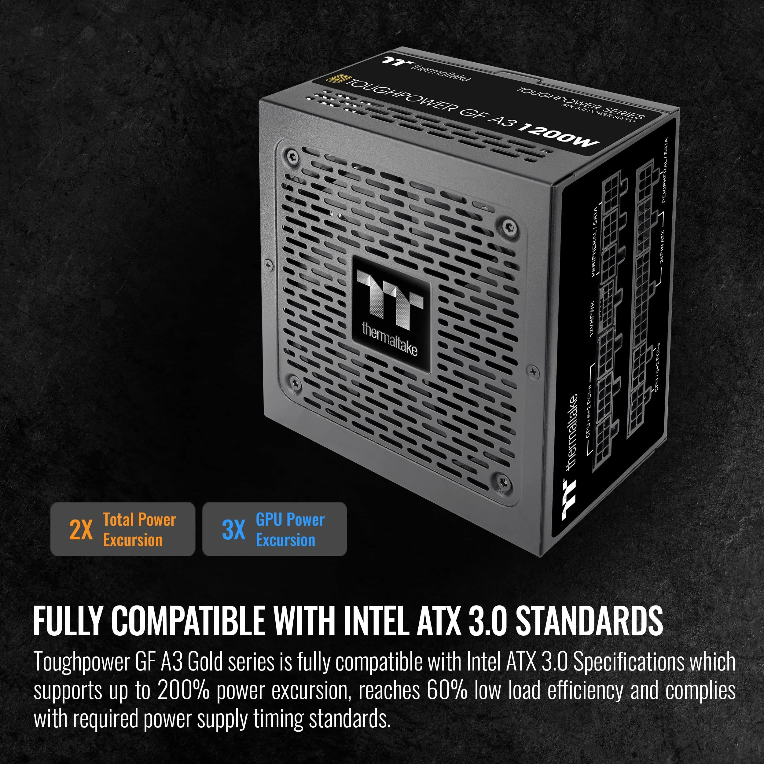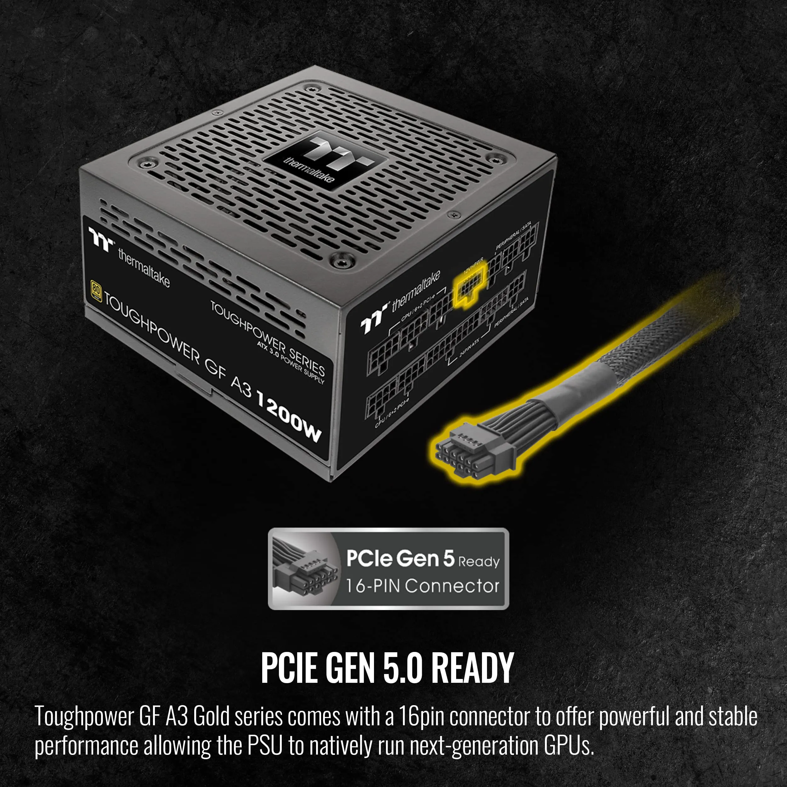 The Toughpower GF A3 1200W Power Supply Unit is designed to provide powerful and stable performance with its advanced 16-pin (12VHPWR) connector. This ensures compatibility with next-generation GPUs, delivering up to 600W for PCIe 5.0 graphics cards. The PSU meets Intel design guidelines, making it an excellent choice for high-demand gaming and professional systems.
