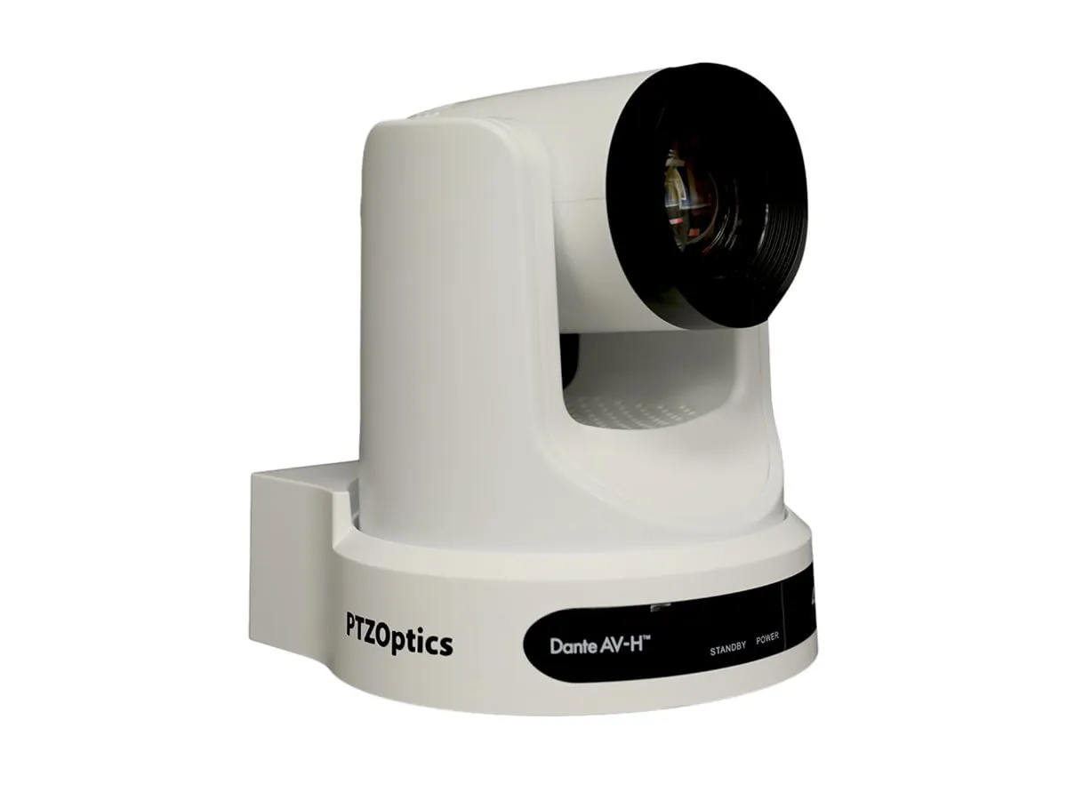 PTZOptics Link 4K, Dante AV-H IP PTZ camera, featuring 30X Optical Zoom, 4K Resolution at 60fps and a 59.2 HFOV. Supports simultaneous IP Video (DANTE AV-H, SRT, RTMPS, RTSP), USB2.0 and 3G-SDI or HDMI2.0 as outputs with Auto-Tracking capabilities. DC or