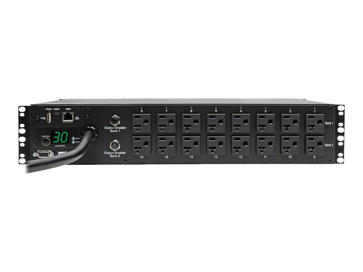 Tripp Lite Switched, Metered Rack Power Distribution Units enable a variety of advanced network control and monitoring functions by giving IT Managers the ability to turn on, turn off, recycle or lock-out power to each individual receptacle and remotely monitor PDU power consumption and in-rack environmental conditions. Switched PDU systems can be accessed, configured and controlled through secure web, SNMP or Telnet Interface. Individually switched outlets can be controlled via a built-in web/network interface, enabling remote reboot of unresponsive network hardware. User defined power-up and power-down outlet sequences ensure proper operation of interdependent IT systems and prevent inrush-related overloads as devices are powered on. Programmable load-shedding of less critical devices at user-defined intervals extends UPS uptime in response to power failures. Unused PDU outlets can be electronically locked-off to prevent powering of unauthorized hardware. PDU power consumption (current) is displayed locally and can be monitored via the web/network interface, with user-defined alarms to warn of potential overloads before critical IT mains or branch breakers trip. Optional ENVIROSENSE temperature/humidity probe enables remote monitoring of in-rack environmental conditions and alarms for up to 3 user supplied contact-closure sensors. Supports real-time monitoring, notification and logging of all on-board reporting functions with user-specified alarm thresholds and actions for each reported condition. Switched PDU systems can be accessed, configured and controlled through secure web, SNMP or Telnet Interface.