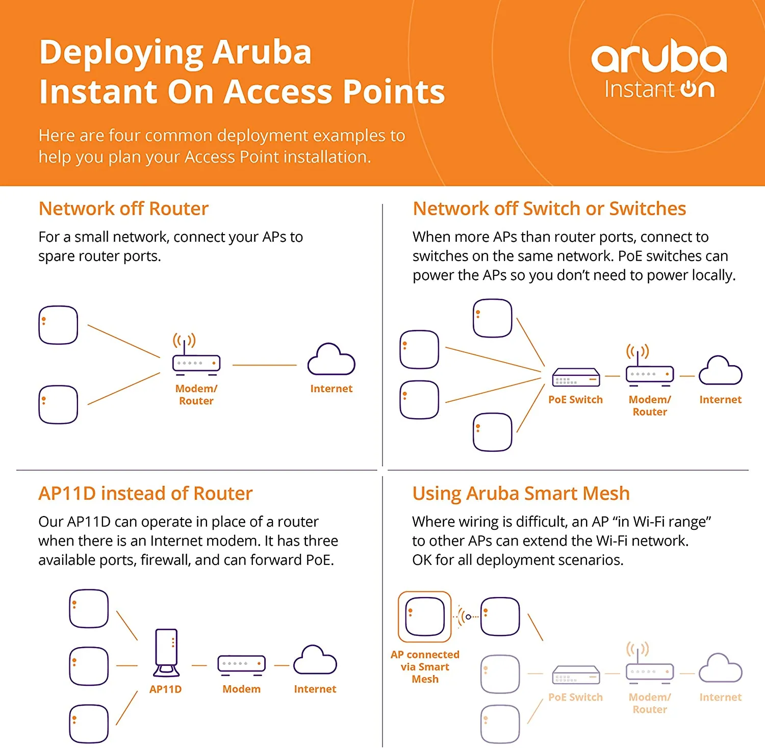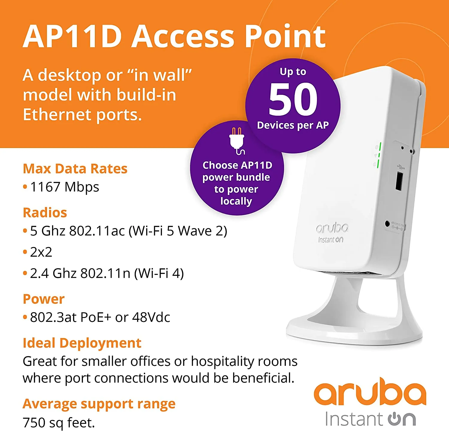 • Aruba Instant On AP11D Desk/Wall Access Points deliver affordable, business-grade Wave 2 802.11ac Wi-Fi for low- to medium-density small business environments. They are a perfect choice for delivering in-room Wi-Fi connectivity in offices, hospitality locations like hotel guest rooms, medical clinics, and Airbnb located in the same premises as your main network. Get setup and running in minutes with the Aruba Instant On Cloud app management system.