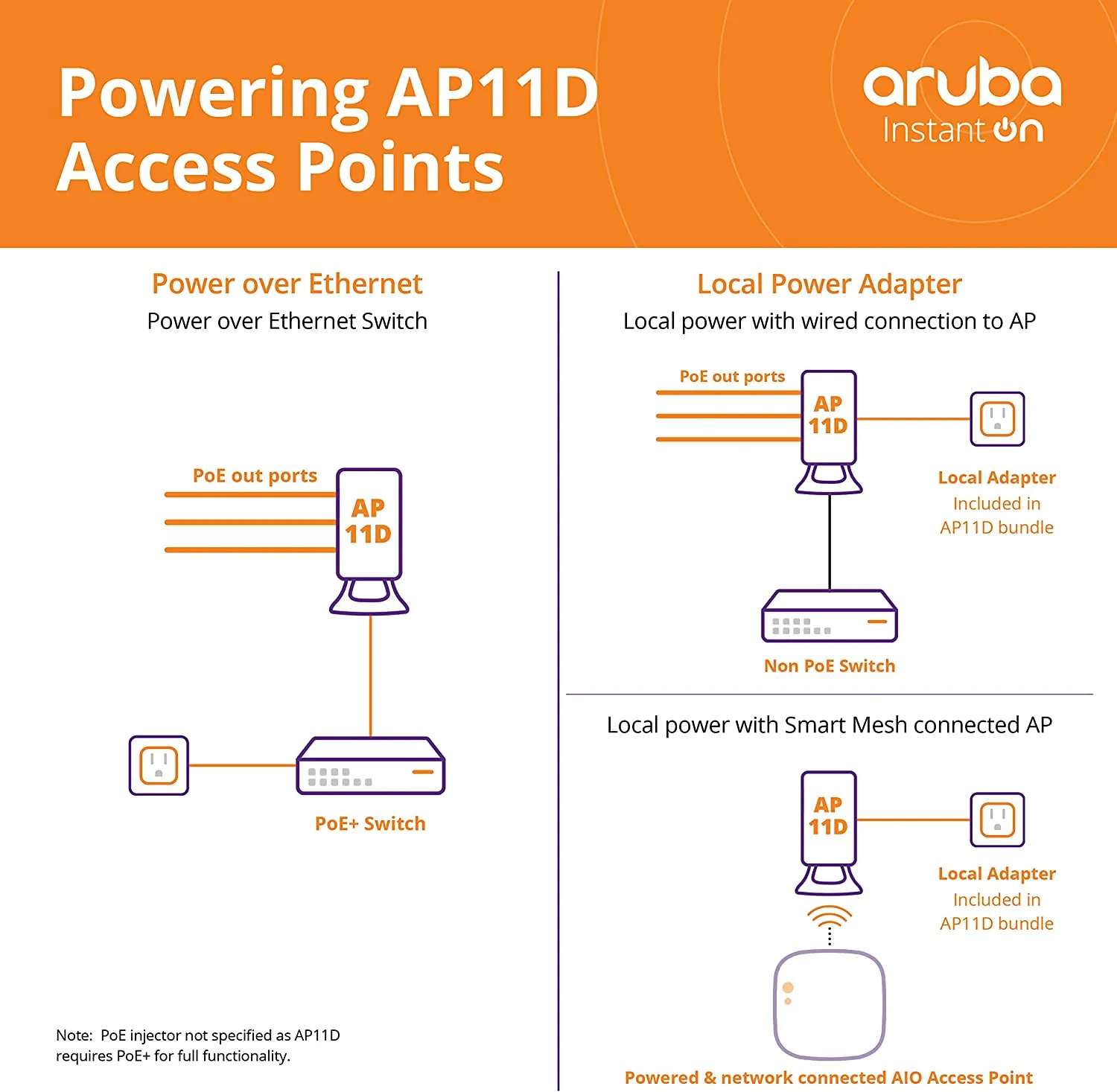 • Powering: AP11D APs require Power over Ethernet (802.1at Class 3 PoE+) or a 48V local power adapter. Reason for the extra power is to allow for PoE out on downlink ports. There are two ordering options depending on what power mode you choose. This model (R2J25A) is a power bundle that ships with the 48V power adapter. Also available is model (R2X15A) that is just the unit, most appropriate if you will be provided PoE+ from a switch.