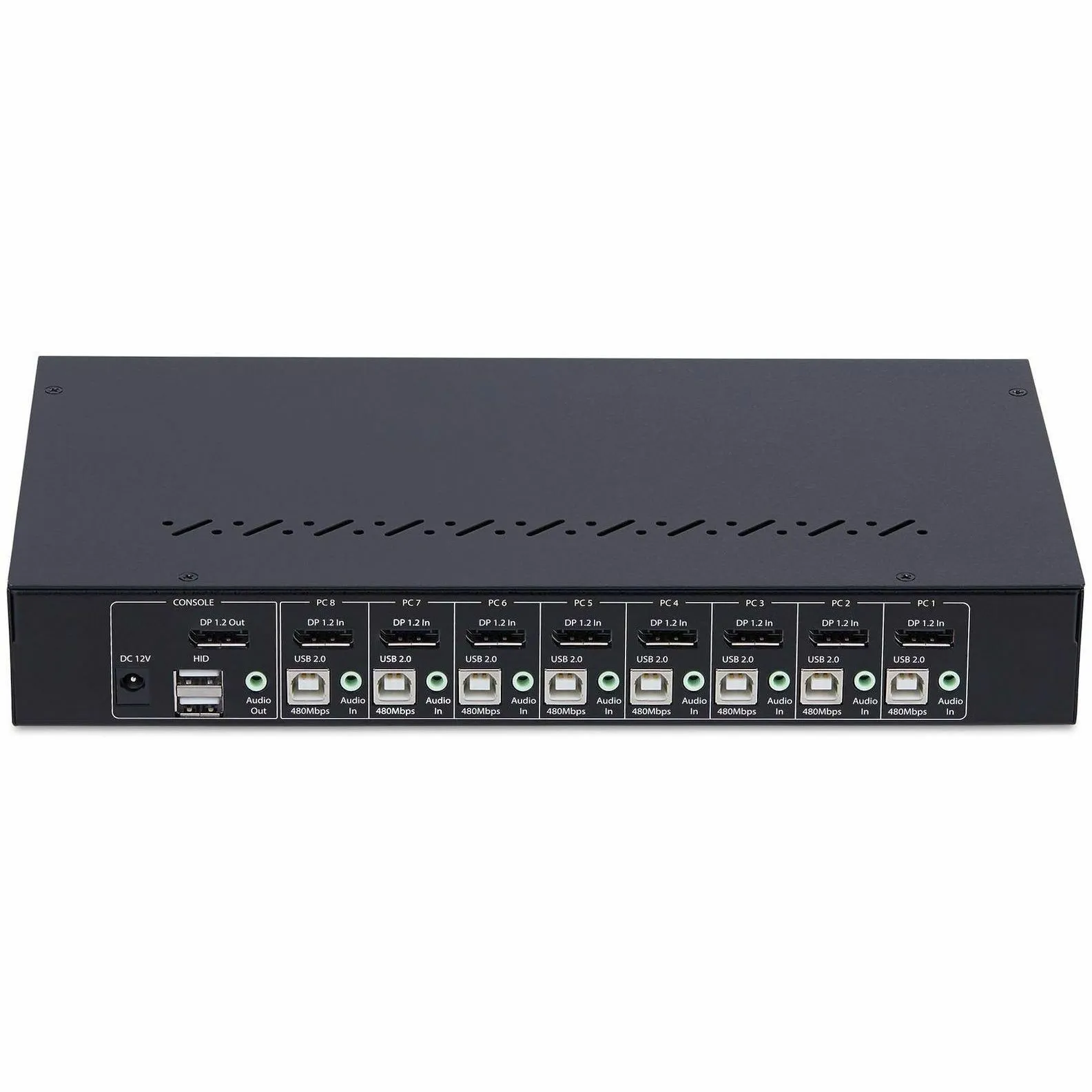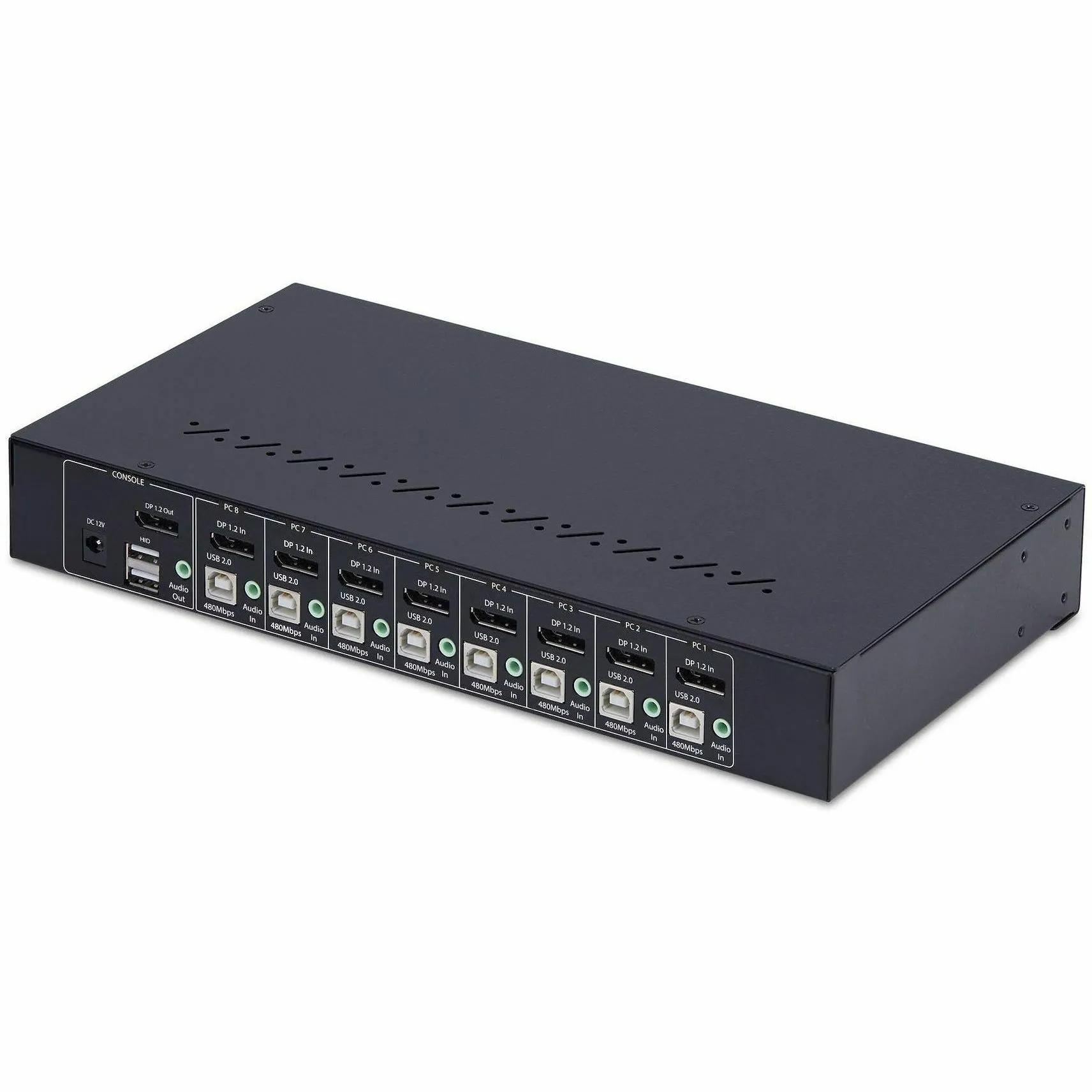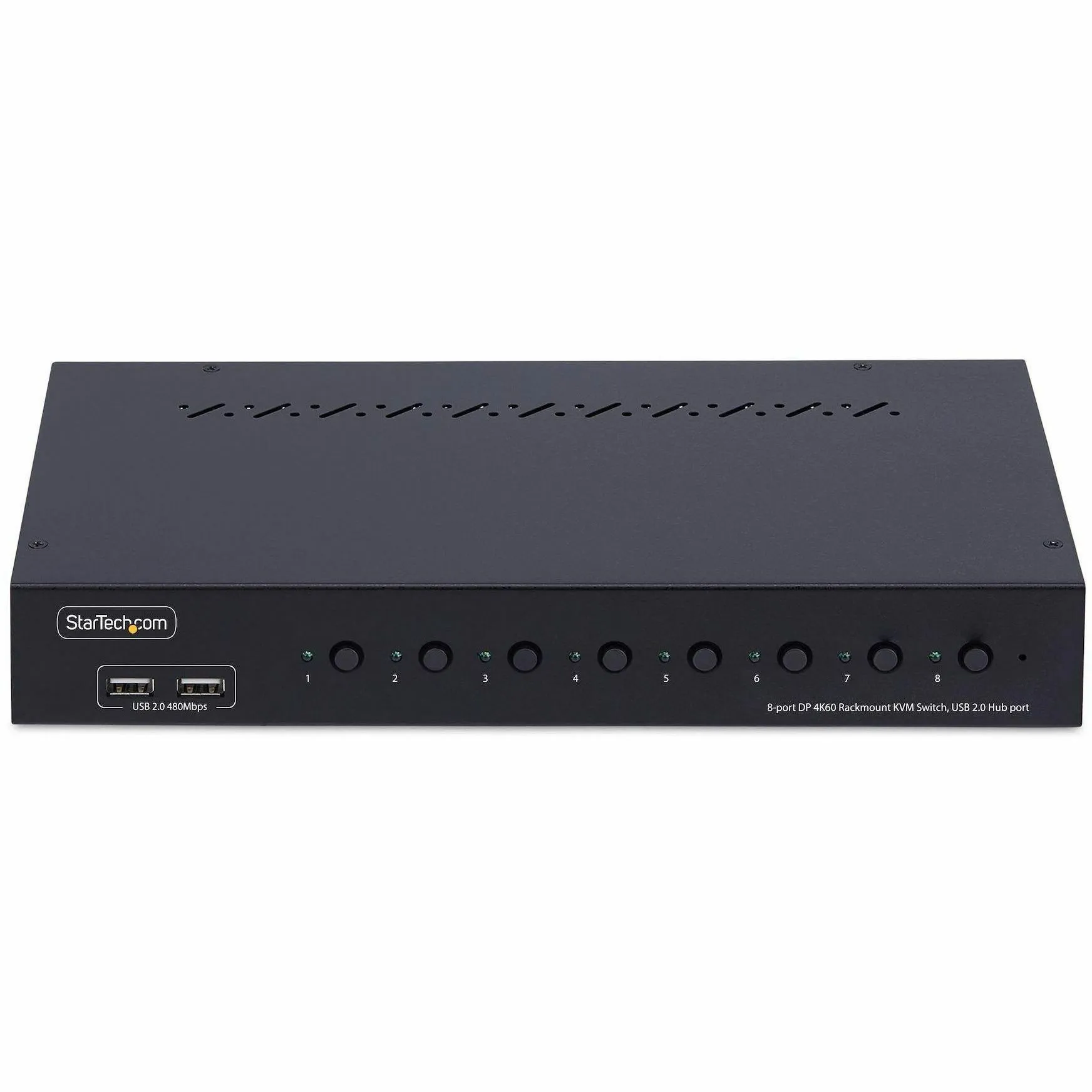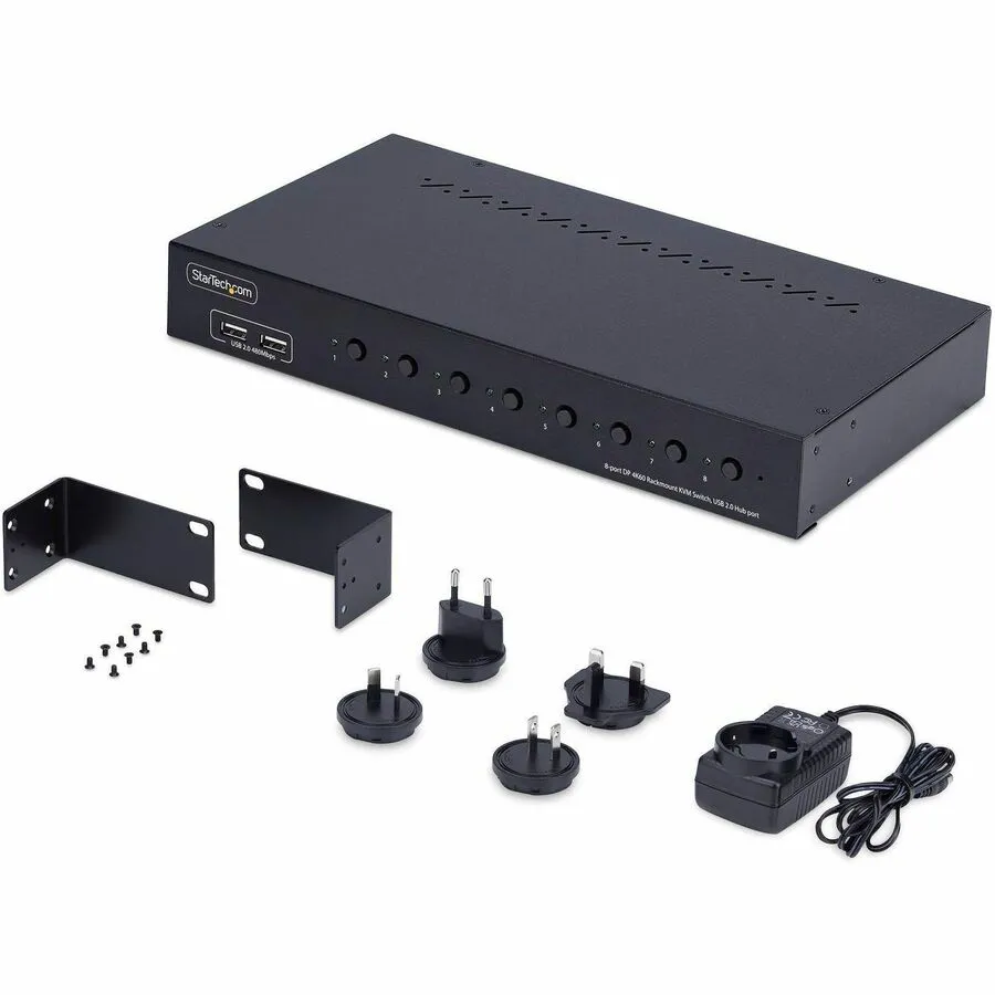 - Switch between 8x DisplayPort computers to share a keyboard/mouse/4-port usb 2.0 hub/audio/4K 60Hz DP 1.2 monitor - TAA-Compliant KVM Switch gives BIOS level control with any OS including Windows/macOS/Linux - Works with all hardware platforms such as Intel/AMD/SnapDragon/ARM/Apple Silicon - Push-button/hotkey switching with audible buzzer; LEDs for visual port selection status - Includes rackmount brackets to install in 1U of rack space; Requires a mounting depth of 6.5in (165mm) or more