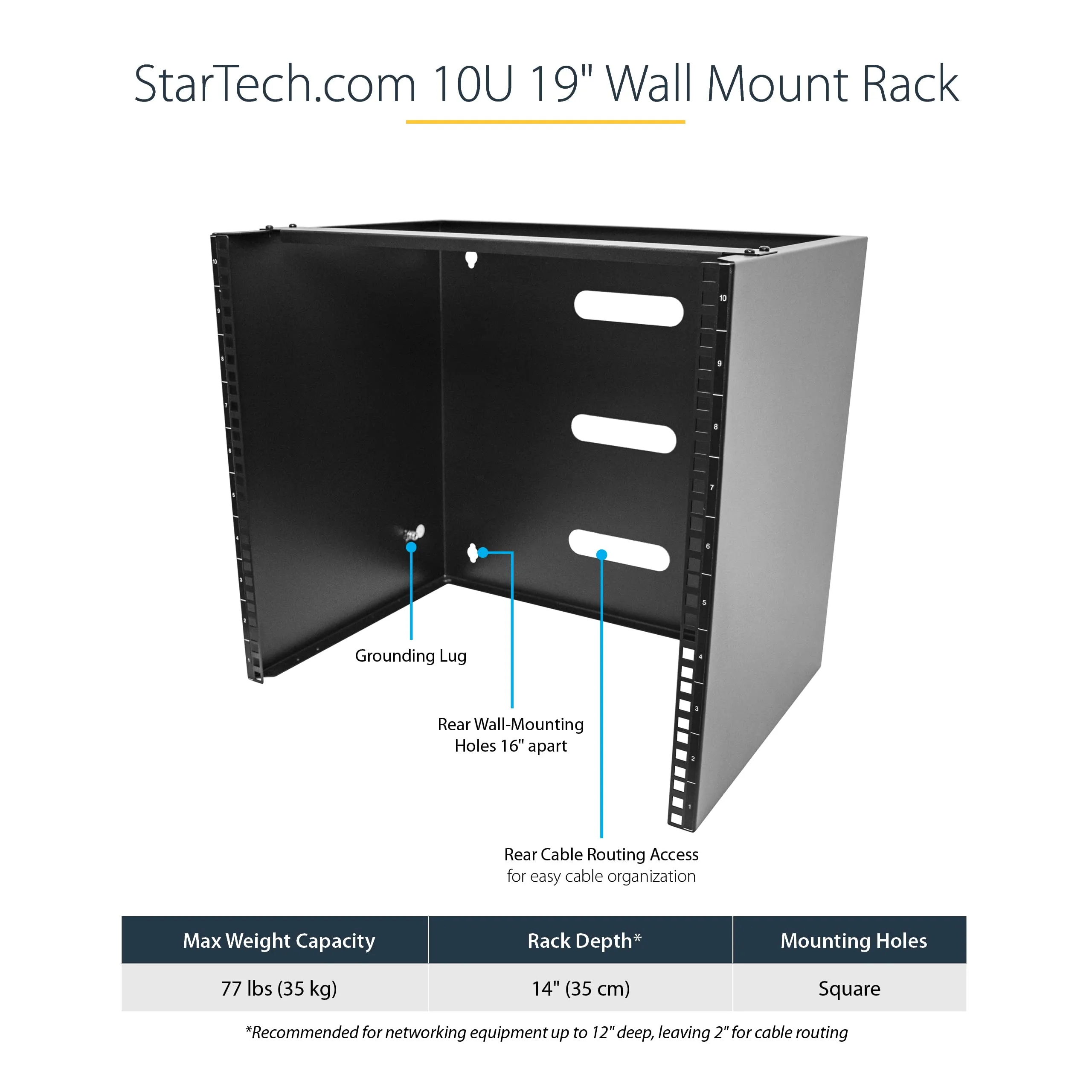 The 10U wall mount rack is designed for efficient and secure organization of networking equipment. With a width of 19 inches, it supports a maximum mounting depth of 14 inches (35 cm) and a weight capacity of 77 lbs (35 kg). This wall-mounted patch panel bracket is ideal for use in network closets and server rooms.