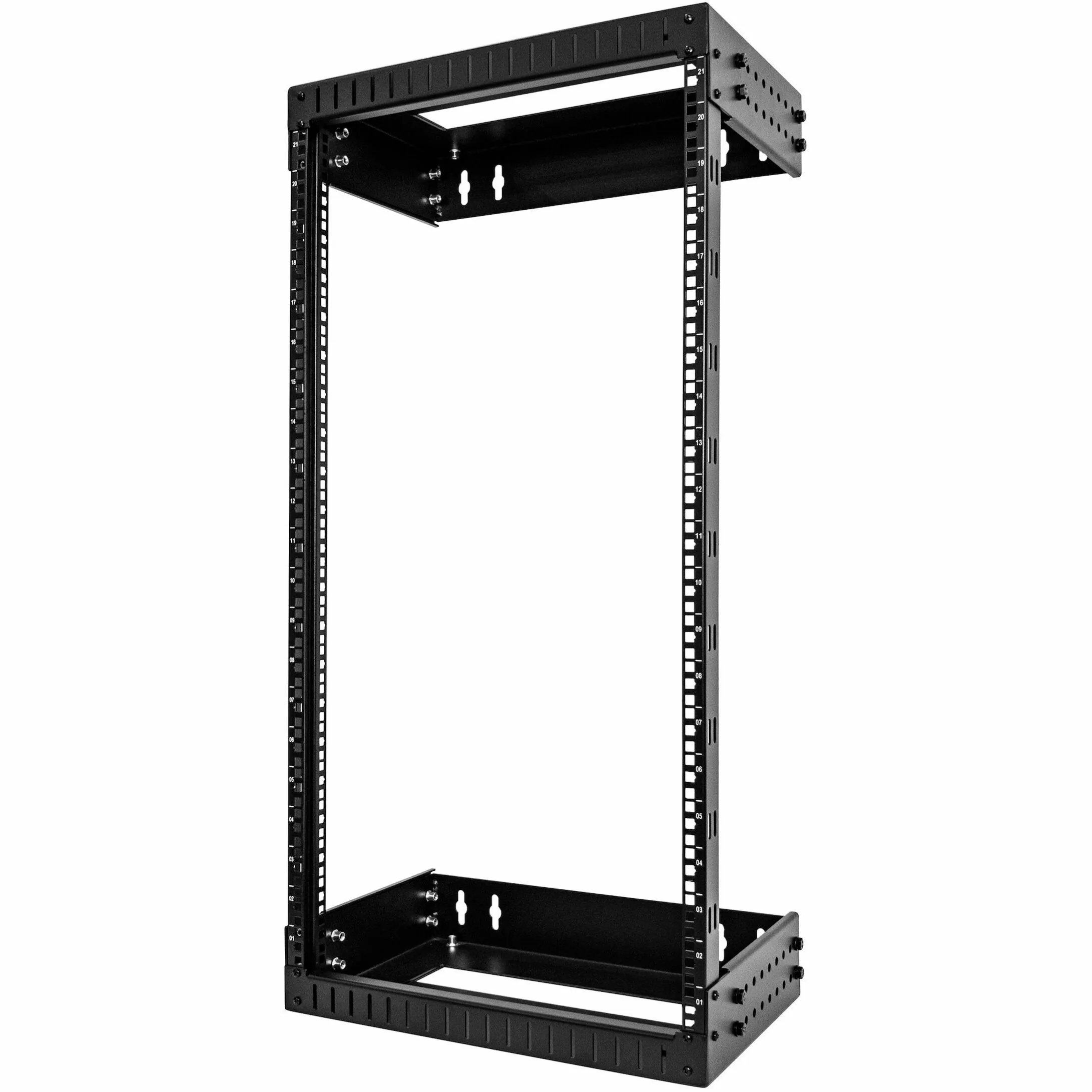 The StarTech 21U Open Frame Wall Mount Network Rack is designed for optimal performance and ease of use in server rooms, AV setups, and IT environments. This adjustable open frame rack features a 19-inch design with a mounting depth of 12-20 inches, ensuring EIA/ECA-310 compatibility.