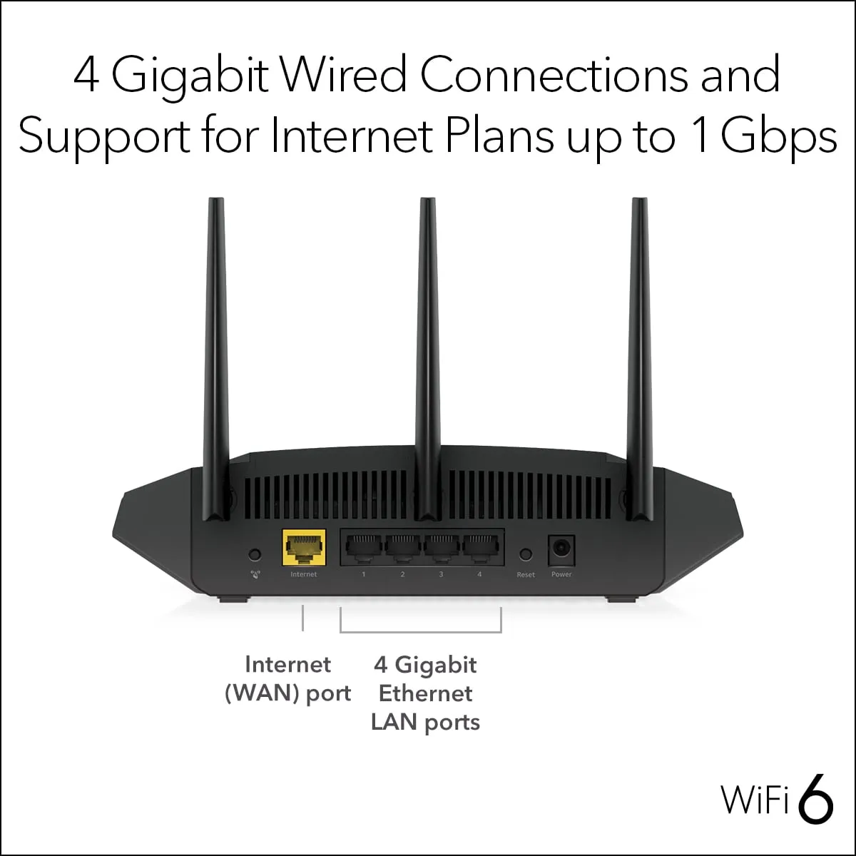 Equipped with three external antennas, the router enhances the wireless signal strength and range throughout your home. It supports up to 384 MB/s wireless speed, making it capable of handling multiple connections with ease. The Nighthawk AX4 also includes four Gigabit Ethernet ports for direct, high-speed wired connections and one broadband port to connect to your internet service.