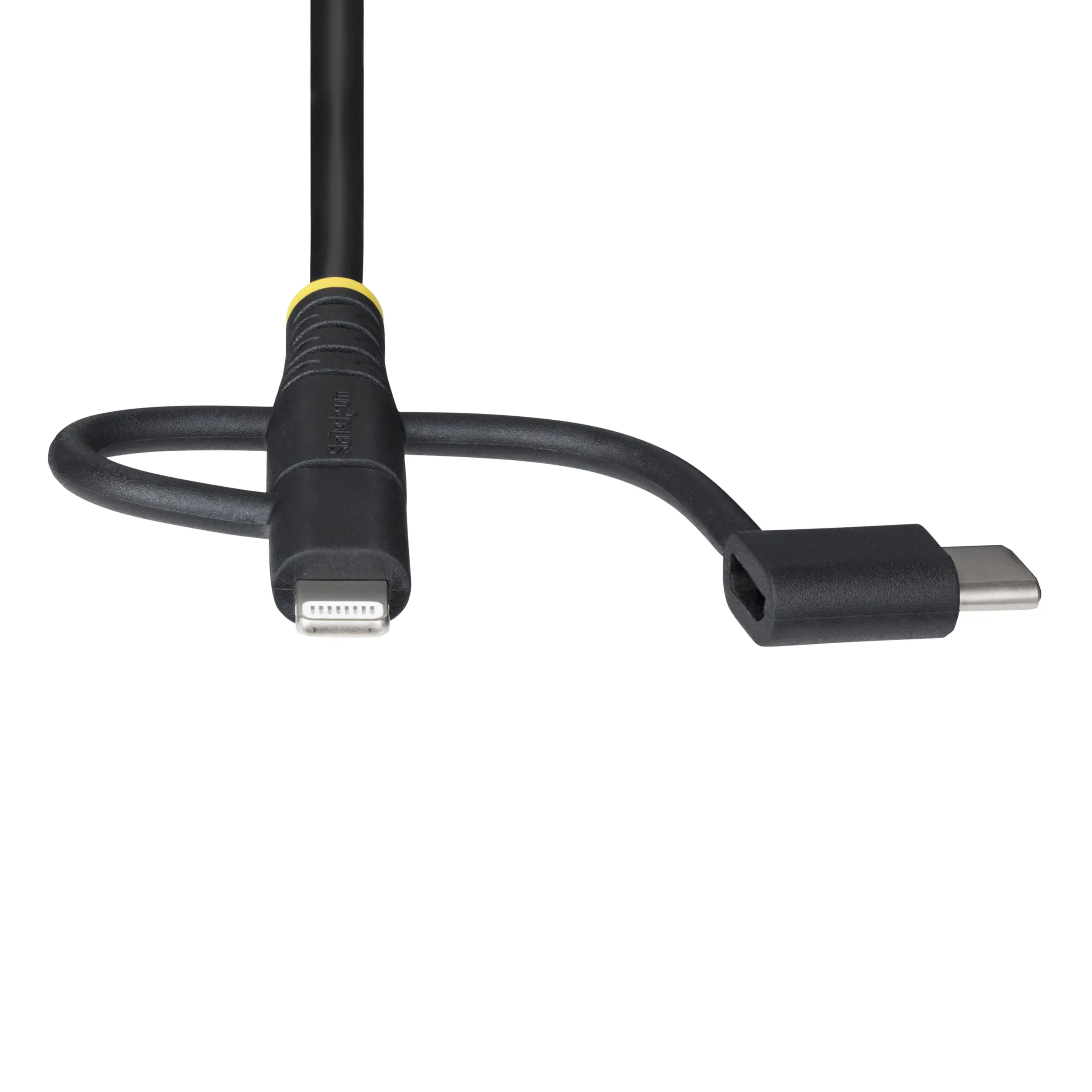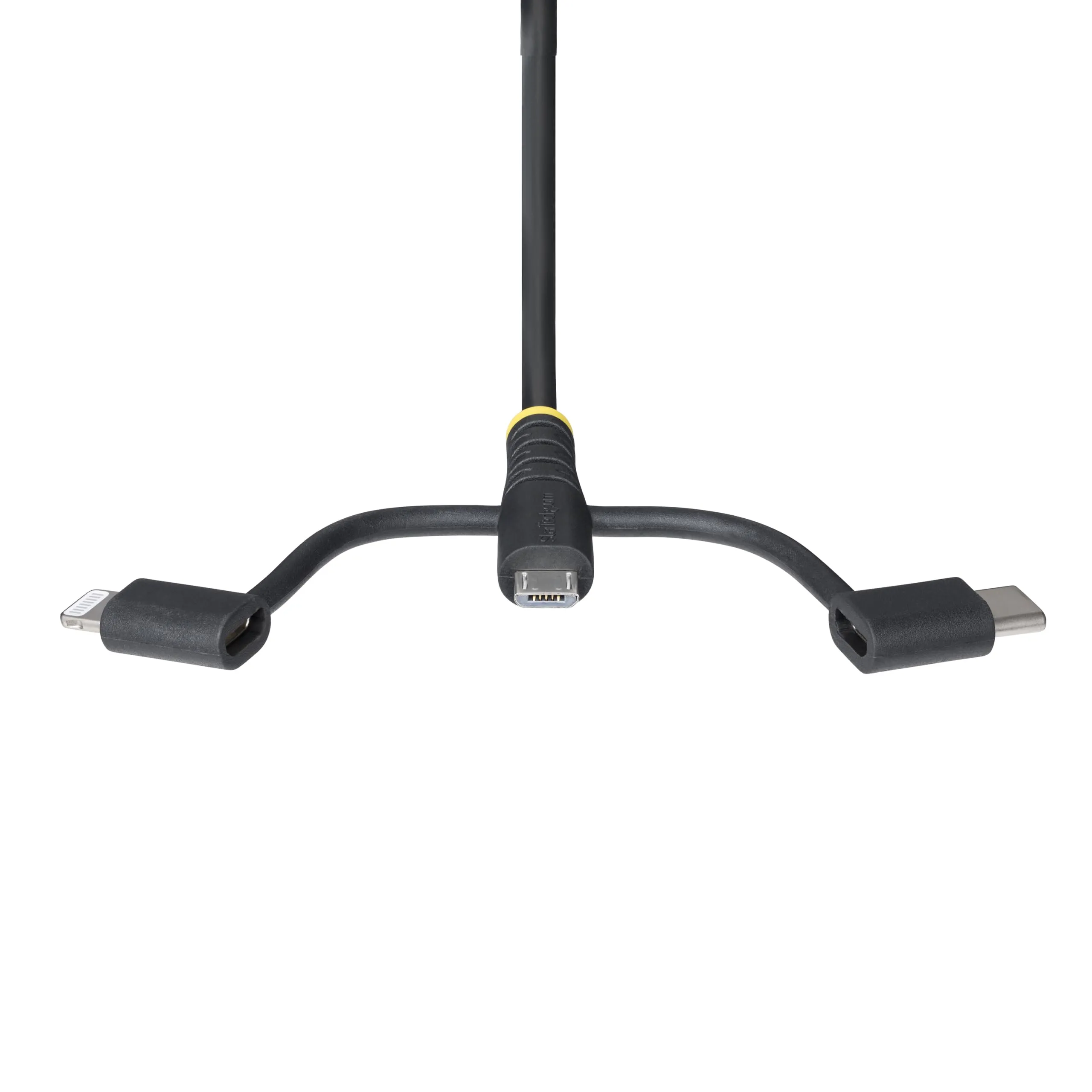 Simplify USB charging using this 3-in-1 cable compatible with multiple devices; Apple MFi Certified Lightning connector; Supports USB-C and Micro-USB devices - Rugged cable design w/Aramid fiber; Flexible TPE jacket withstands 30,000+ bends at -/+90deg - Ideal for traveling or daily use; Charge one device at a time from a USB-A wall charger - Black; 1-meter (3.3-foot); USB-A to Micro-USB/USB-C/Lightning; Up to 15W 3A; USB 480Mbps; Al-Mylar Shield; Cable O.D.: 5.6mm (0.18in).