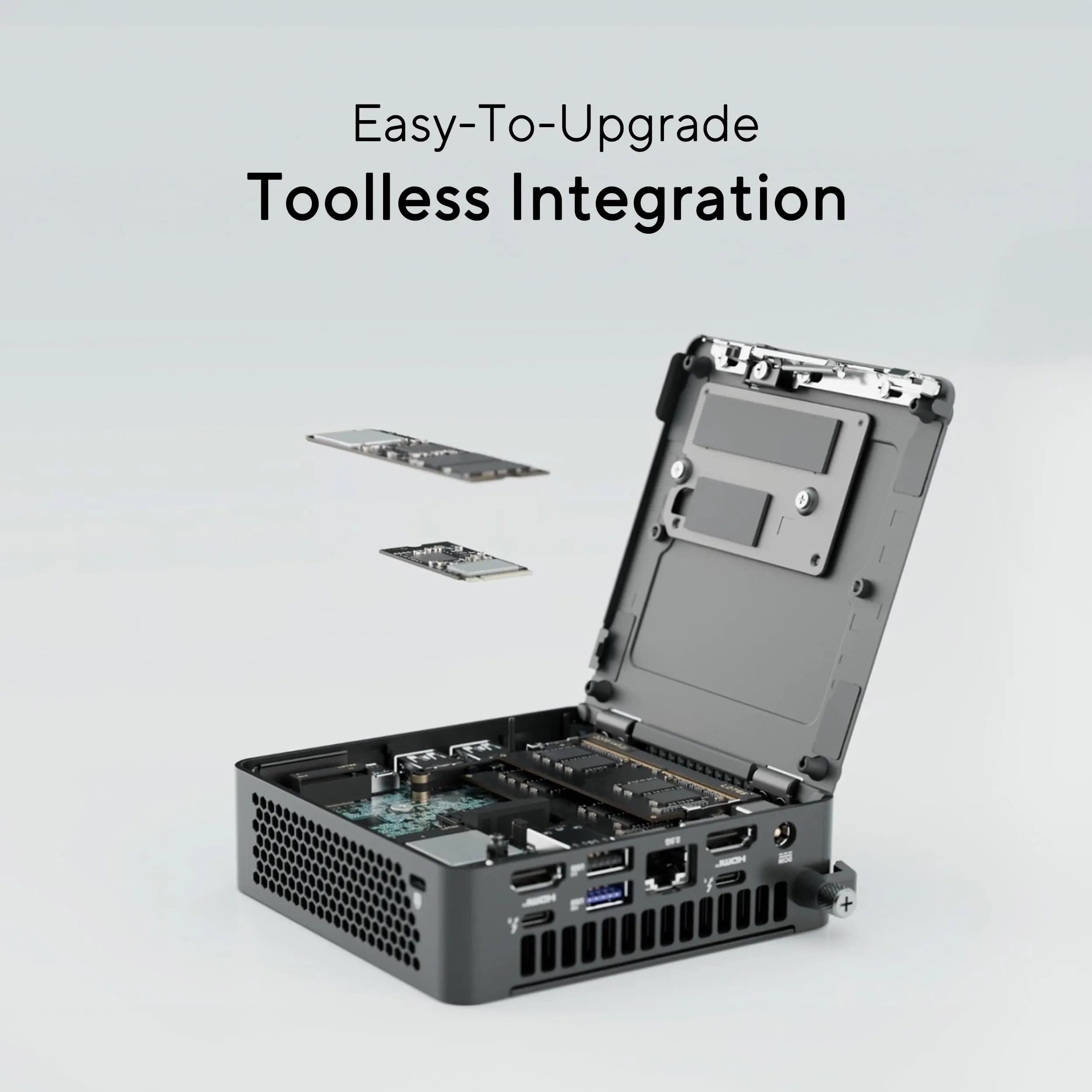 Connectivity options are robust, including Thunderbolt 4, Wi-Fi 7, and Bluetooth 5.4. The toolless chassis allows for easy upgrades and maintenance, while the included VESA mount provides versatile placement options, making it ideal for any workspace.