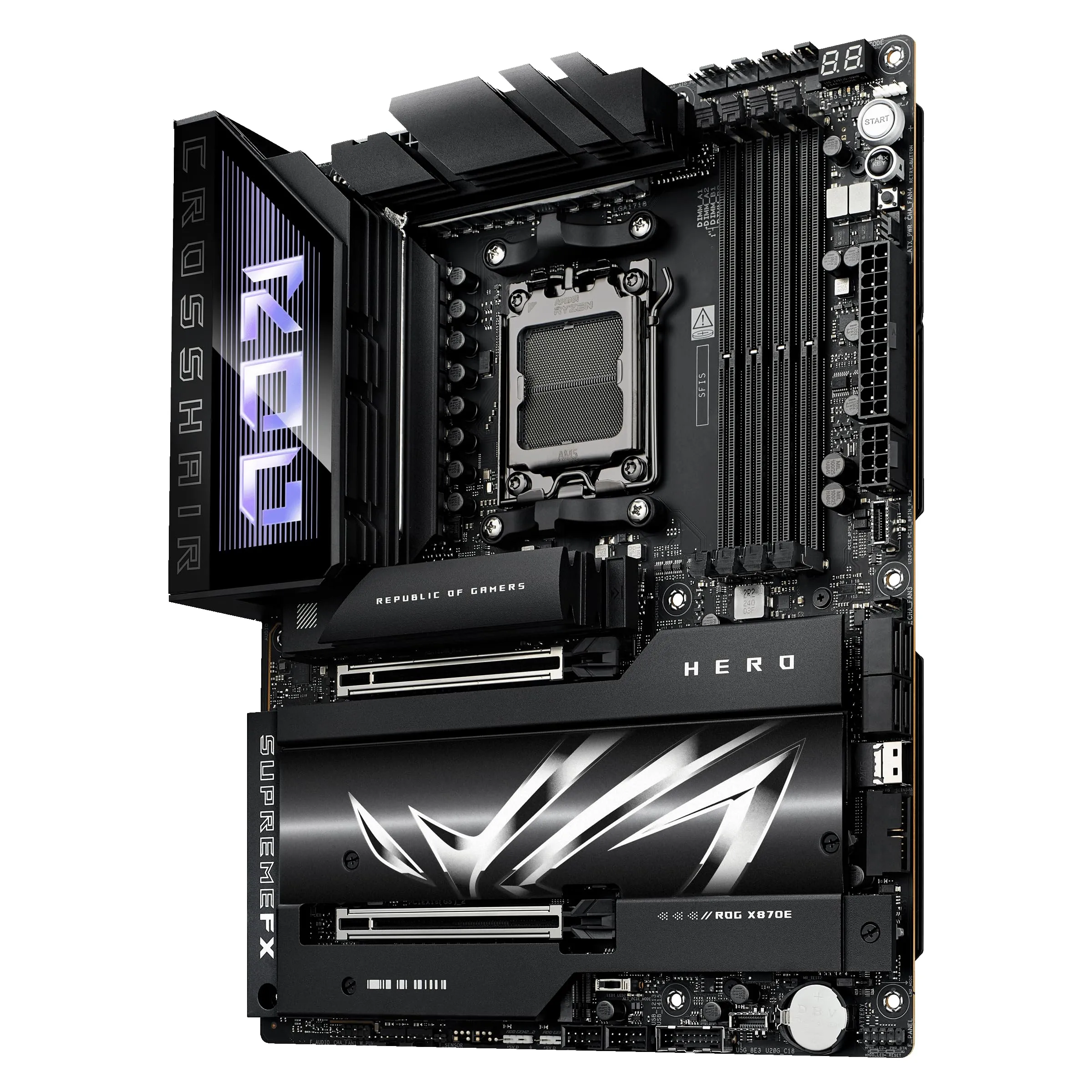 The ASUS ROG Crosshair X870E Hero AM5 motherboard is designed for high-performance gaming and advanced computing. It features the latest technologies to support various processors, memory, and connectivity options.