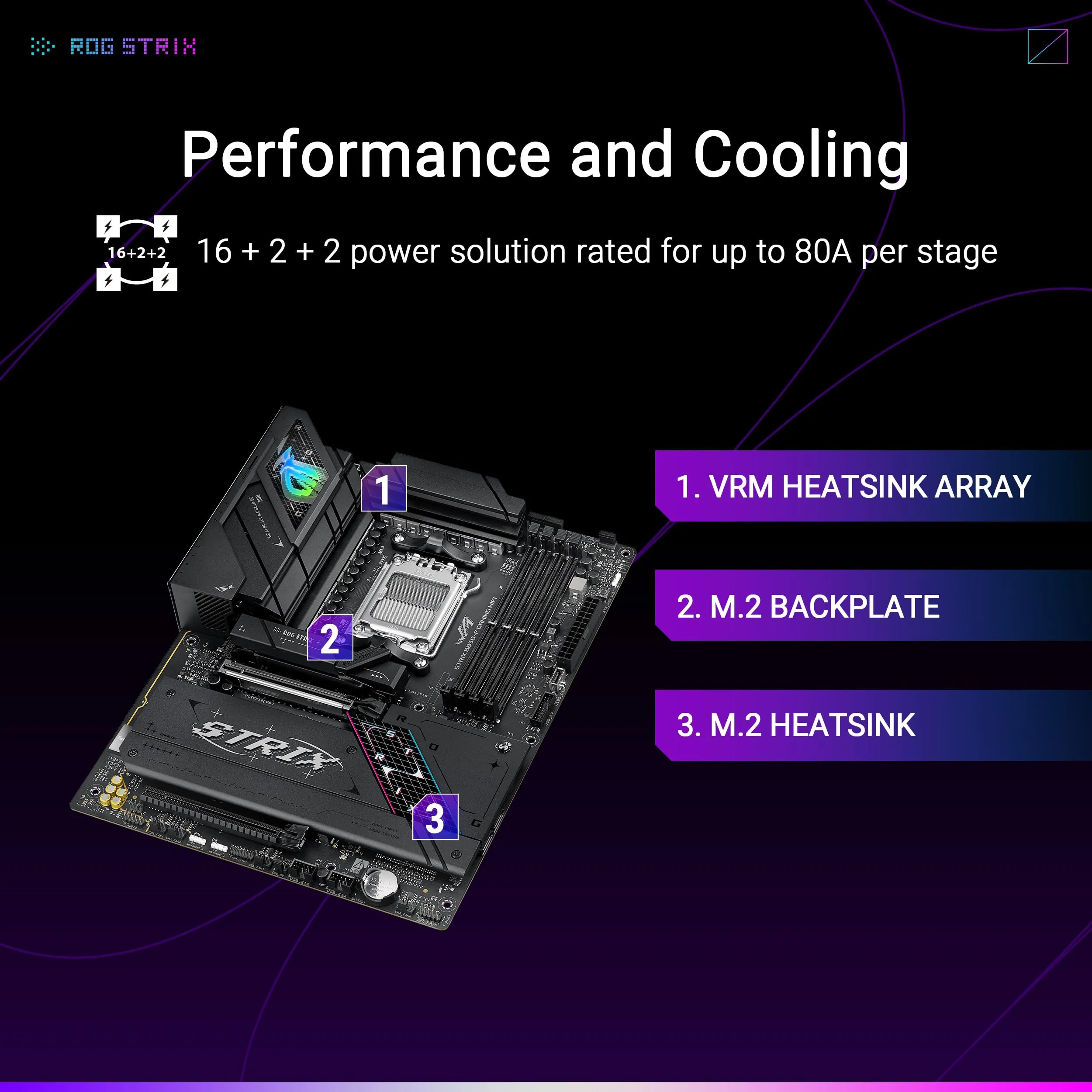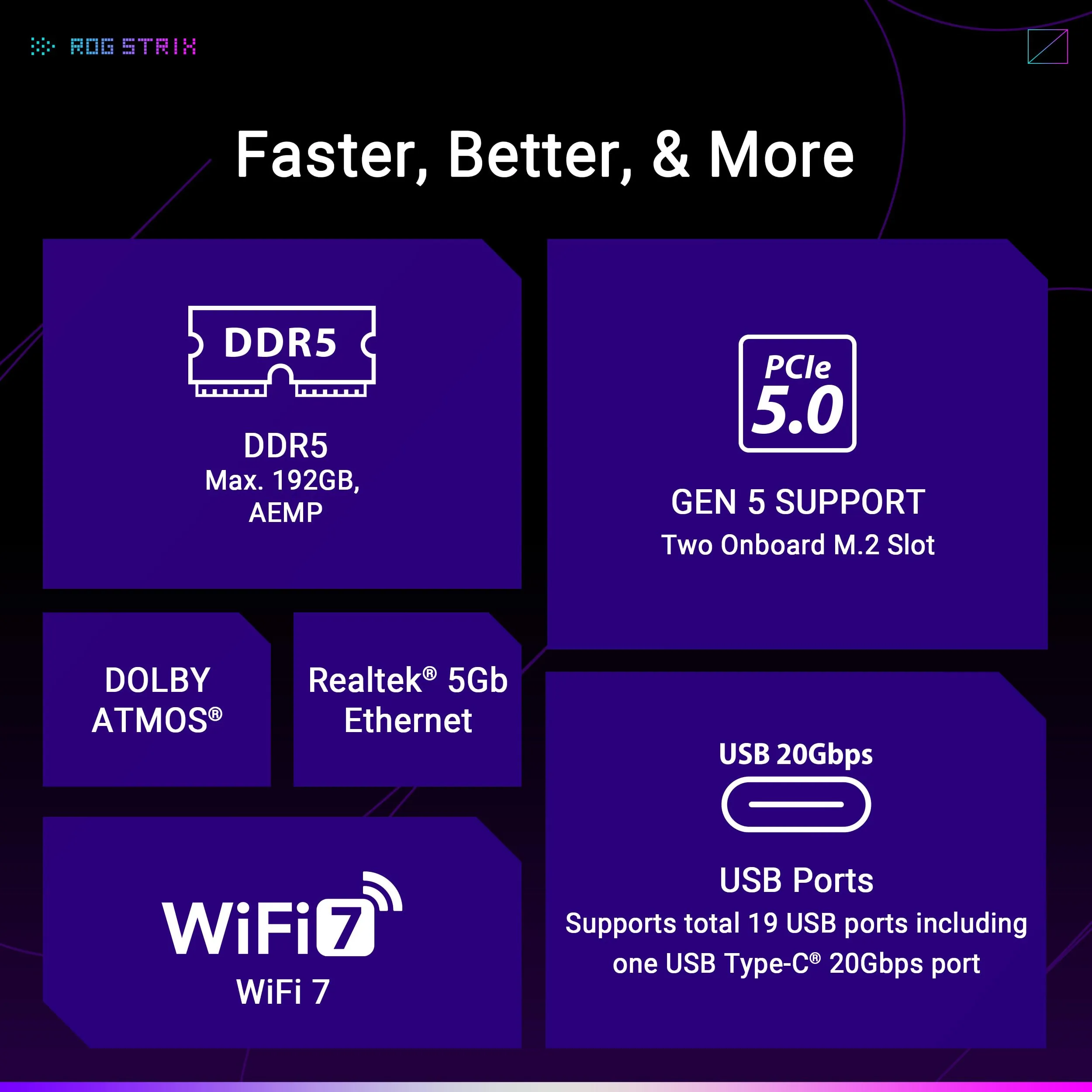 The ASUS ROG STRIX B850-F GAMING WIFI is a premium ATX motherboard designed for gamers and PC enthusiasts. It features a robust 16+2+2 power stage design and supports the latest AMD AM5 architecture, ensuring top-tier performance. The motherboard is equipped with DDR5 support for enhanced memory speeds, WiFi 7 connectivity for lightning-fast online experiences, and multiple M.2 slots for high-speed storage options.