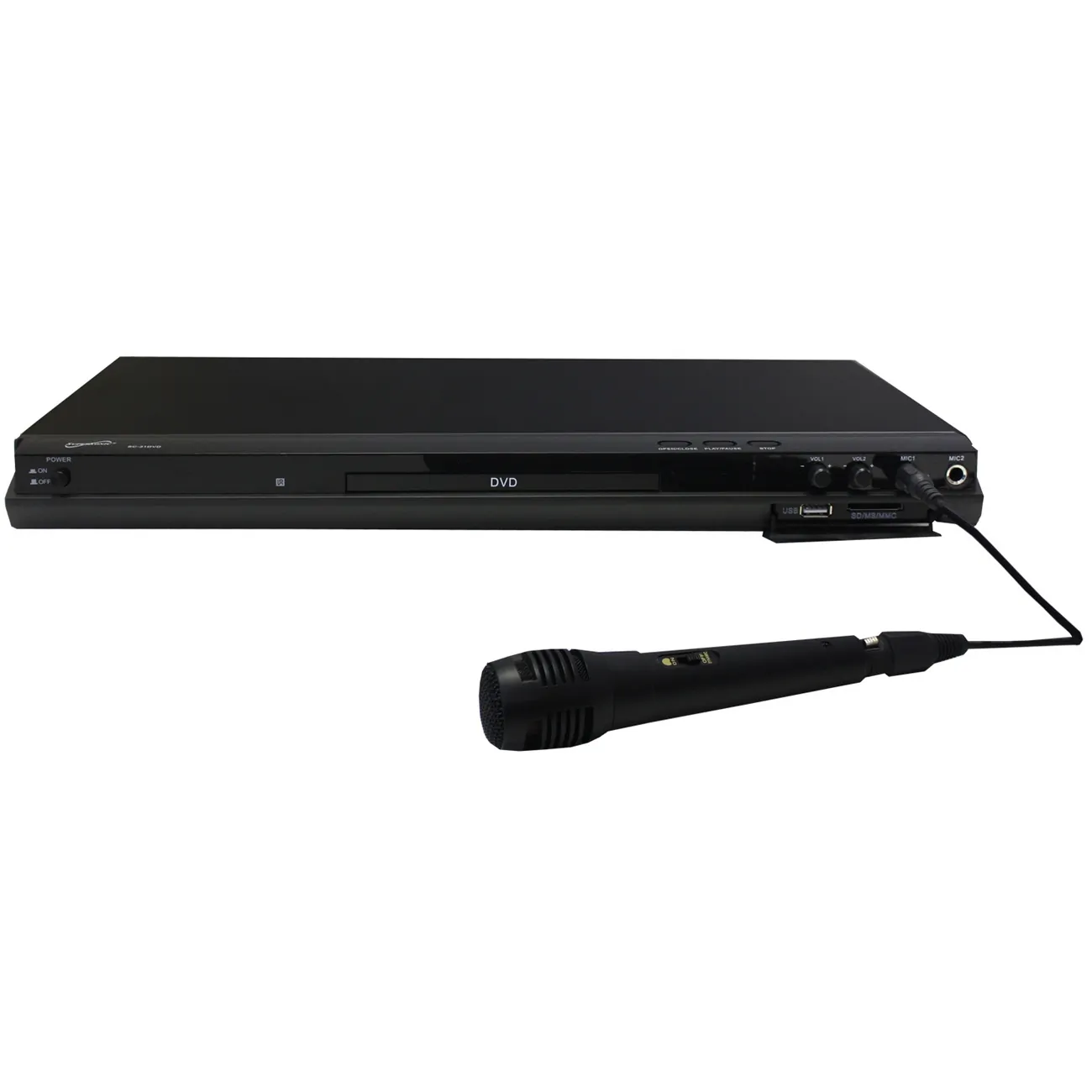Supersonic 5.1 channel DVD with 1080P up conversion. 5.1 Channel Audio Player for Surround Sound Systems. Plays DVD/DVD-R /CD/CD-R/CD-RW/JPEG/ MP3 Formats. HDMI Output 1080p: Converts Your Videos to 1080p HD Resolution. USB/SD/MMC/MS Input: Access Your Digital Media Directly From USB/SD Cards. AC-3 Digital Decoder. Convenient Front Panel and On-Screen Display. Multiple Angle/Language Subtitles. Coaxial Digital Output. 2 Karaoke Microphone Jacks Inputs (1 Mic included). Power Supply 100-240V AC, 50/60Hz. AV Cables (included). Remote Control (included). ETL Approved. Black
