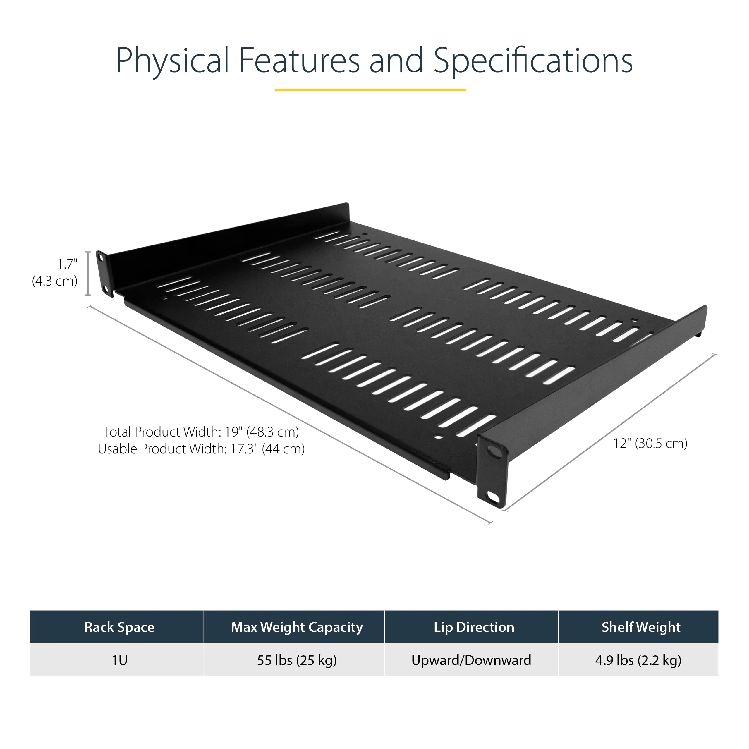 The 12-Inch Vented Server Rack Cabinet Shelf is designed to provide reliable support for your equipment in a server rack environment. With a 1U height, this shelf allows for optimal air circulation, helping to keep your devices cool and operational.