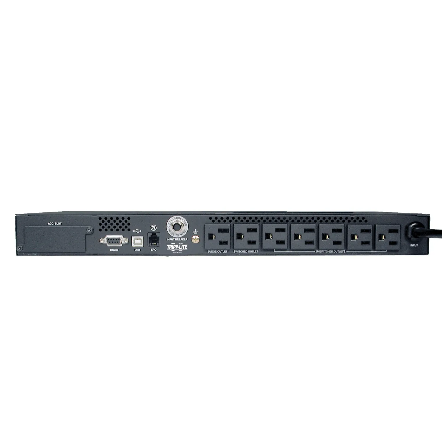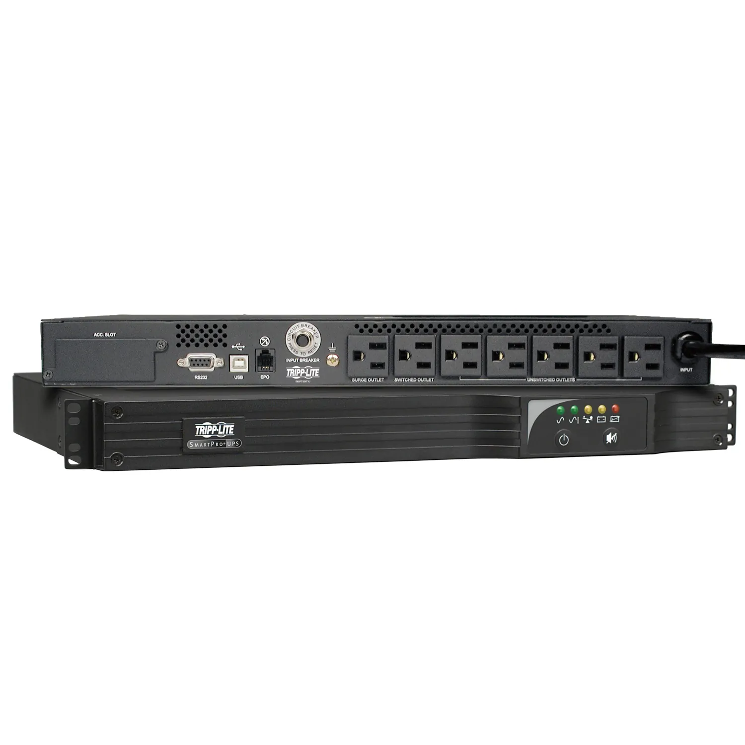 Voltage compatibility - 120V AC Frequency compatibility - 60 Hz Output volt amp capacity (VA) - 500 , Output watt capacity (watts) - 300 , Output nominal voltage - 120V AC Output voltage regulation - LINE MODE---Sine wave line voltage 120V (below 15 percent or above 13 percent) , BATTERY MODE---Inverter output regulated to 60Hz above or below 1Hz Outlet quantity / type - 7 NEMA 5-15R Customized load management receptacles - Includes single-outlet load bank that supports automated load shedding and remote reboot on demand of locked network devices. Configurable via PowerAlert software to automatically switch off optional loads, like monitors, to increase available runtime for servers and other critical devices. Overload protection - Via 15A input breaker Maximum input amps - 5.6A Input connection type - NEMA 5-15P Input cord length - 10 ft., 14 gauge, Black Recommended electrical service - 15A 120V BATTERY - Full load runtime---5 minutes (500VA) , Half load runtime---17 minutes (250VA) , DC system voltage---12 VDC , Typical battery lifespan---3-6 years, depending on usage , Battery recharge rate---2-4 hours to 90 percent Replacement Battery Cartridge - RBC62-1U Voltage regulation description - Line interactive voltage regulation system corrects brownouts as low as 90 volts back to usable 120V nominal levels Brownout correction - Input voltages between 90 and 108 are boosted by 14 percent Front panel LEDs - 5 front panel LEDs - green POWER LED, green AVR LED, 3-color BATTERY CHARGE LED, 3-color OUTPUT LOAD LEVEL LED, red BATTERY WARNING LED. Alarms - Audible alarm warns of power failure, overload, UPS fault and low battery conditions Switches - Includes 2 front panel mounted push-button switches for system enable, self-test and alarm cancel functions AC surge suppression - 480 joules AC suppression response time - Instantaneous