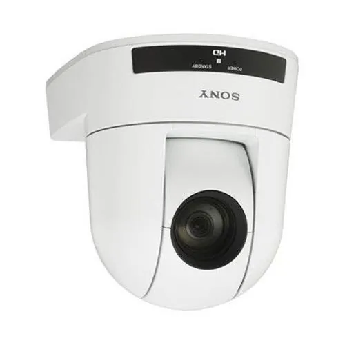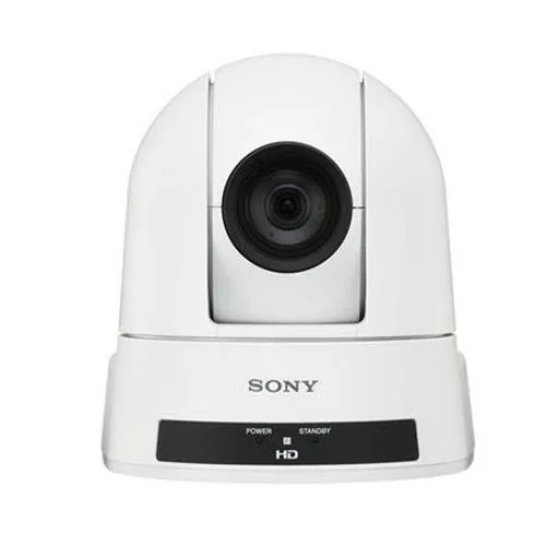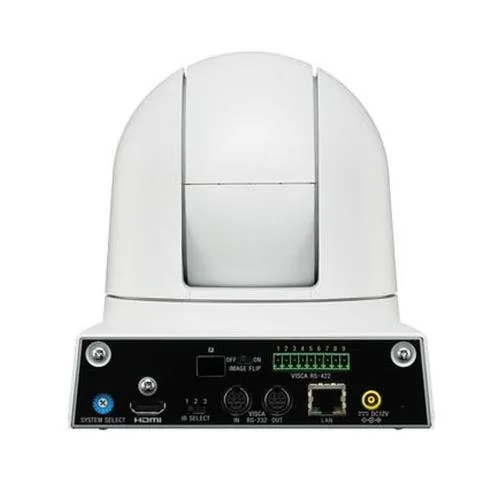 The camera features remote control capabilities, allowing users to adjust the angle and zoom settings effortlessly. Its sleek white design makes it a stylish addition to any environment.