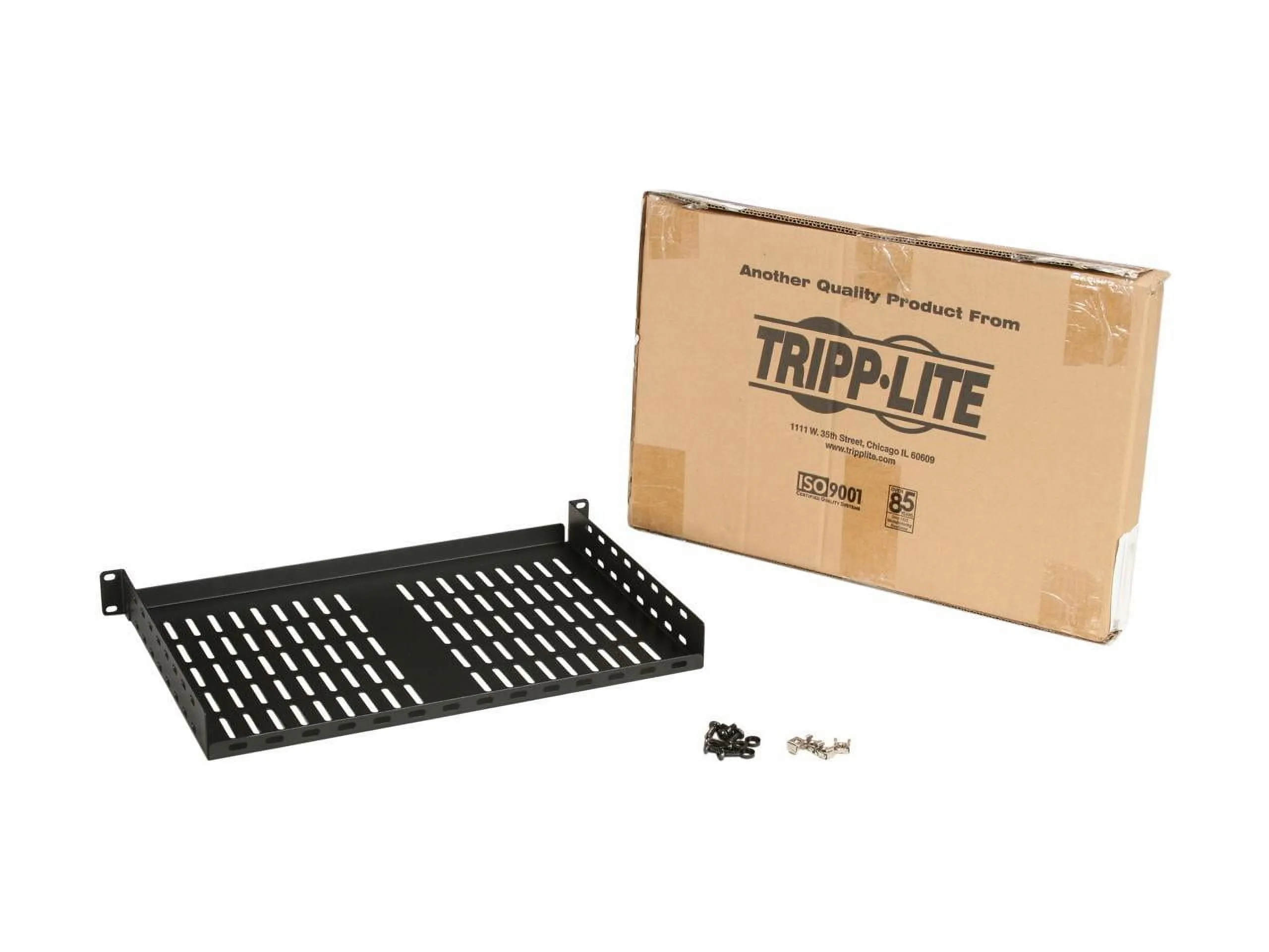 Tripp Lite SRSHELF2P1UBrand NewProduct # SRSHELF2P1UFixed Shelf, 1U Cantilever mount, Cold rolled steel with black finish. Required mounting hardware included. Supports up to 40 lbs. Use two shelves back to back to create a deep fixed shelf in 2POST racks. SRSHELF2P1U Features: Material: Cold-rolled Steel (CRS) Maximum Weight Capacity: 40 lb Rack Height: 1U Green Compliant: Yes Green Compliance Certificate/Authority: RoHS