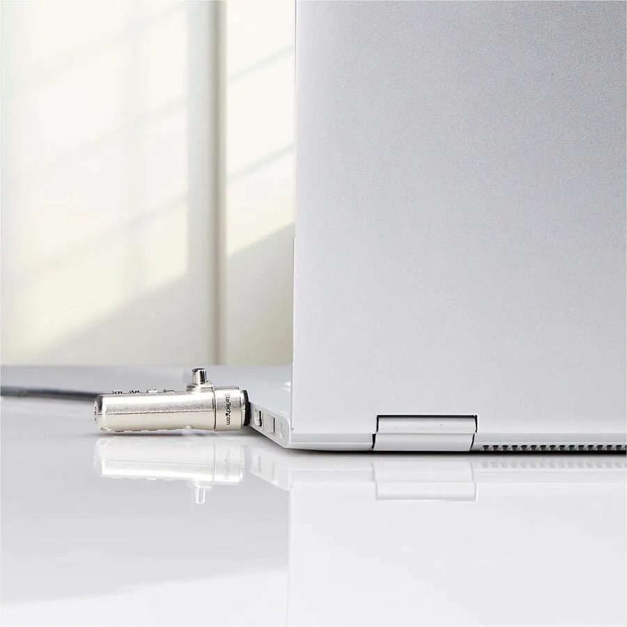 Ultra slim laptop lock compatible w/Kensington style K-Slot; 6.6ft (2m) anti-theft cut-resistant cable - 4-digit code w/10000 possible combinations - Zinc-alloy body; Lock head rotates 360 - Compact design w/off-center tip enabling Ultrabook/laptop to lie flat - Cable lock w/robust 0.16-inch (4mm) carbon steel cable; Spacer near lock tip prevents scuffing - Use in combination with LTANCHOR/LTANCHORL for enhanced computer and desk peripherals security