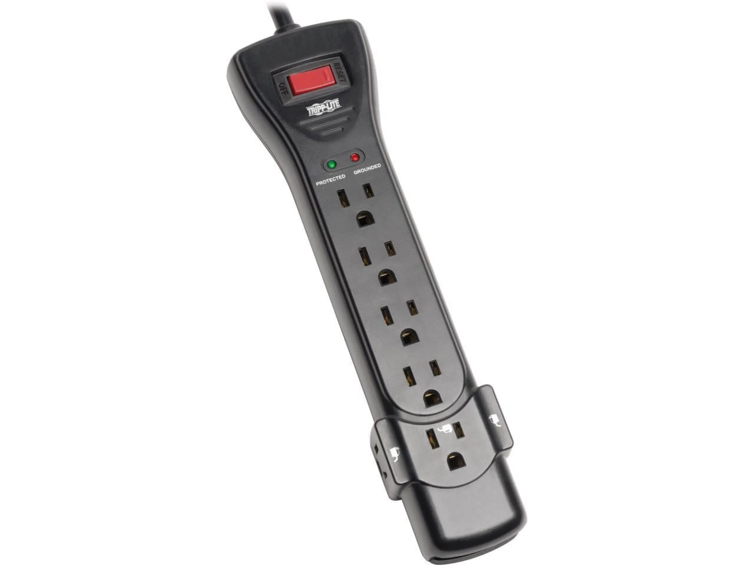 - TrippLite SUPER7 surge suppressor- 7 Outlets- 7 ft. cord- 2350 Joule rating- $75,000 Ultimate Lifetime Insurance through manufacturer (USA, Puerto Rico and Canada only)- Space-saving right-angle plug- Diagnostic LEDs- EMI/RFI noise filtering- Can accommodate up to 3 transformers without blocking remaining outlets- Diagnostic LEDs indicate protection present and ground present- Keyhole supports for wall mounting- Lifetime product warranty with manufacturer- Ideal for personal computers, CAD/CAM/CAE workstations, network nodes, fileservers, point-of-sale terminals, audio/visual devices, and moreTPLSUPER7