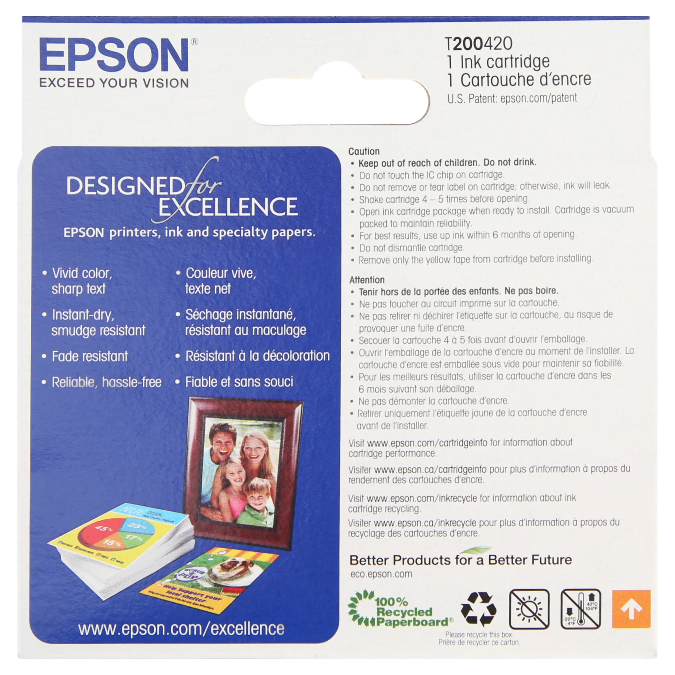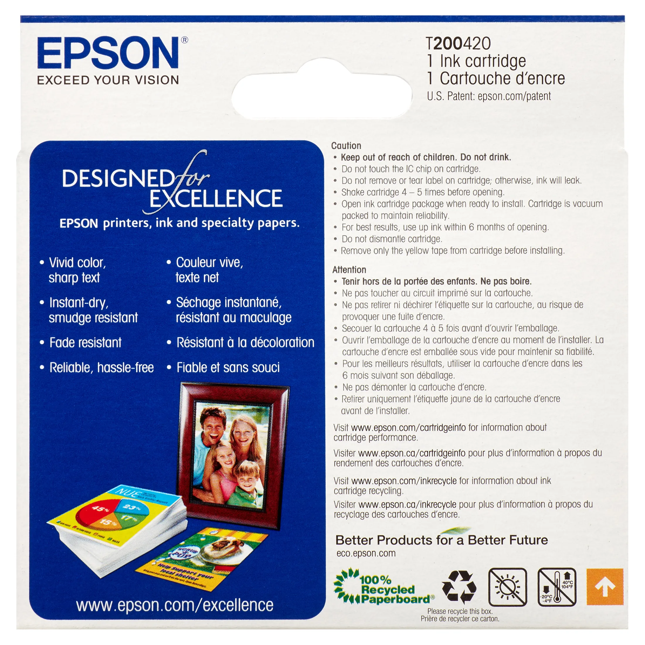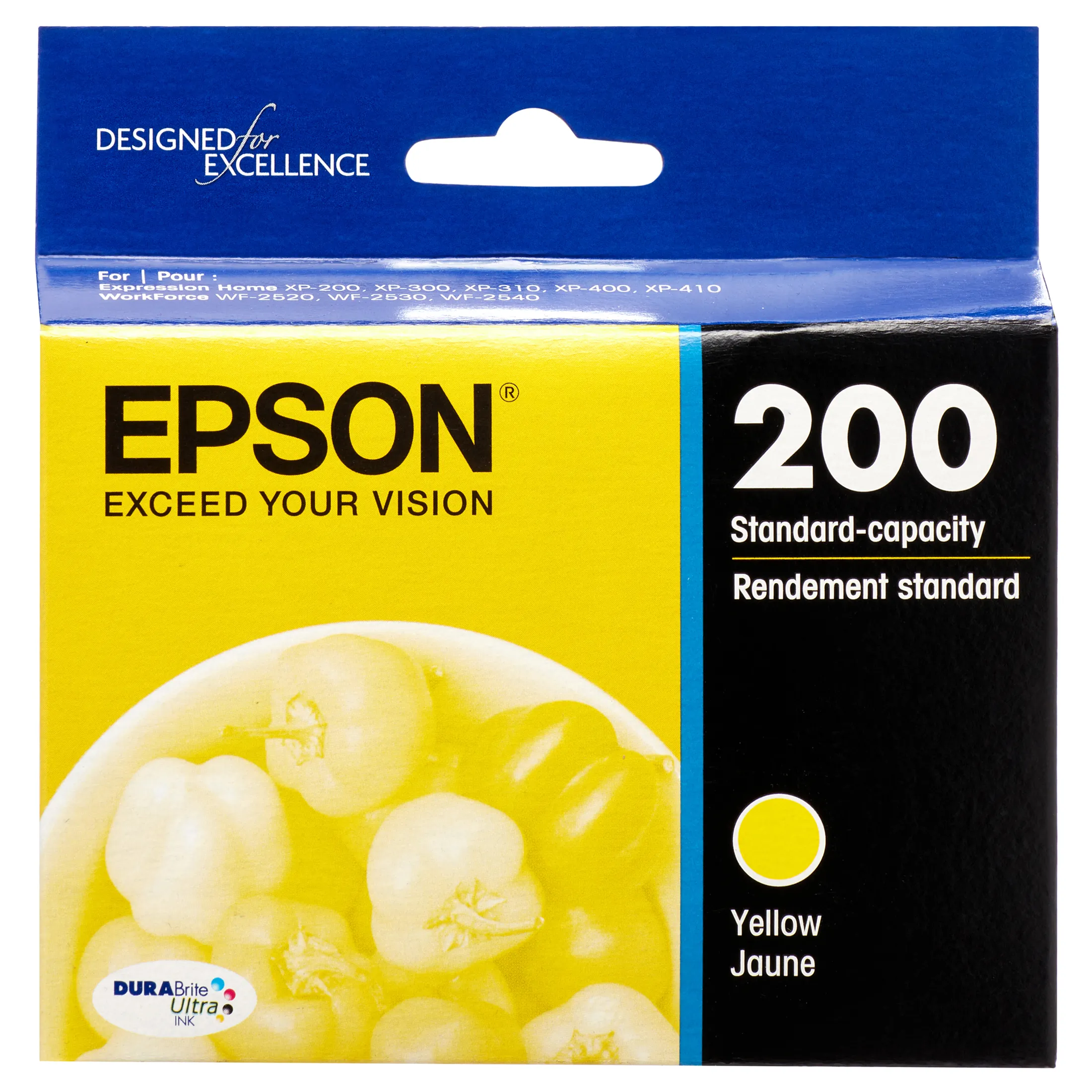 Standard-capacity ink cartridge is designed for use with Epson Expression Home XP-200, XP-300, XP-310, XP-400, XP-410 color all-in-one; WorkForce 2520, 2530 and 2540. Ink cartridge delivers brilliant results and a smart value. Replace only the color you need with individual ink cartridges. Best of all, only one set of cartridges is needed to print amazing documents and great photos. There's no need to spend additional money on specialized cartridges to print on either plain or photo paper. Epson's revolutionary DuraBrite Ultra Ink produces smudge-resistant, fade-resistant and water-resistant prints that look brilliant on both plain and glossy photo paper.